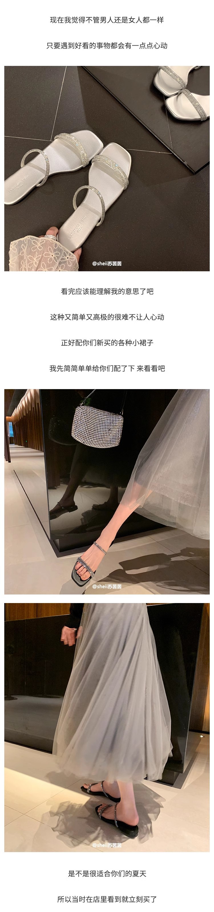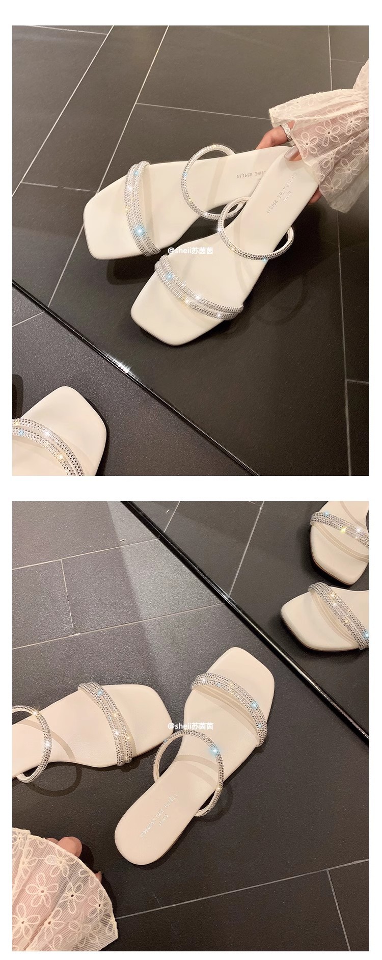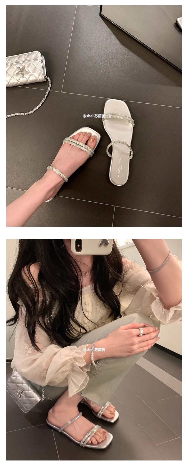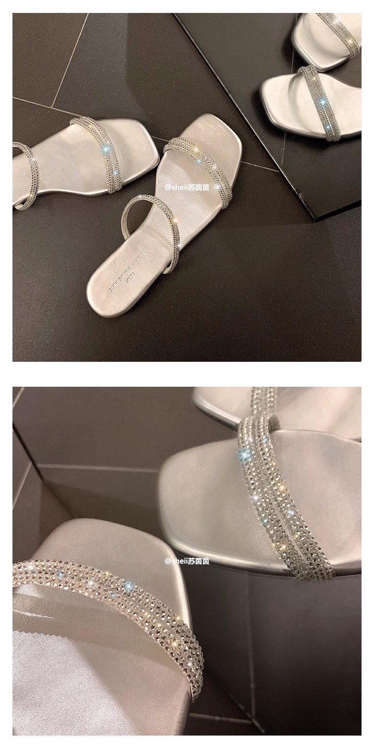 Brillante estrella de verano ~ nueva estrella plateada brillante cabeza cuadrada de diamante con zapatillas de fondo plano zapatillas de mujer frescas para usar