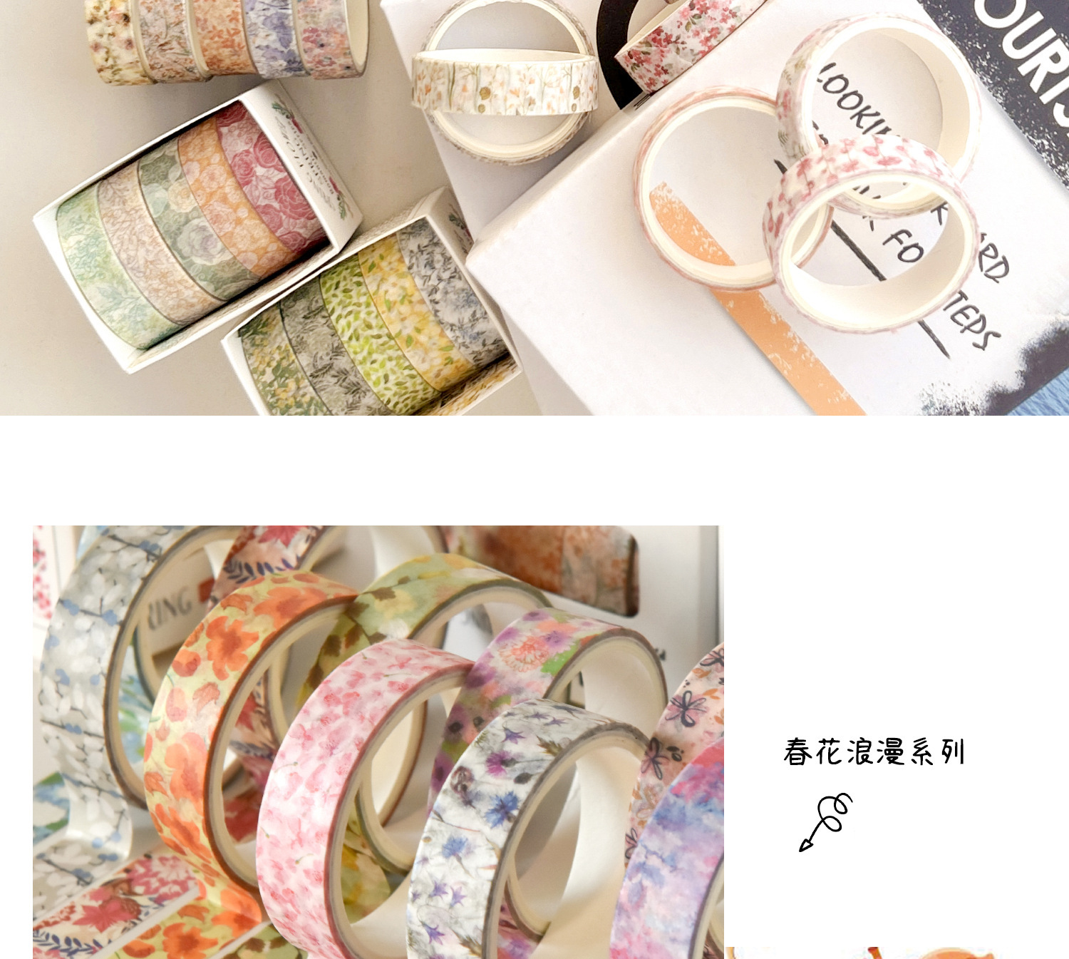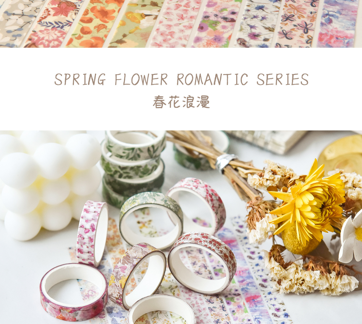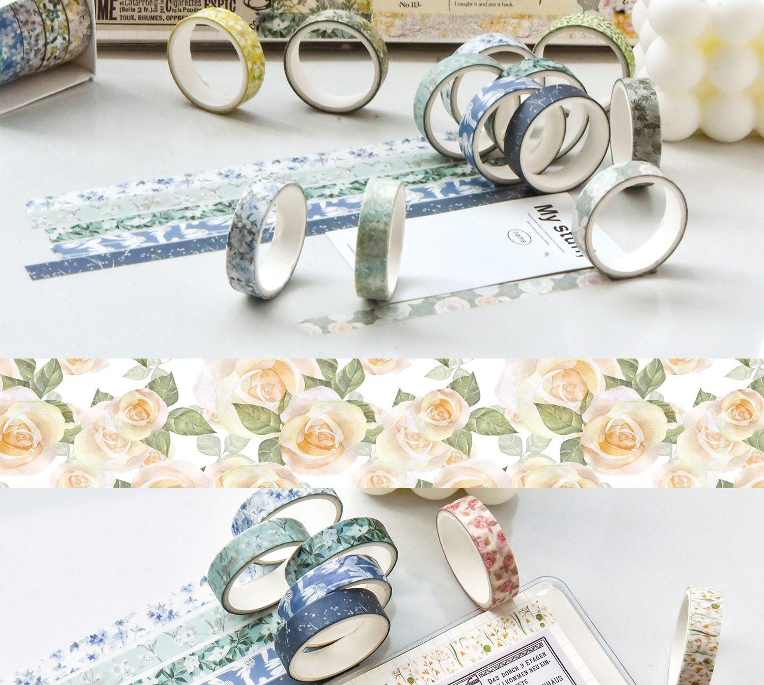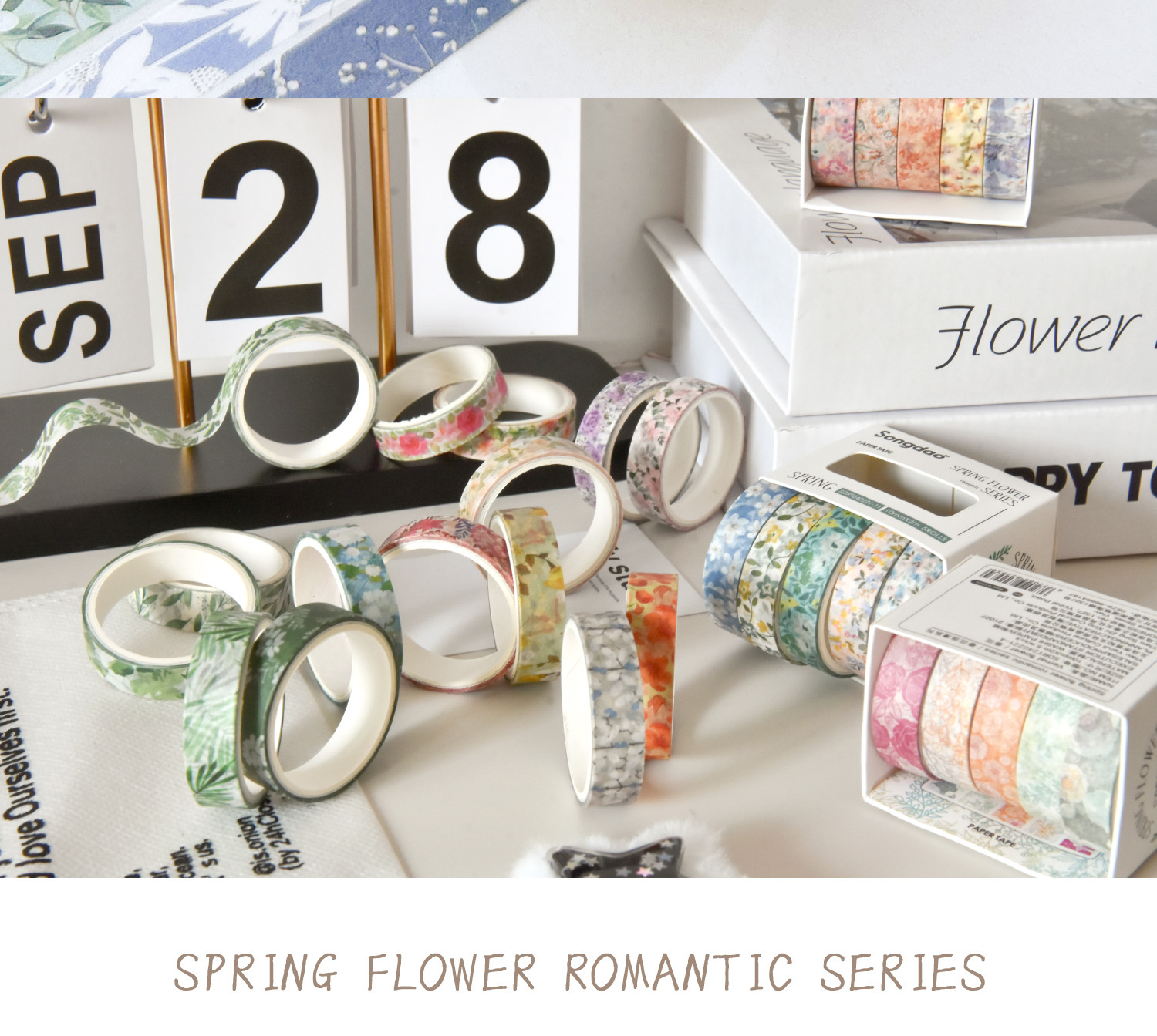 Flores de primavera, flores literarias románticas, flores frescas, flores pastorales, 5 rollos y cinta de papel, pegatinas de material de cuentas a mano combinadas