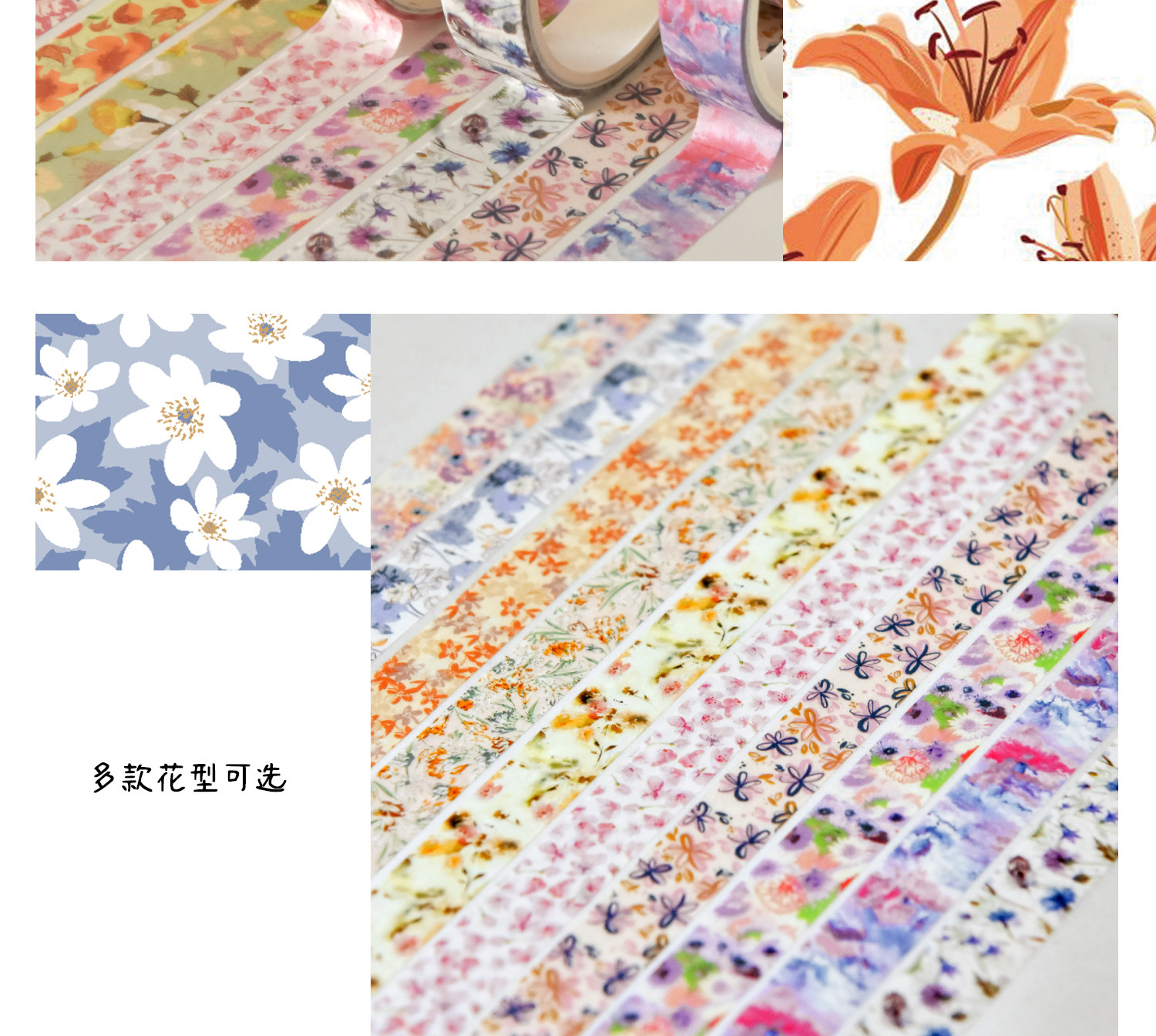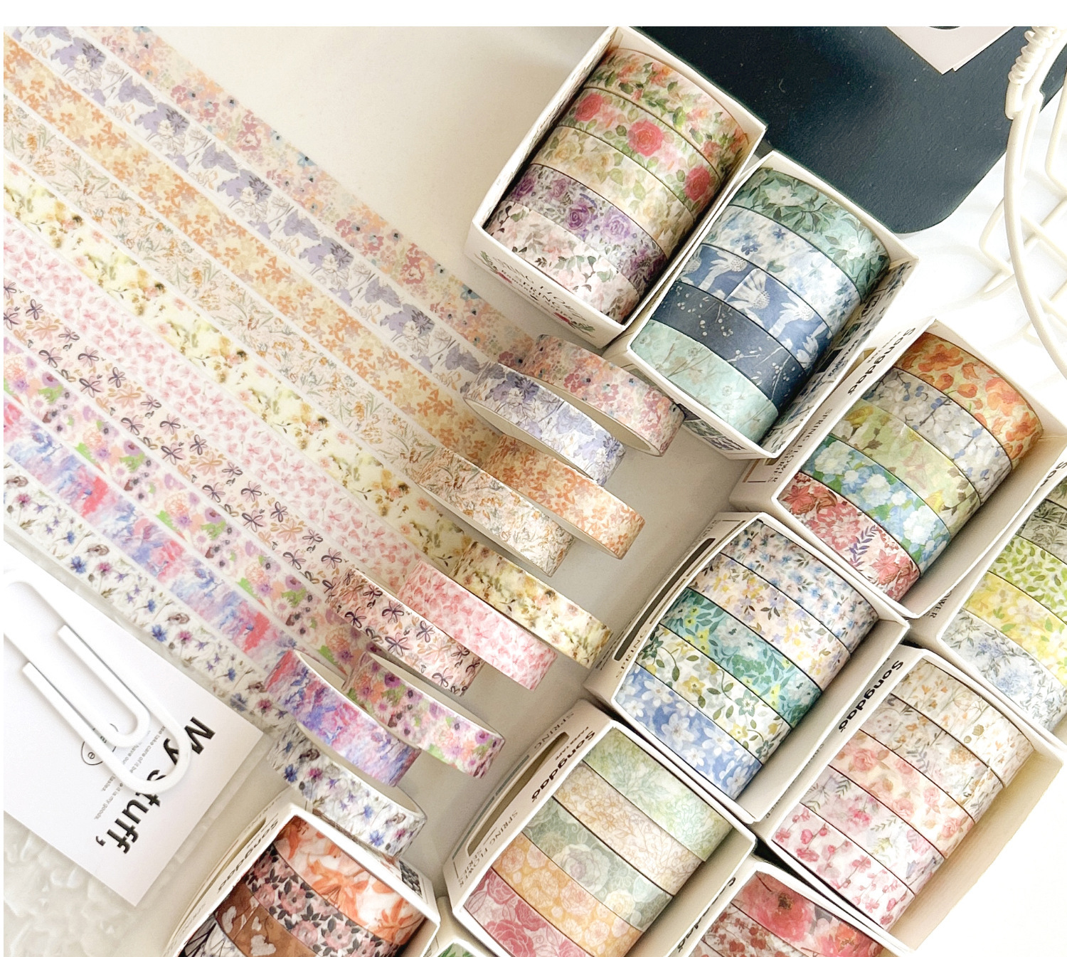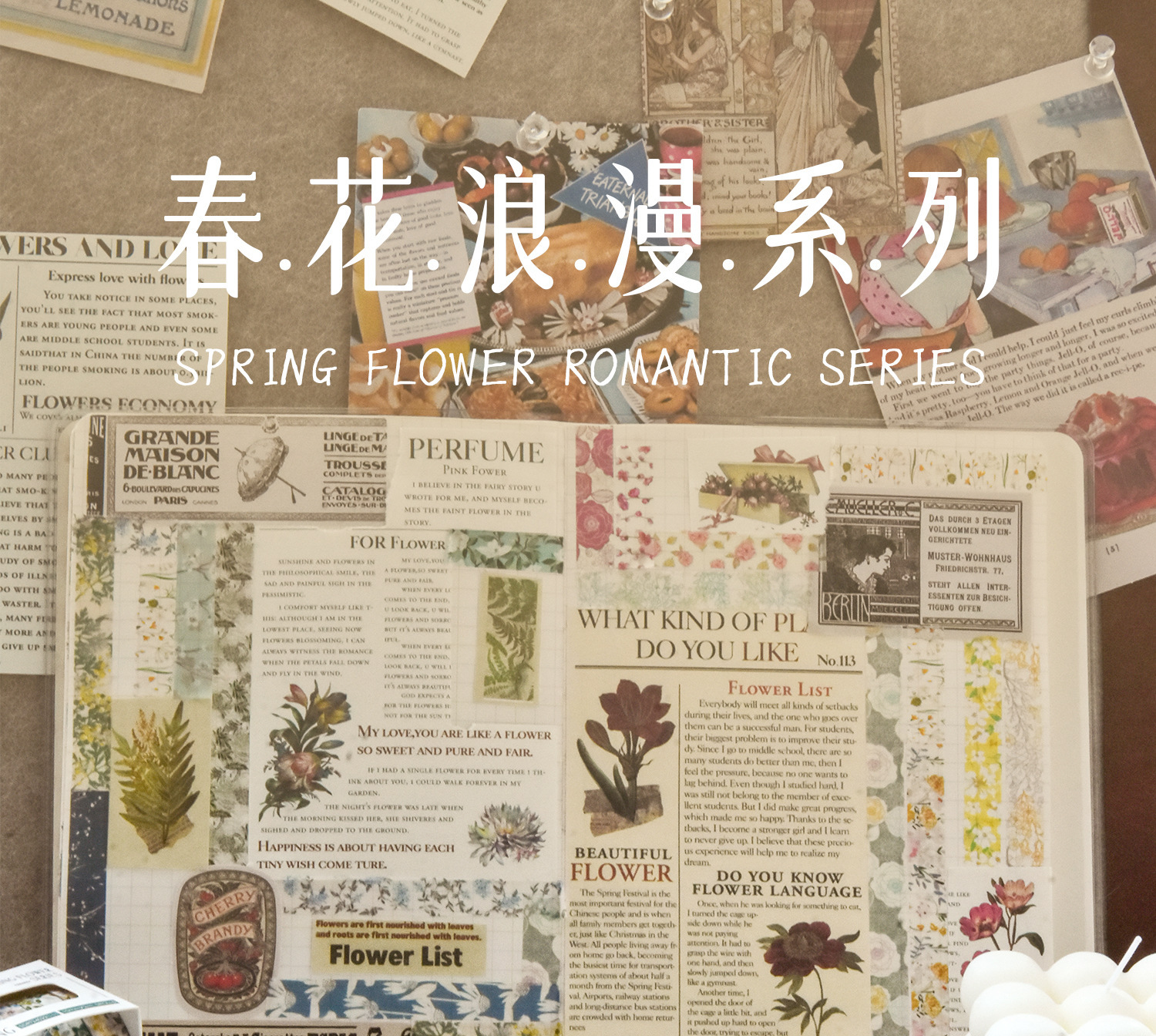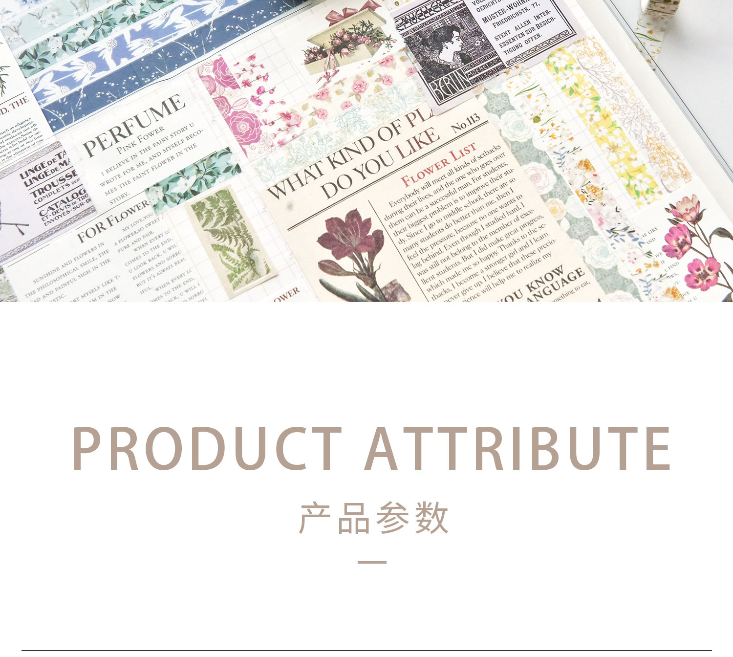 Flores de primavera, flores literarias románticas, flores frescas, flores pastorales, 5 rollos y cinta de papel, pegatinas de material de cuentas a mano combinadas