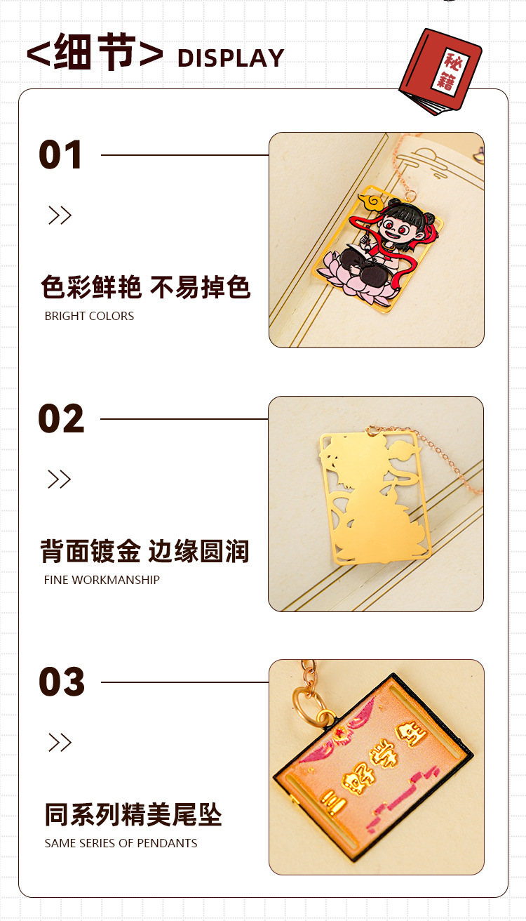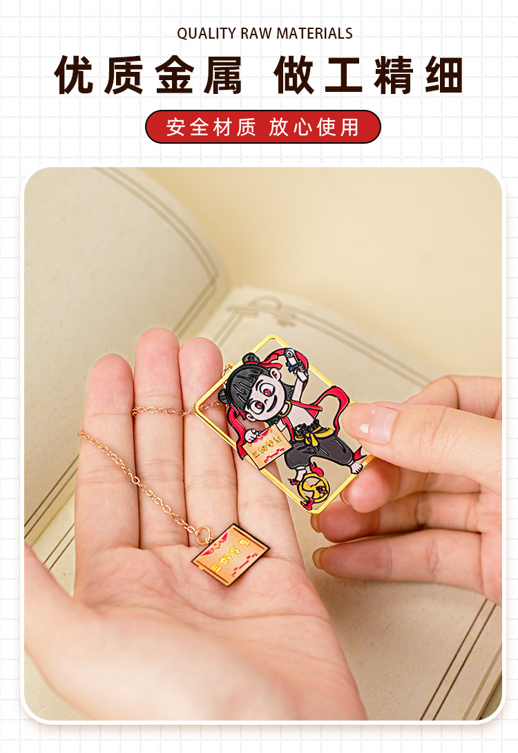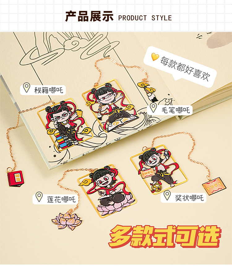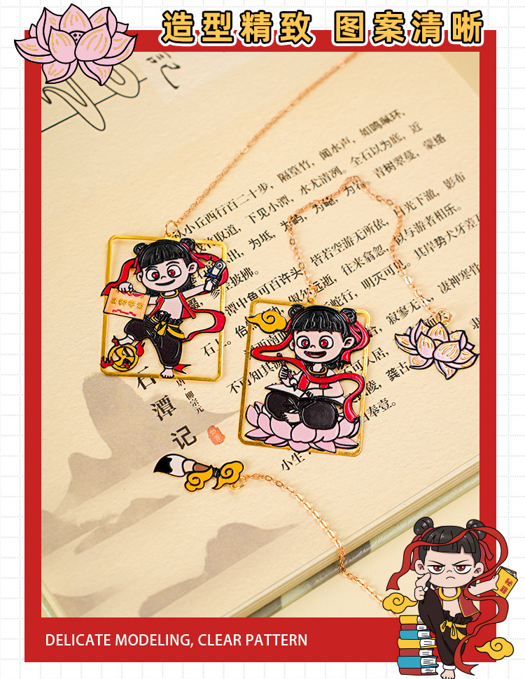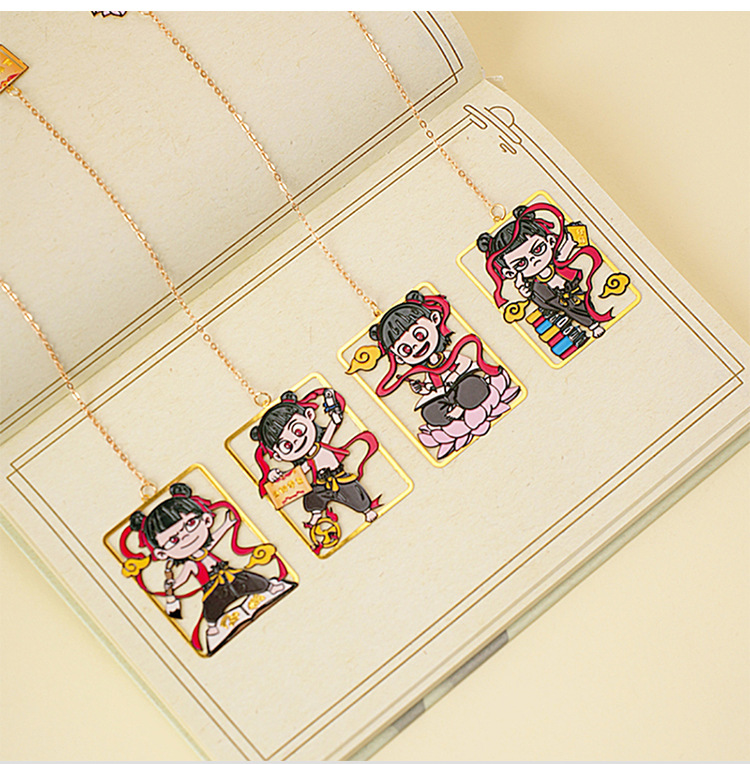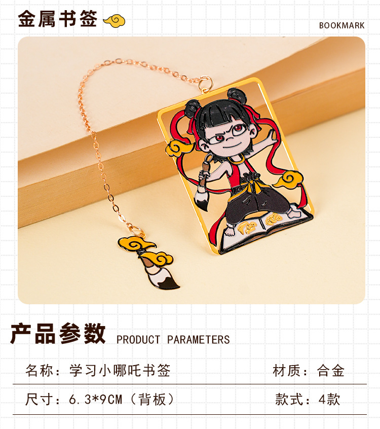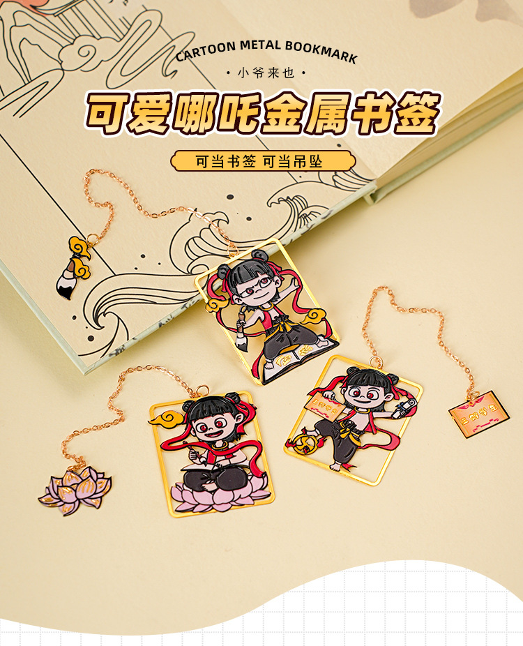 Nuevo marcador de metal de alto valor de Nezha lindo y exquisito colgante de dibujos animados creativo marcador de lectura de estudiante carpeta de página de libro