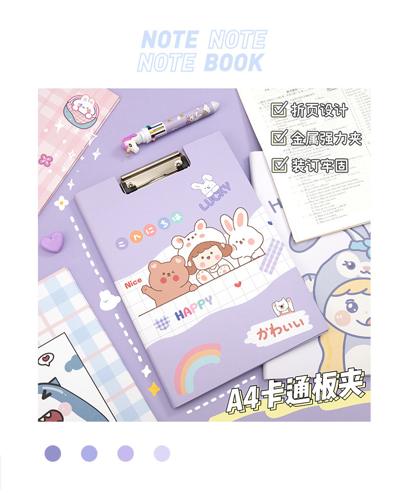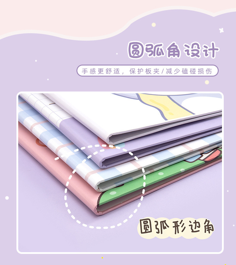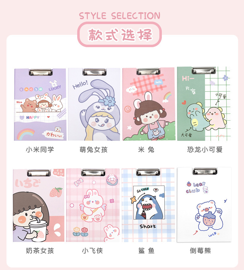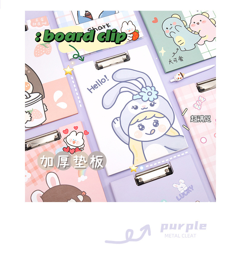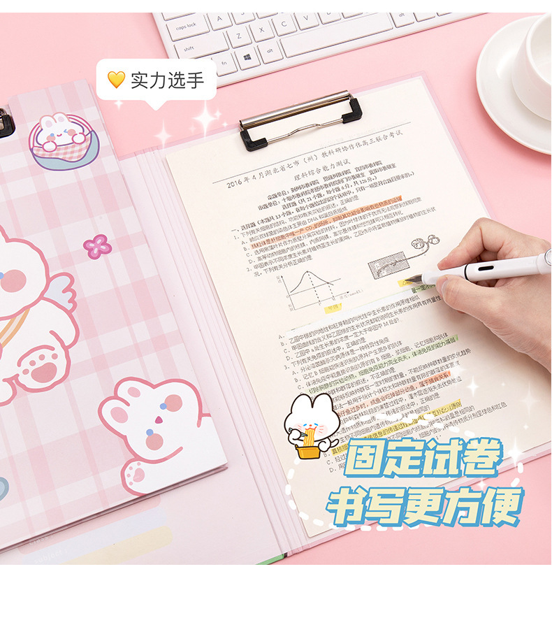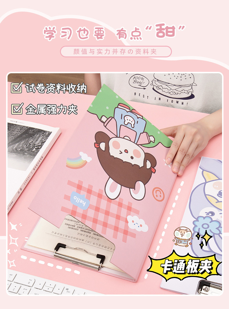Clip de almacenamiento de papel de escritura de estudiante de escuela primaria de dibujos animados de alta apariencia Linda carpeta A4 clip de tablero fijo