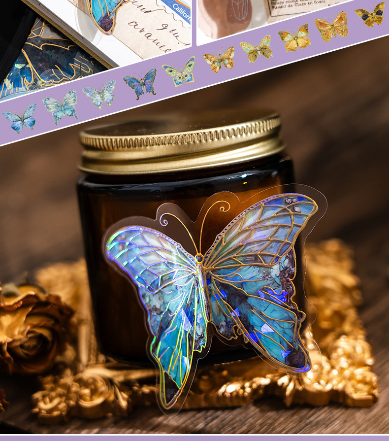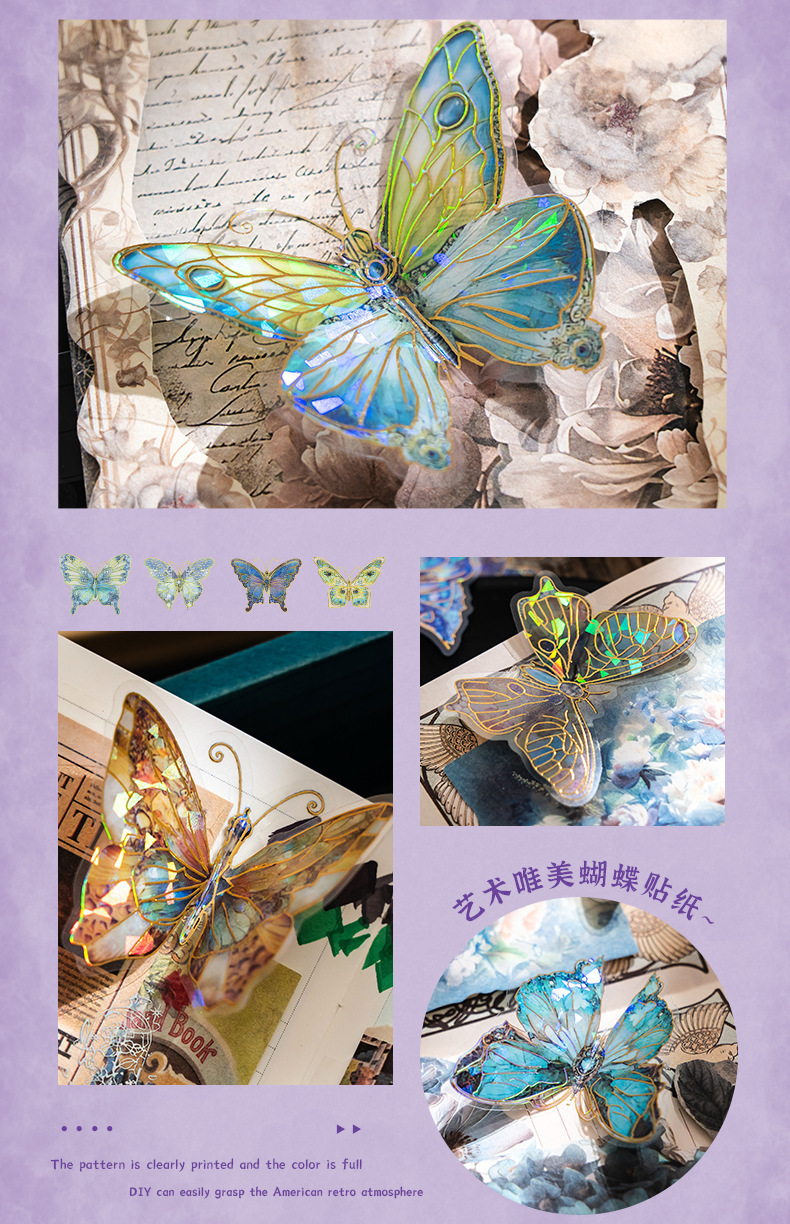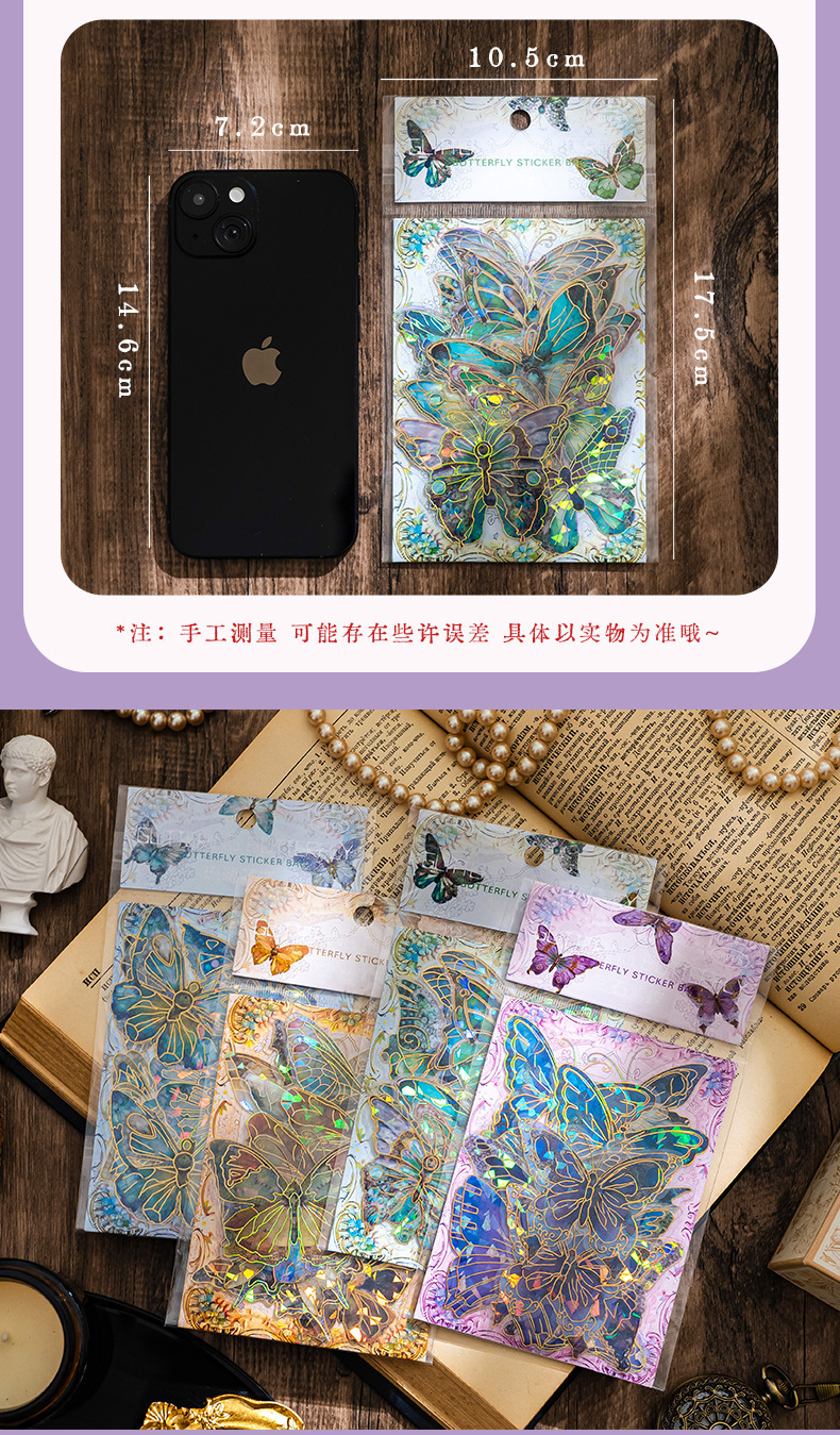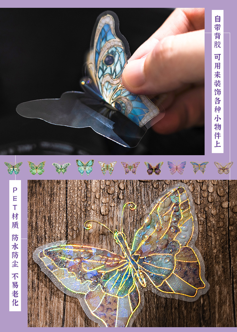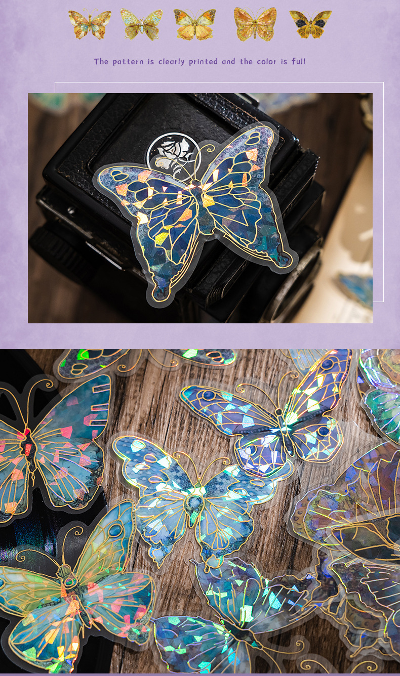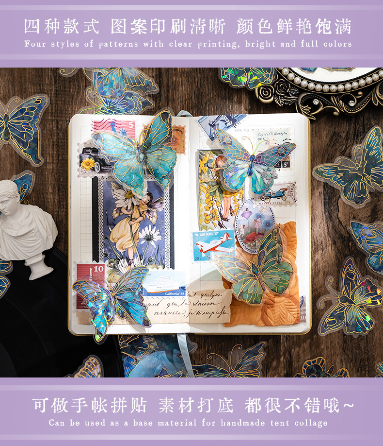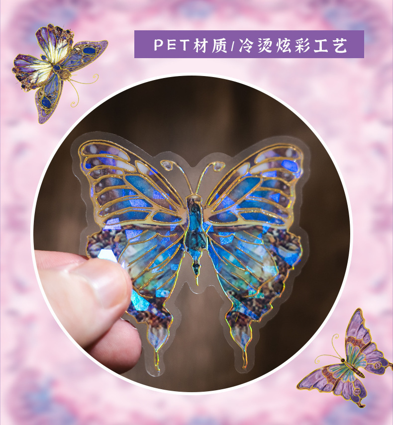 PET láser estereoscópico oro pegatinas bolsa mariposa retrógrada cuentas de mano tarjeta de flujo lino material cuentas de mano DIY pegatinas decorativas