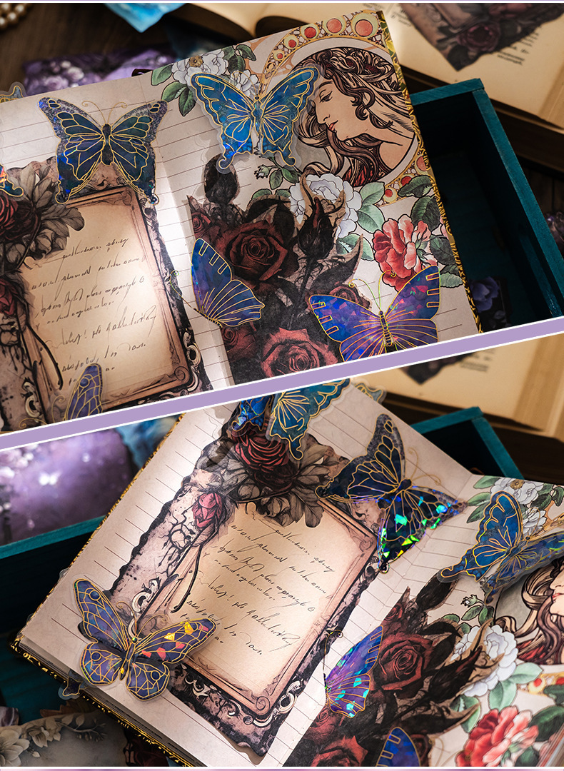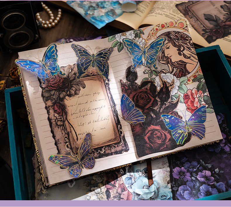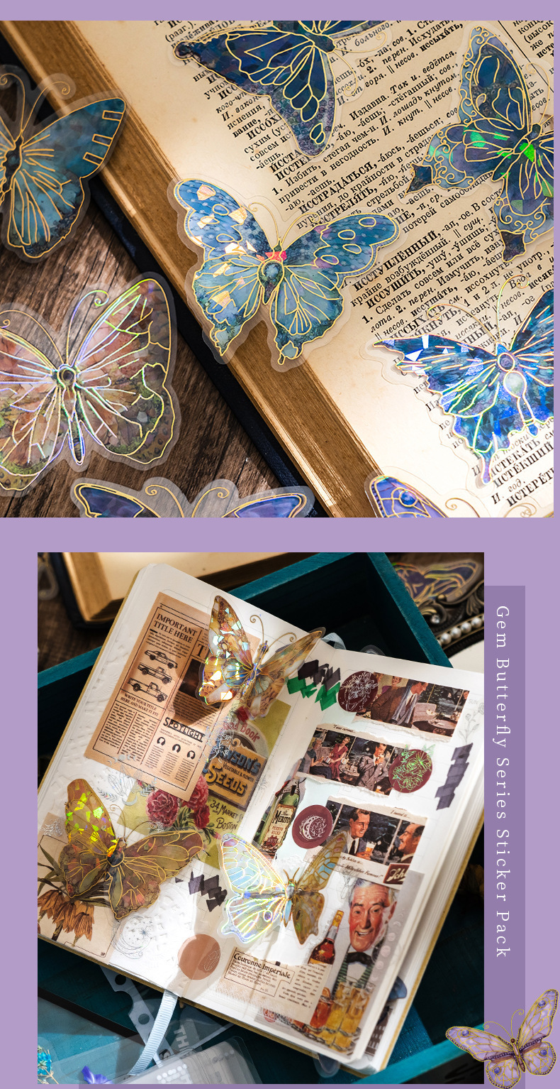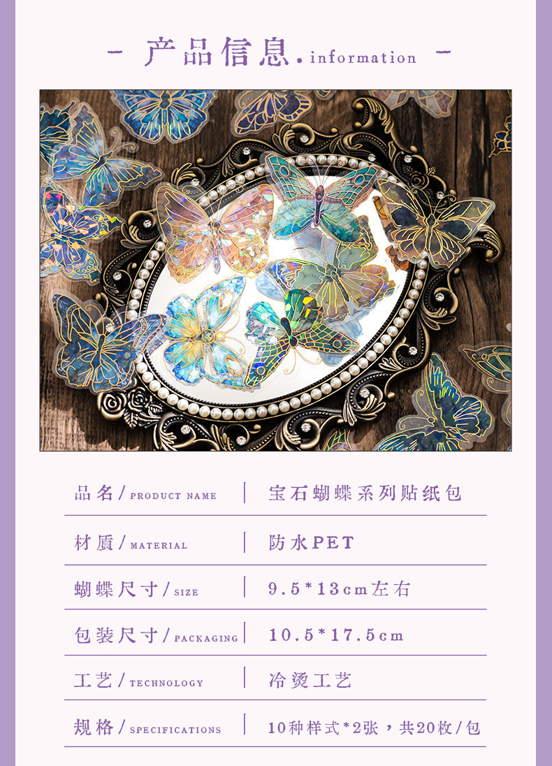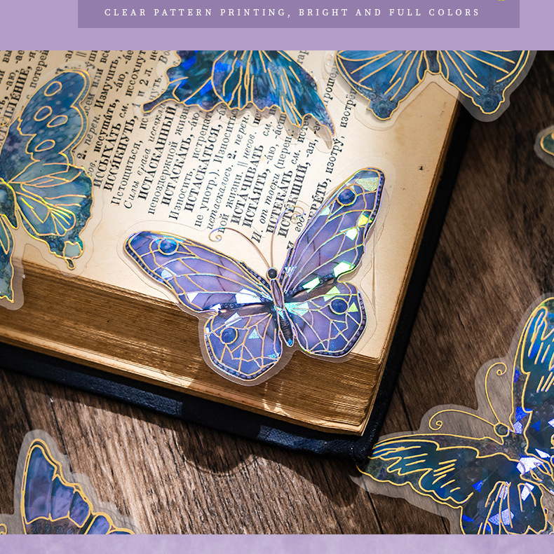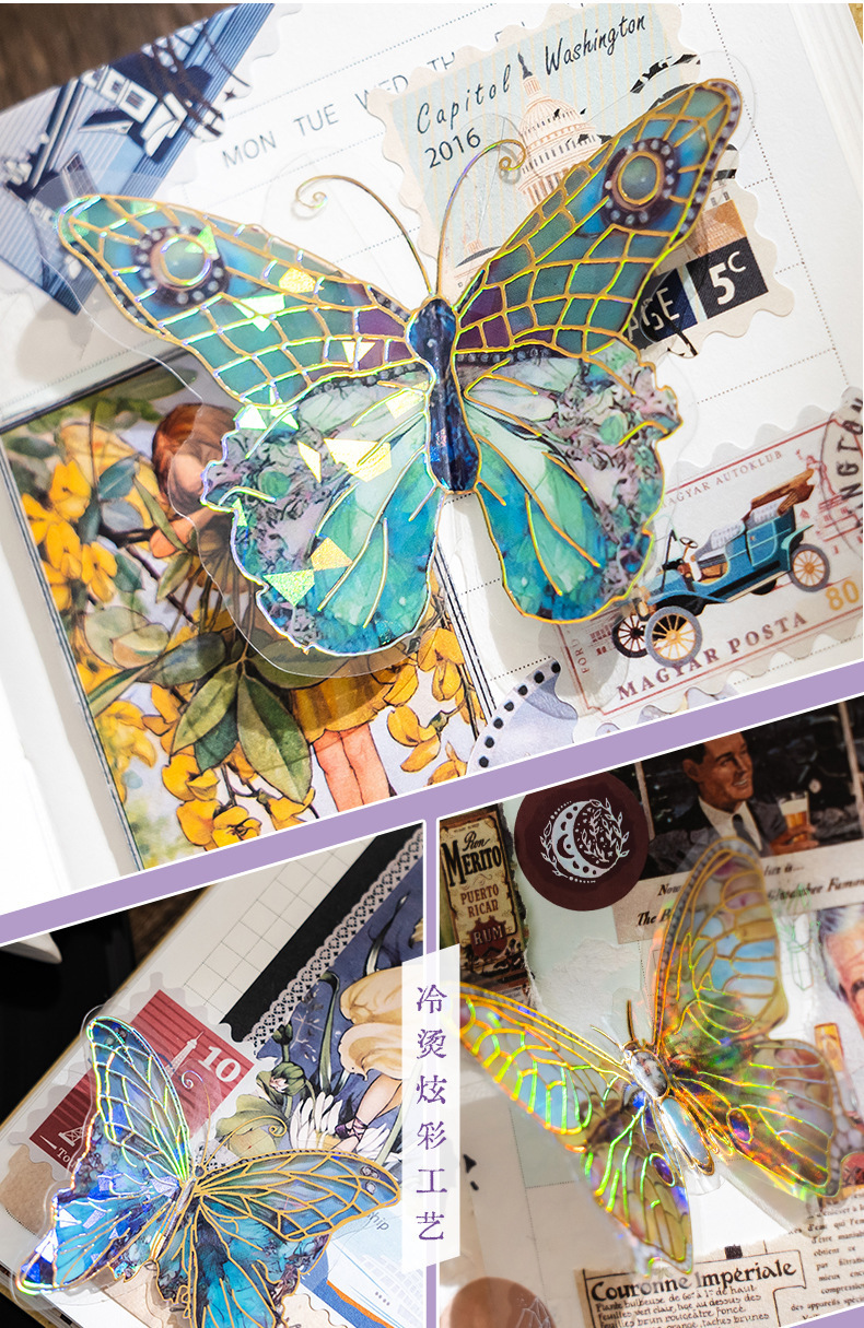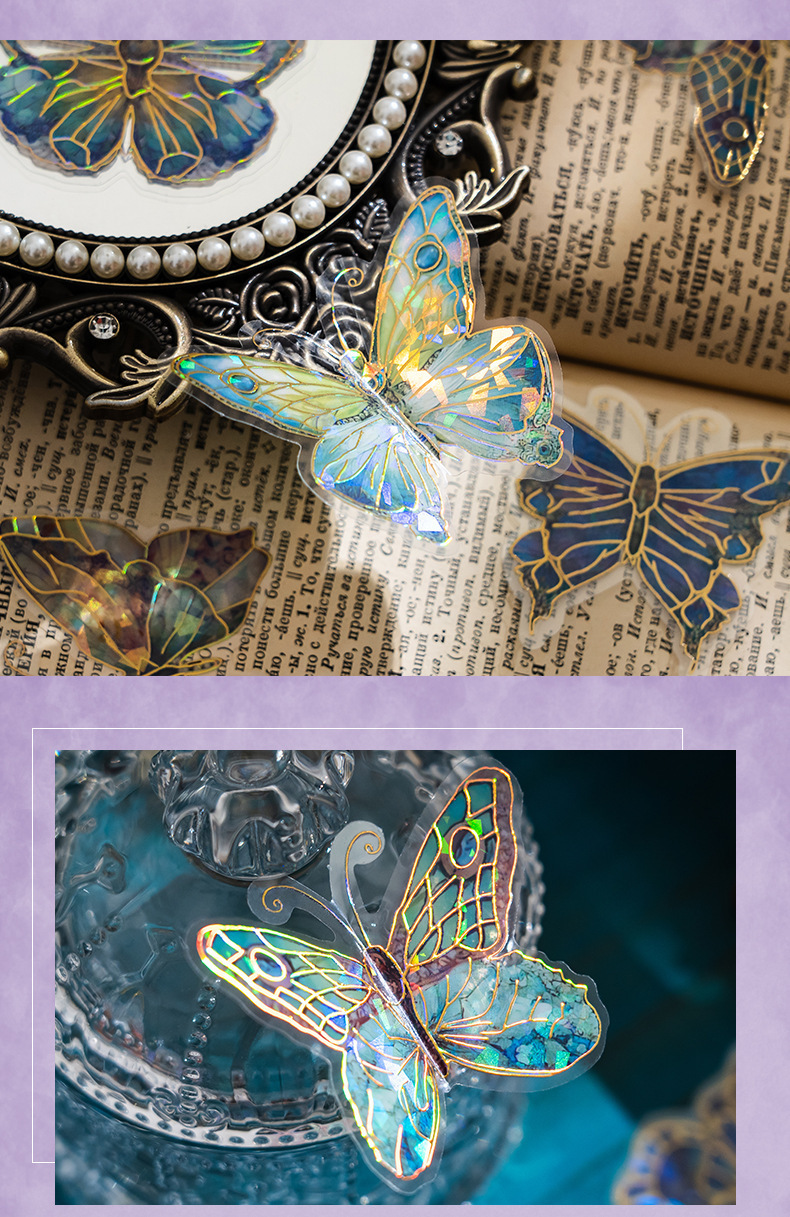 PET láser estereoscópico oro pegatinas bolsa mariposa retrógrada cuentas de mano tarjeta de flujo lino material cuentas de mano DIY pegatinas decorativas