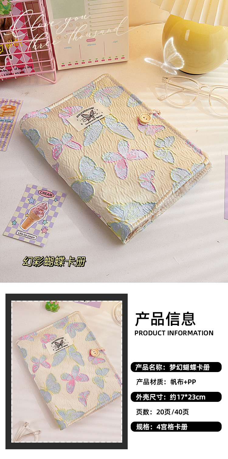 | Colores de la cubierta | Libro de cartas de mariposas de fantasía [incluidas 20 páginas interiores],A5 Dream Butterfly Hand Account [100 páginas interiores],Deflector de libro de tarjetas engrosado [1 hoja],4 páginas en la cuadrícula del palacio [20 hojas de seis hoyos] |
