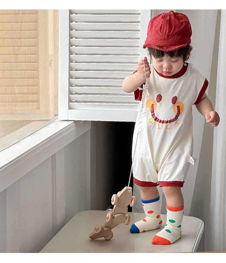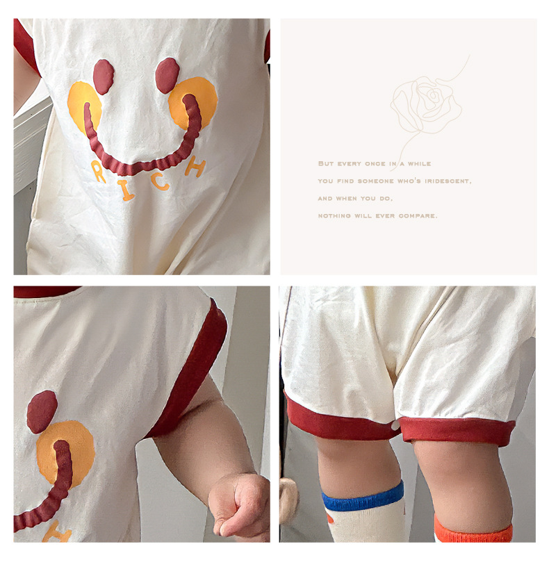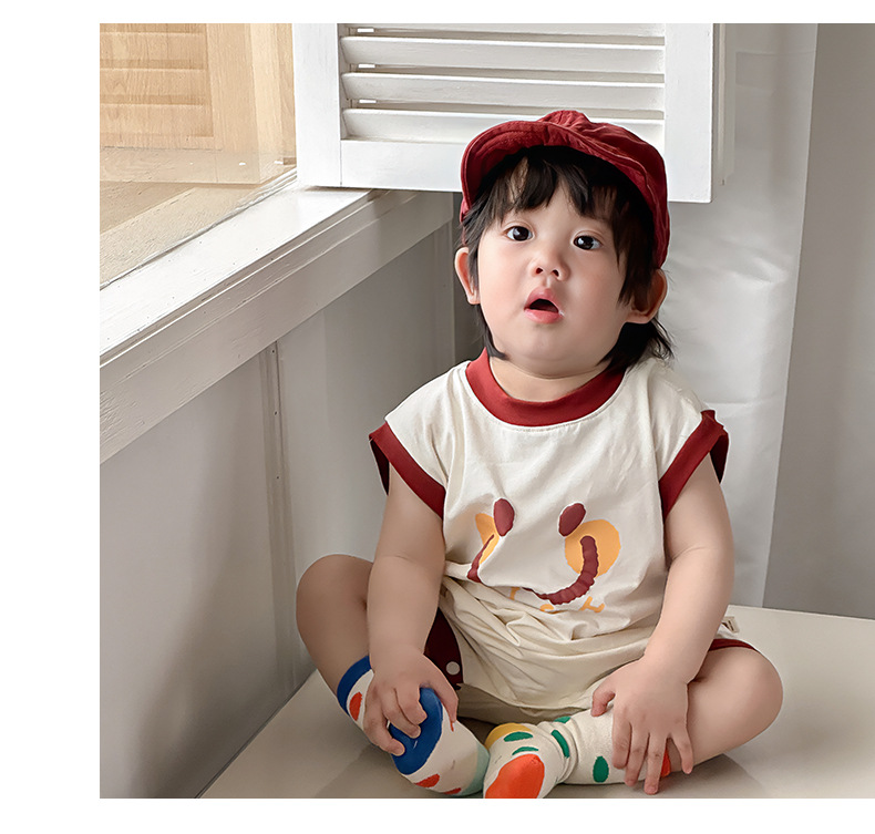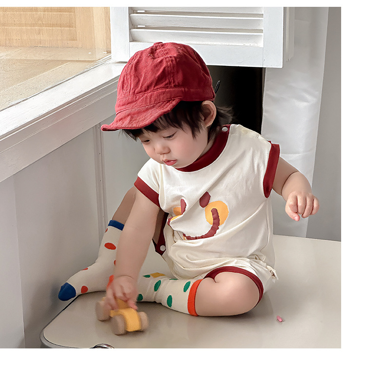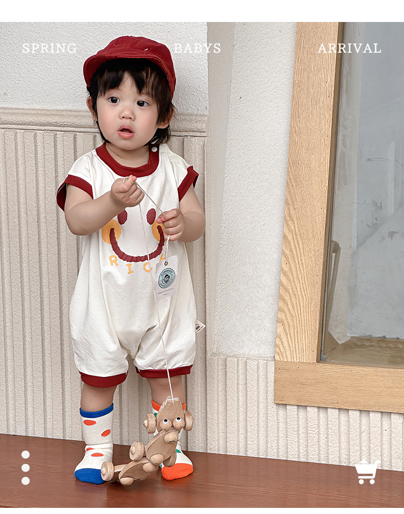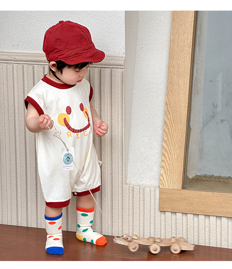 Estilo delgado de verano de estilo coreano, ropa de salida de clase, cara sonriente de dibujos animados, bebé de un año, cuello redondo sin mangas, mono casual