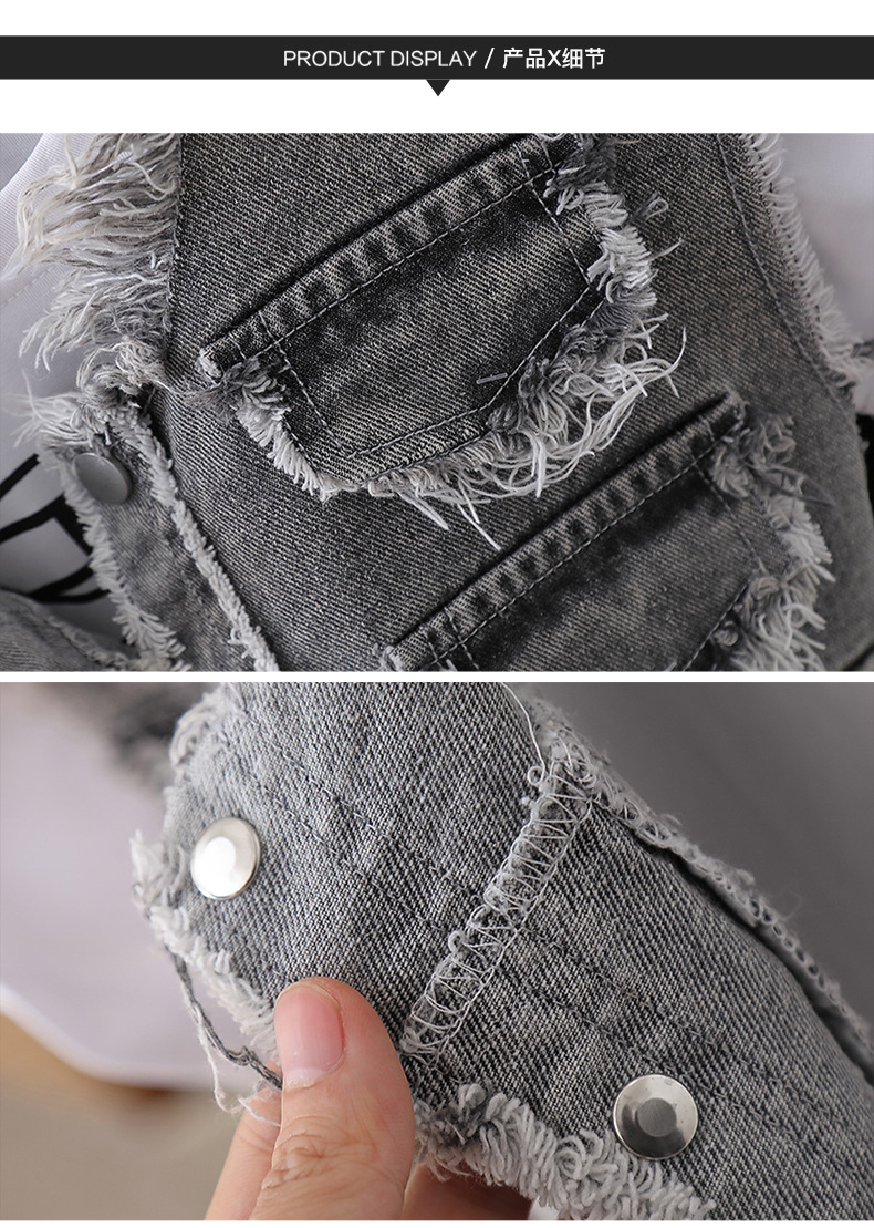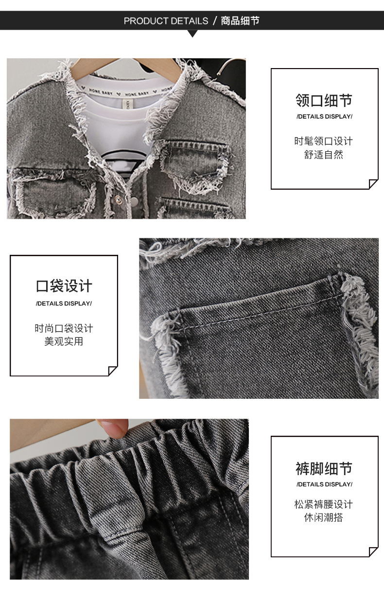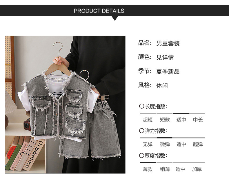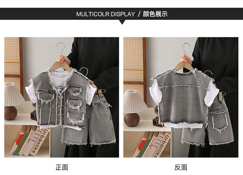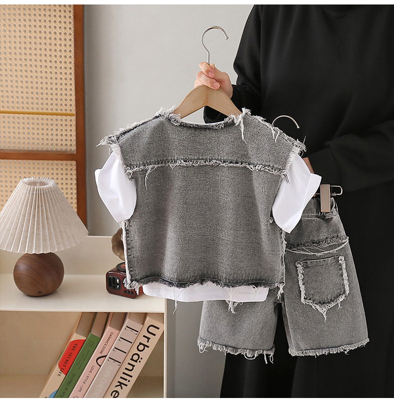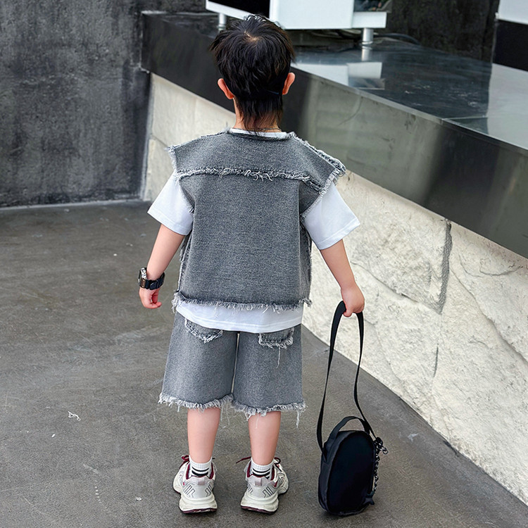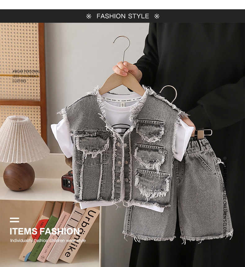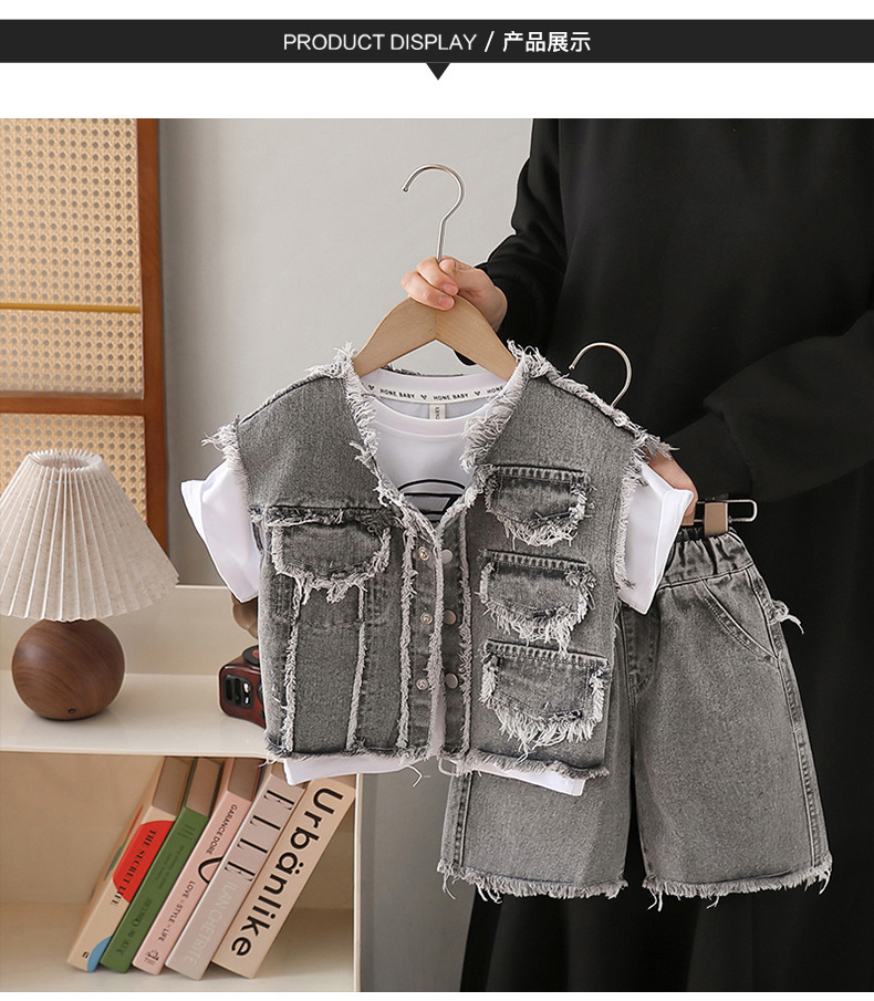 8126 traje de verano para niños 2025 nuevo chaleco de manga corta de mezclilla para niños de tres piezas ropa de verano para niños