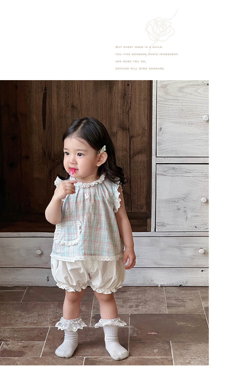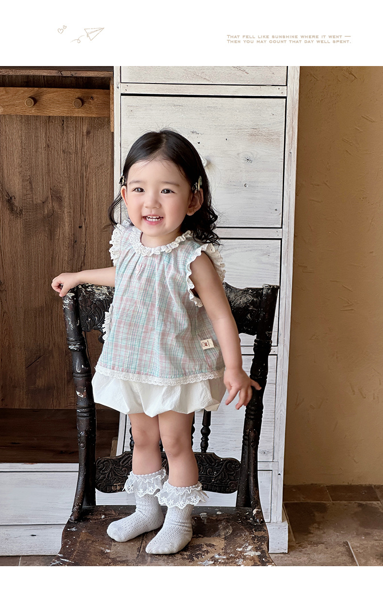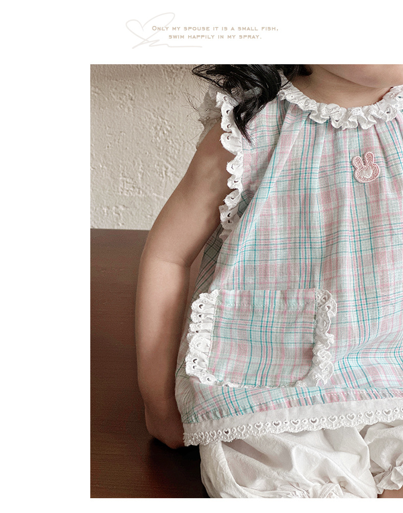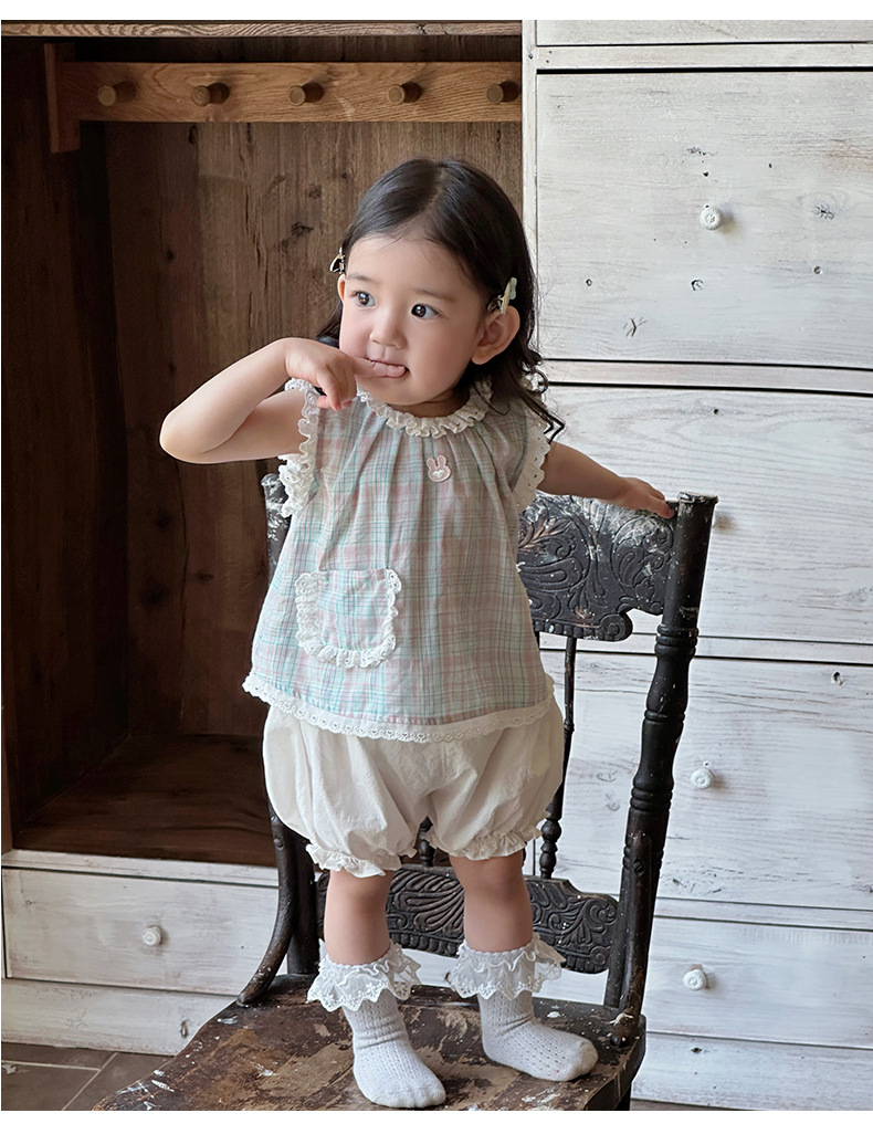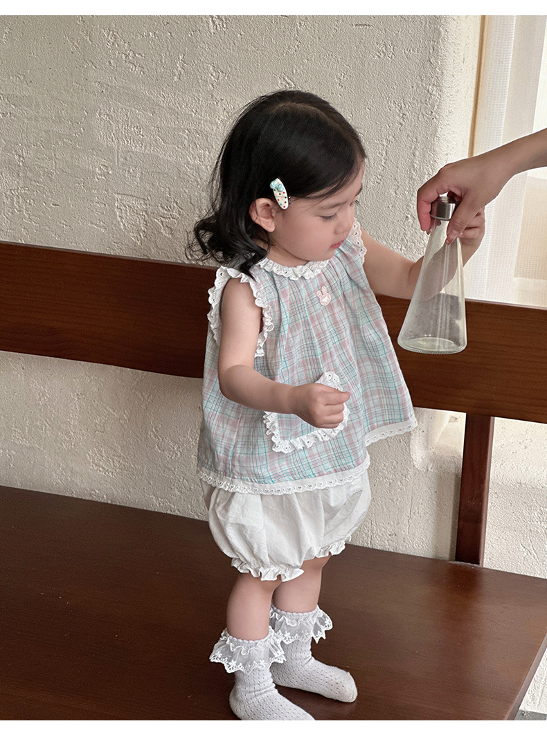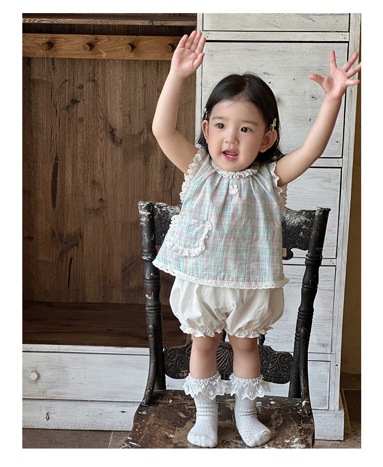 Traje pequeño de estilo occidental de la luna pequeña 2025 chaleco de encaje de verano lindo conejo bebé salir traje de dos piezas