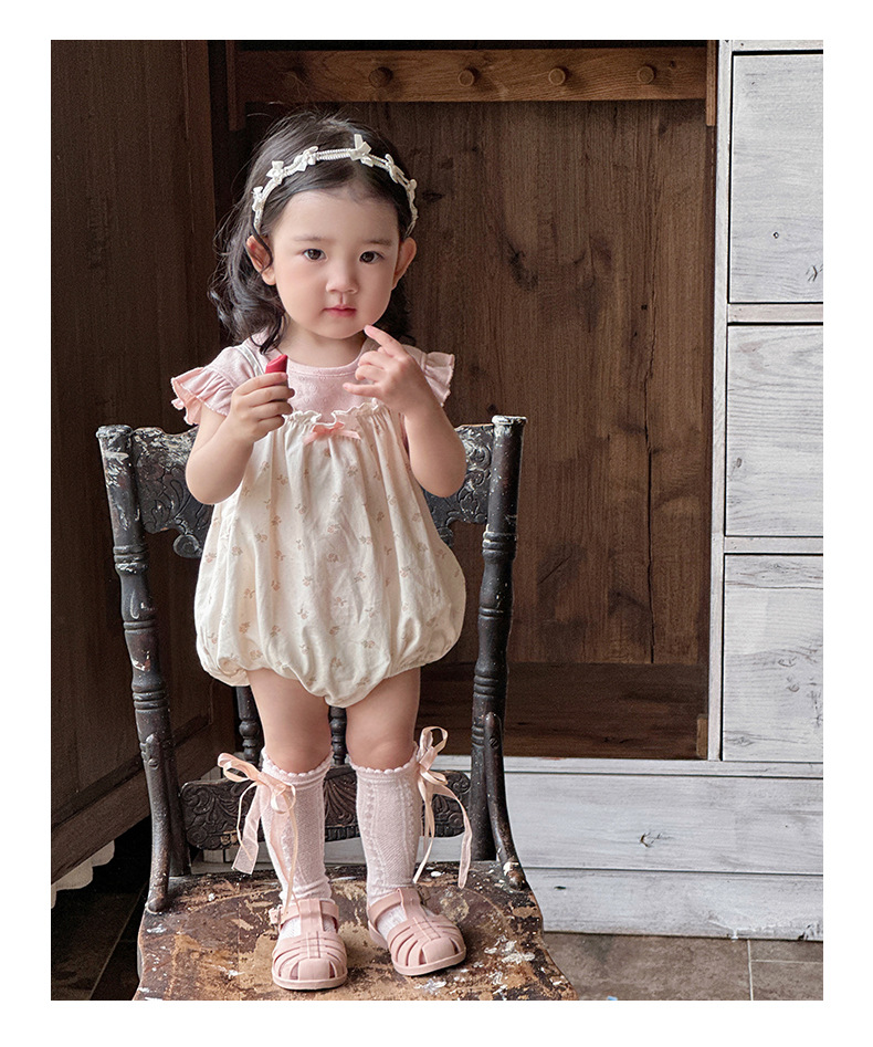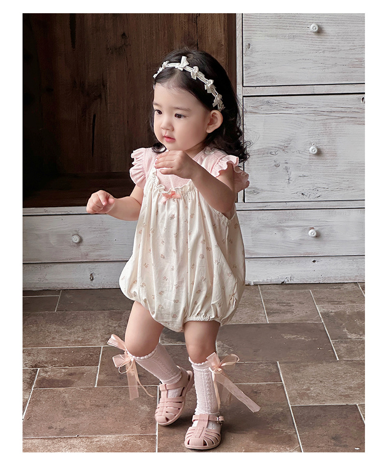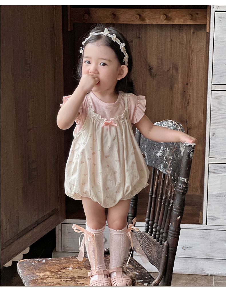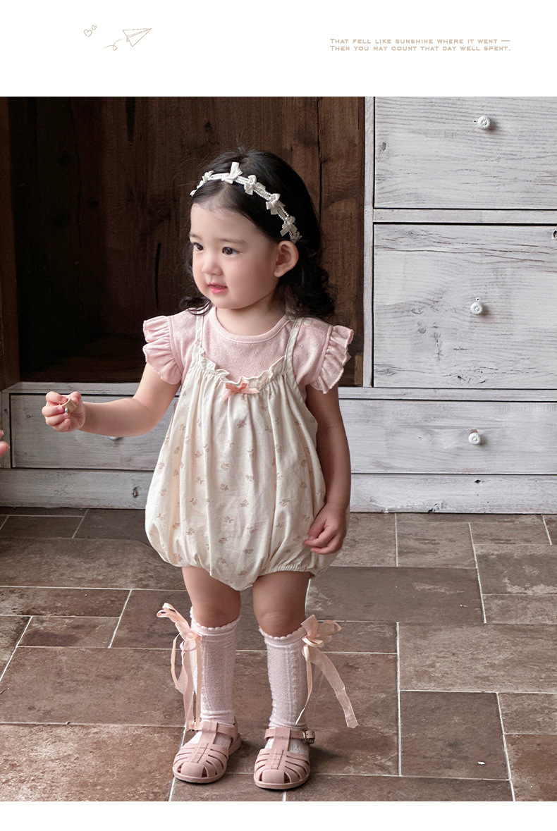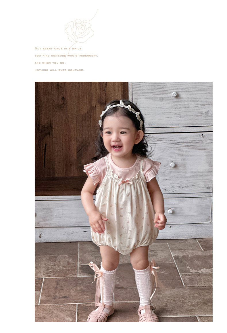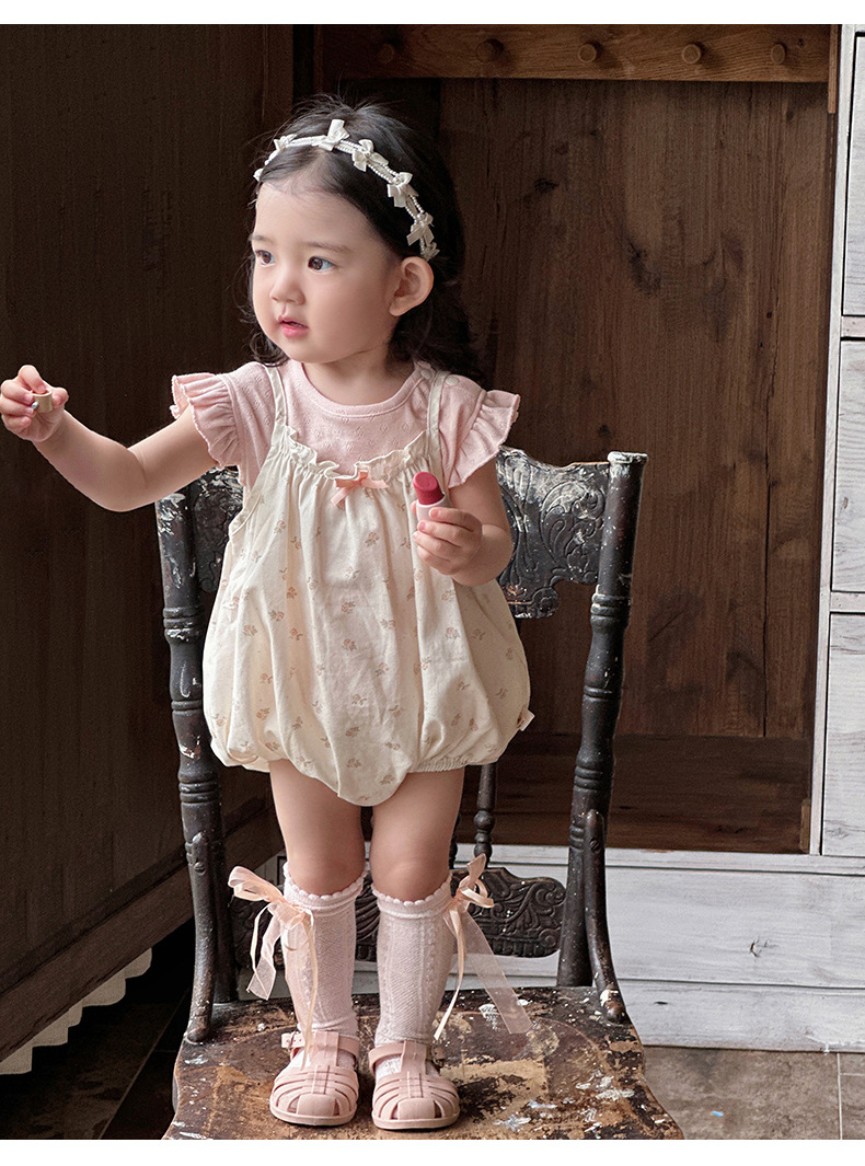 Traje de baby super lindo 2025 nuevo verano de 1 a 3 años de edad, traje de dos piezas de manga voladora floral pequeña delgada