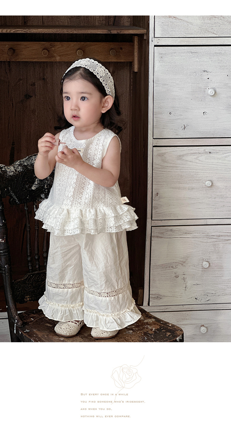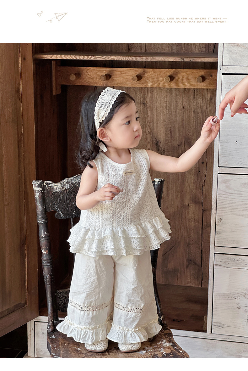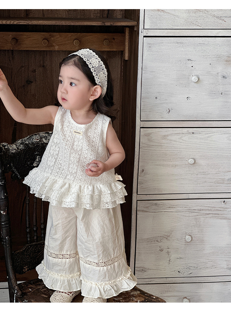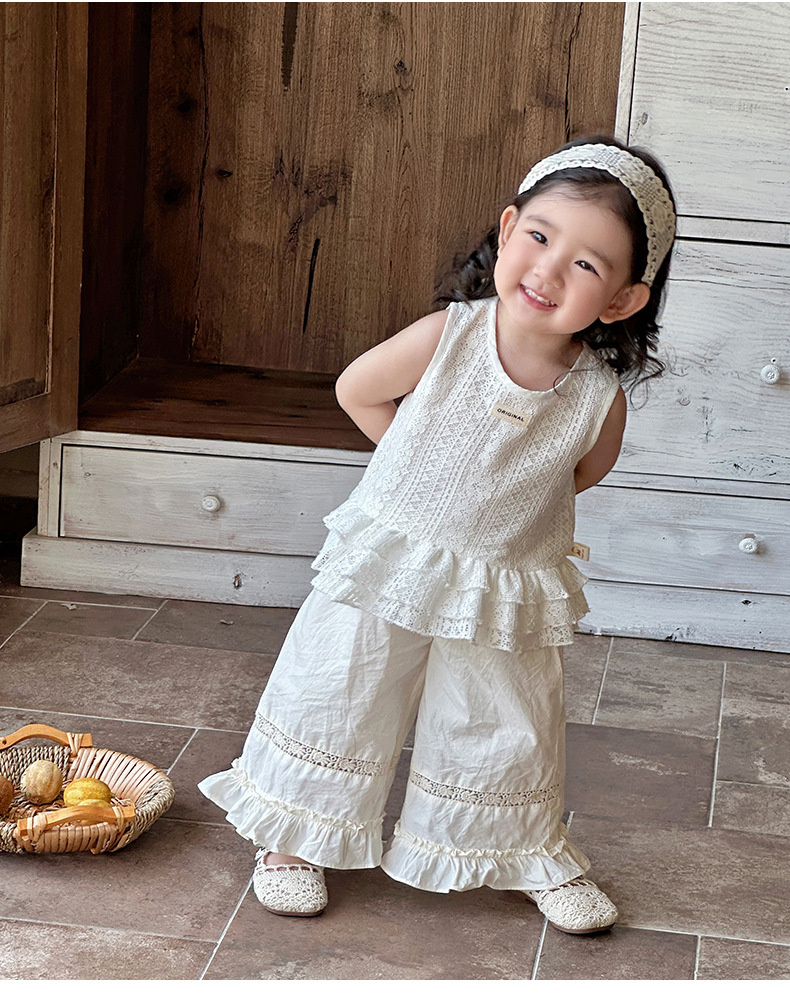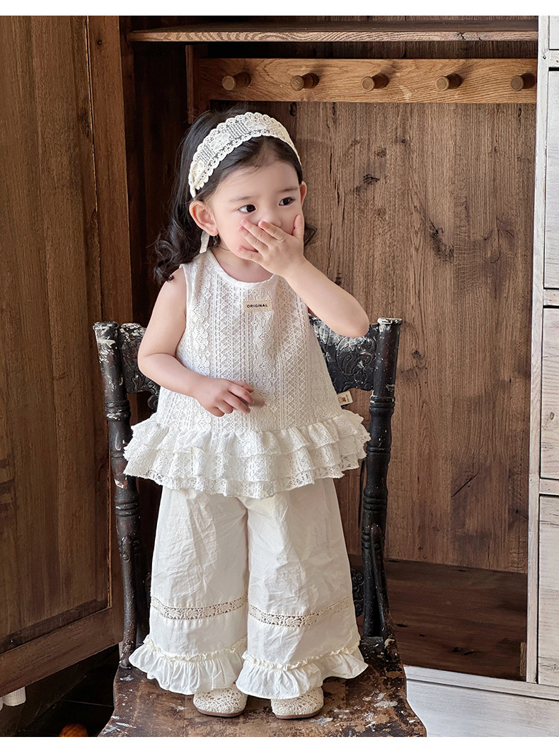 2025 verano nuevo estilo vestido de encaje de niña coreana bebé orejas de madera huecas pantalones anchos fuera de dos piezas