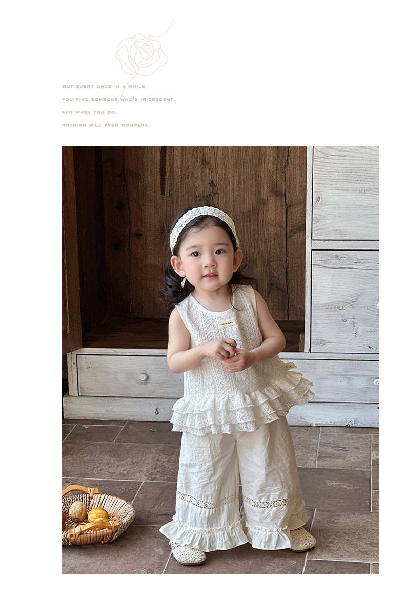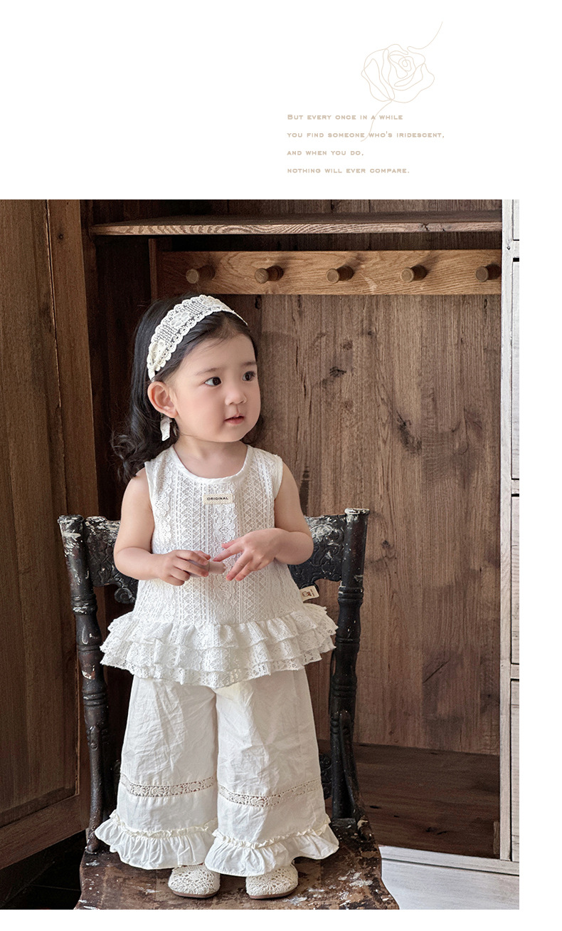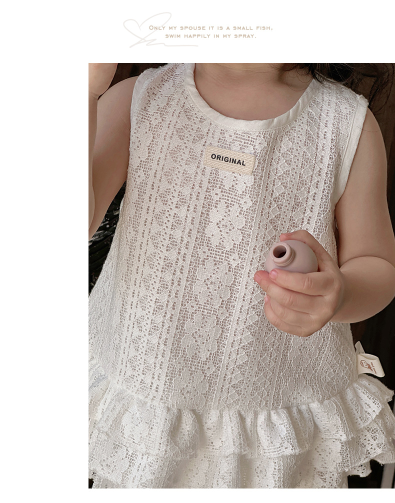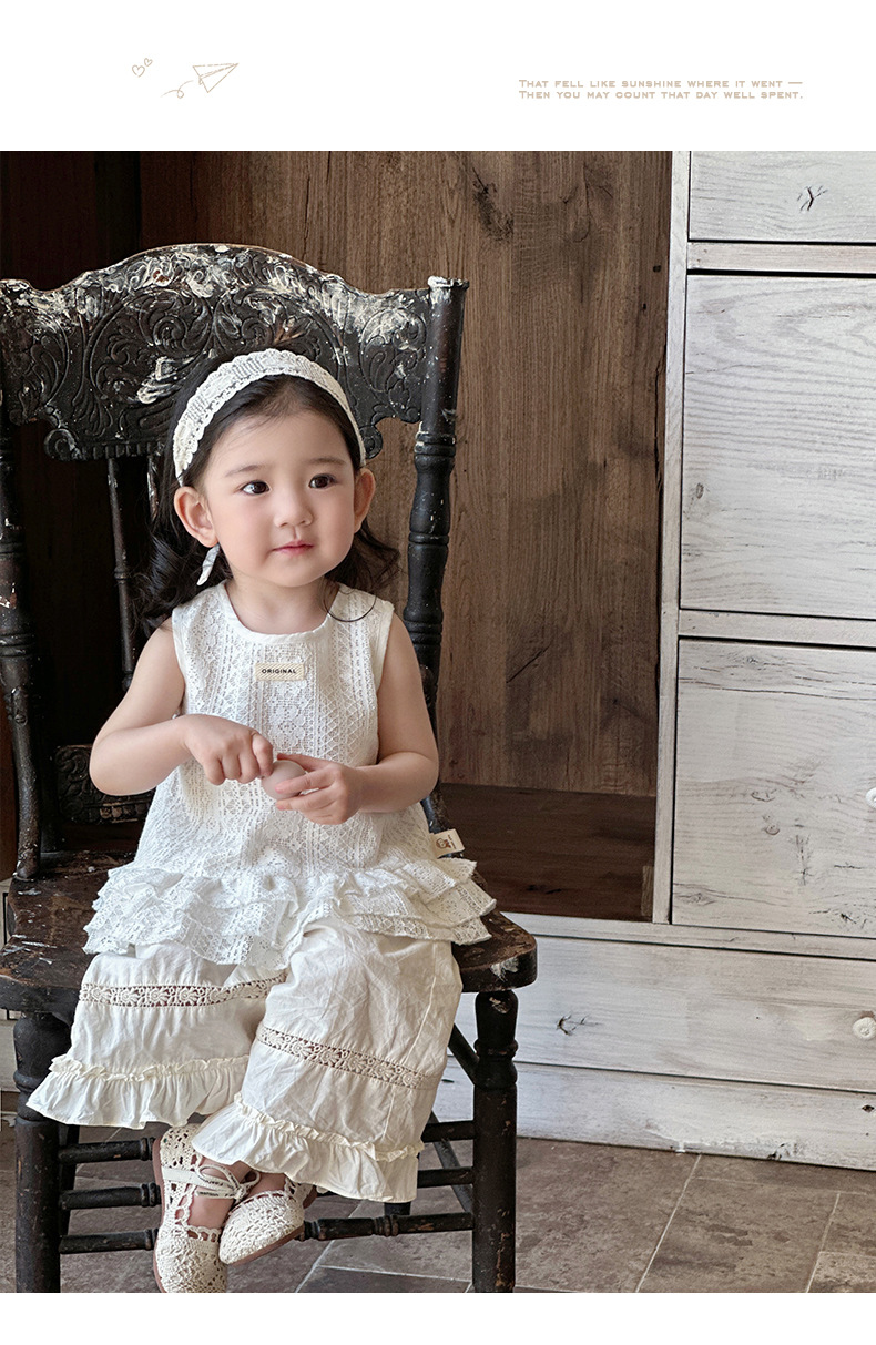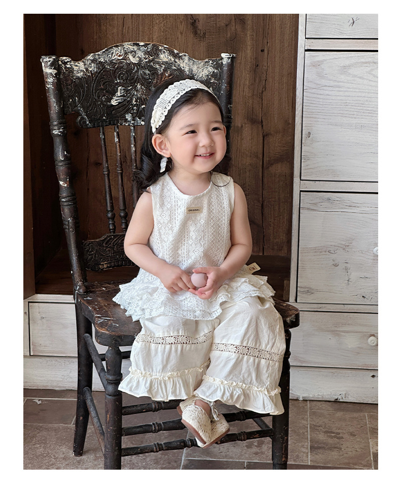 2025 verano nuevo estilo vestido de encaje de niña coreana bebé orejas de madera huecas pantalones anchos fuera de dos piezas
