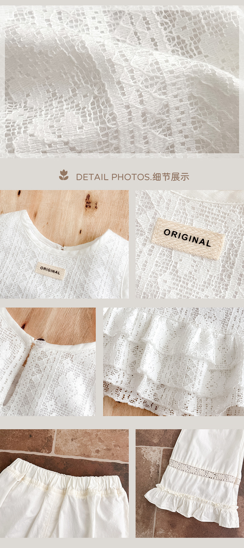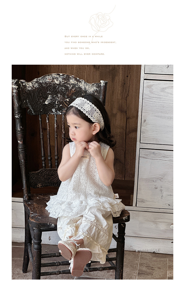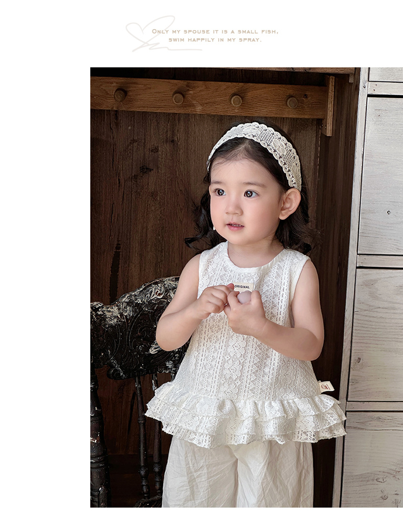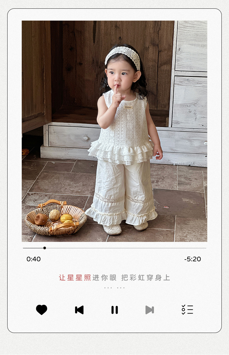 2025 verano nuevo estilo vestido de encaje de niña coreana bebé orejas de madera huecas pantalones anchos fuera de dos piezas