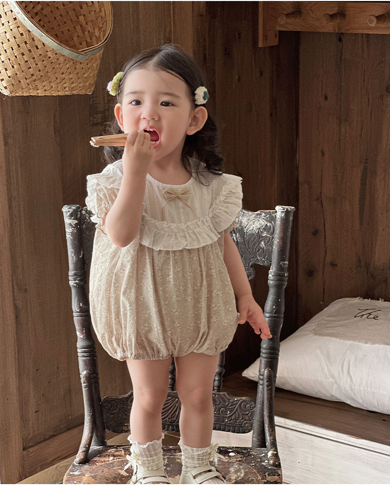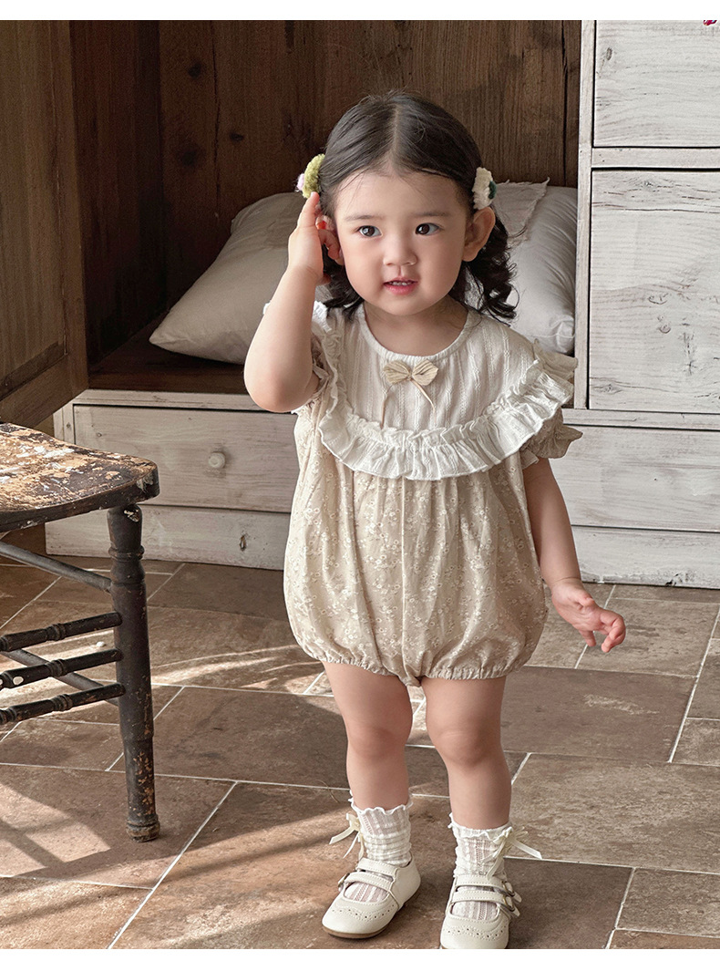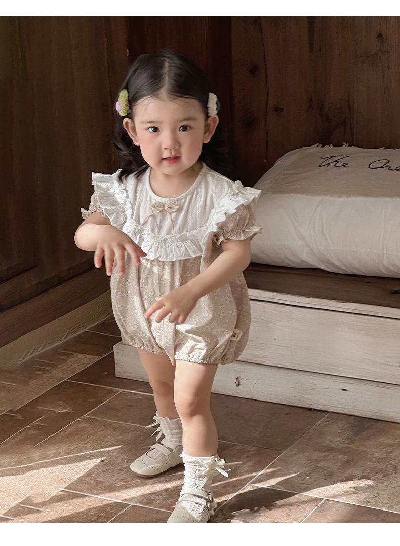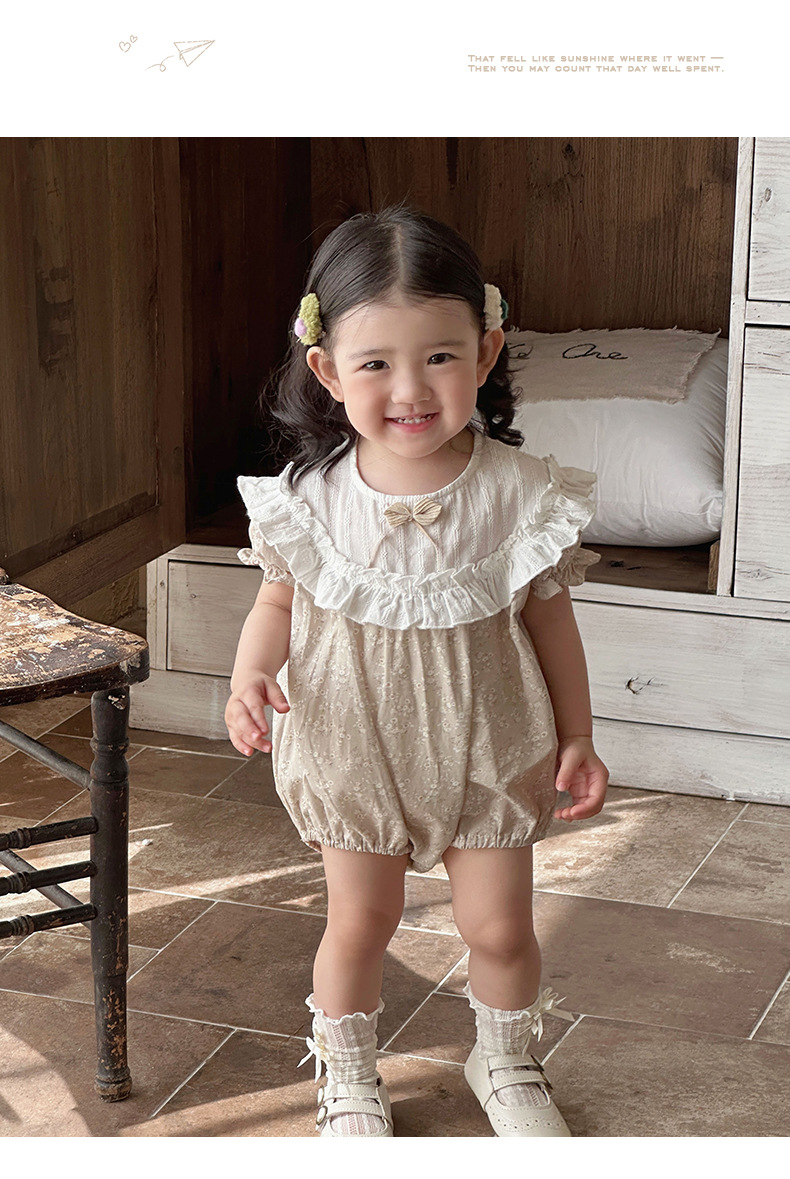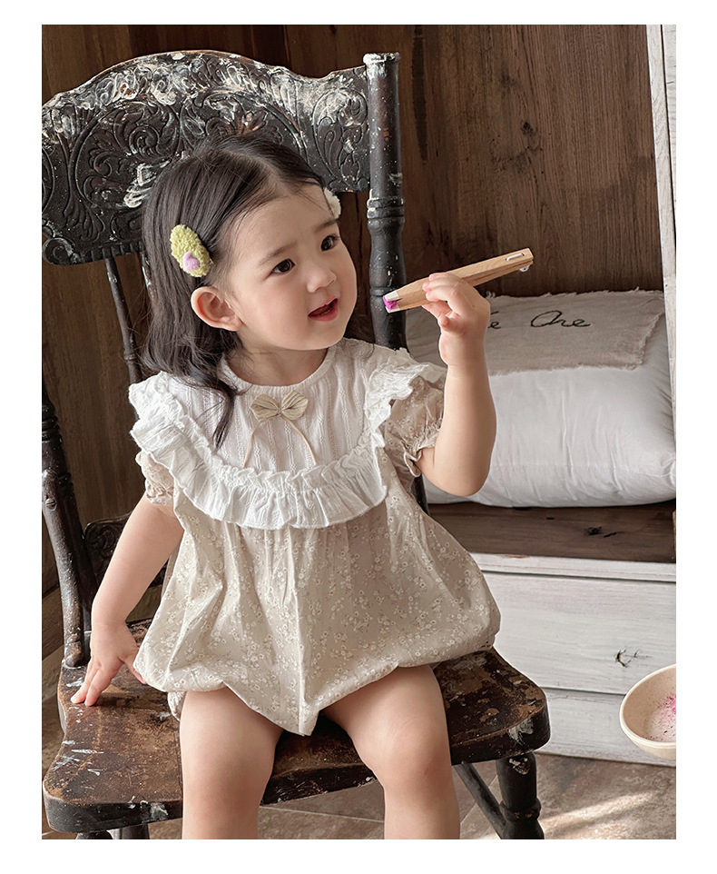 Verano para bebés nuevo estilo mampara de manga corta con costuras florales, ropa de salida para bebés y niños pequeños, ropa de pedo para bebés lindos