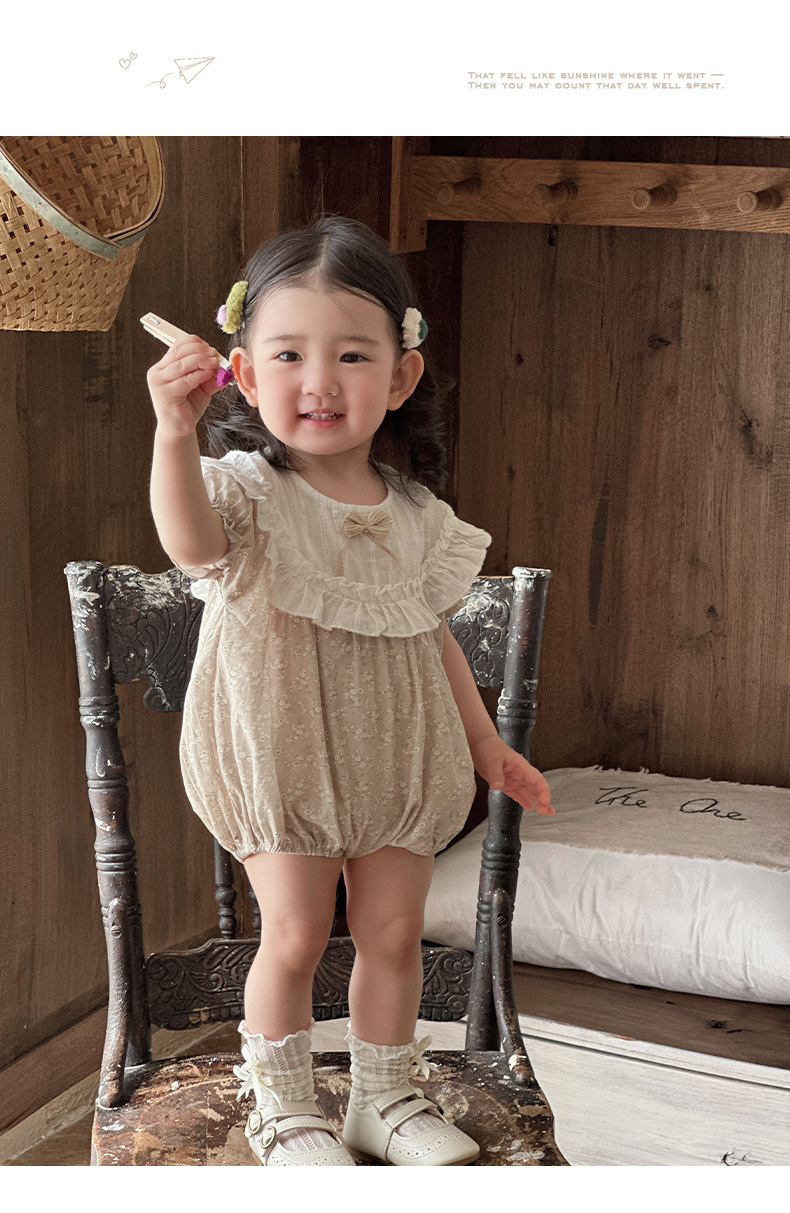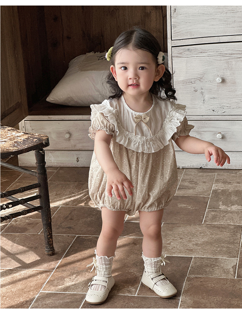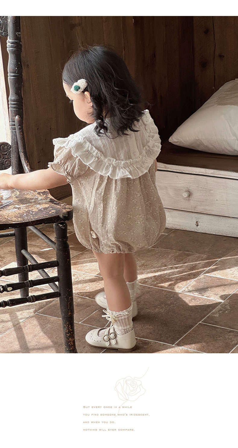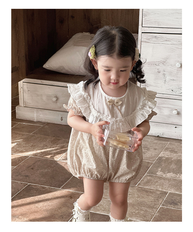 Verano para bebés nuevo estilo mampara de manga corta con costuras florales, ropa de salida para bebés y niños pequeños, ropa de pedo para bebés lindos