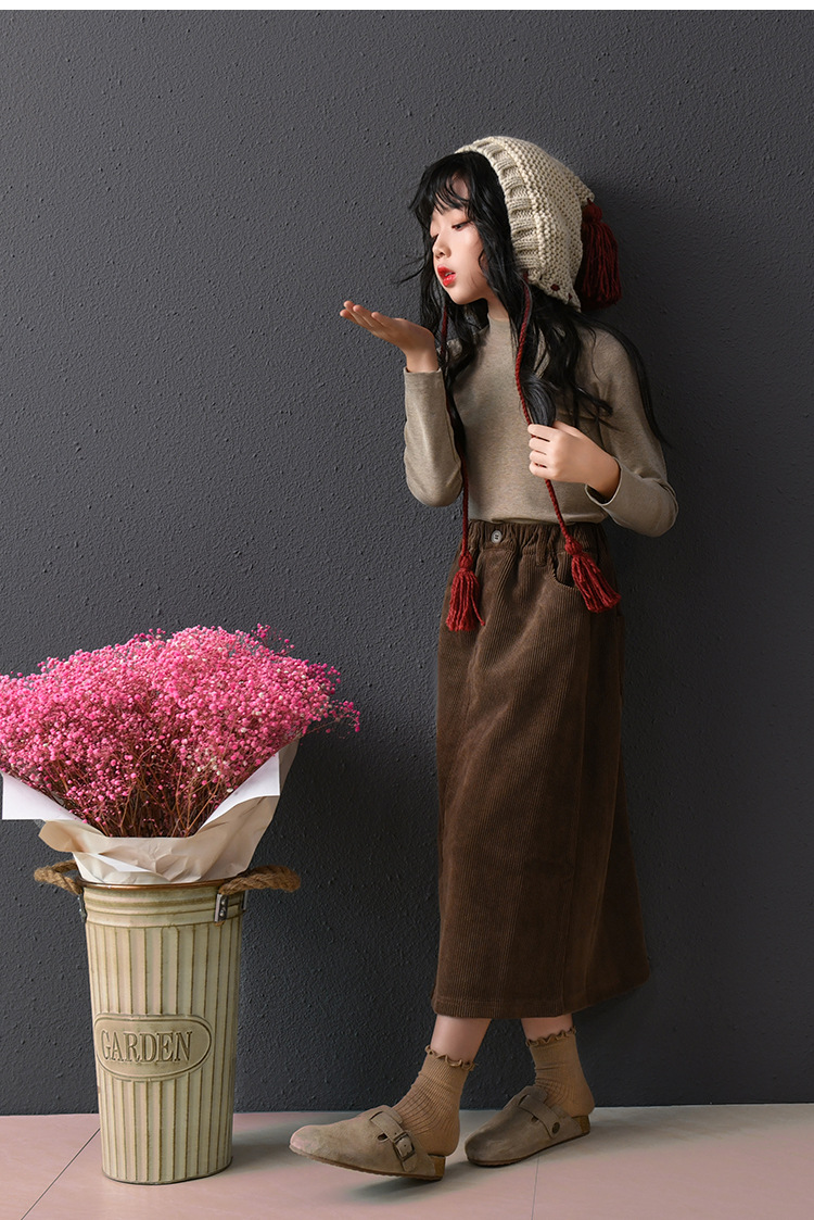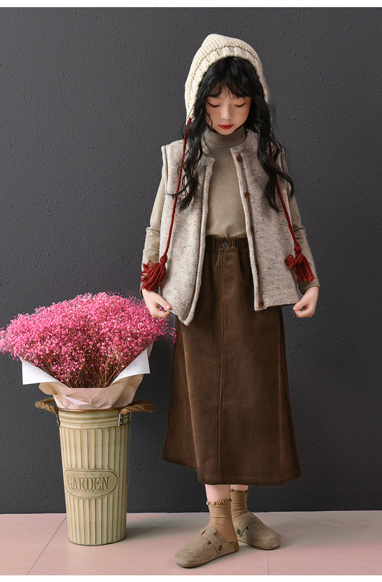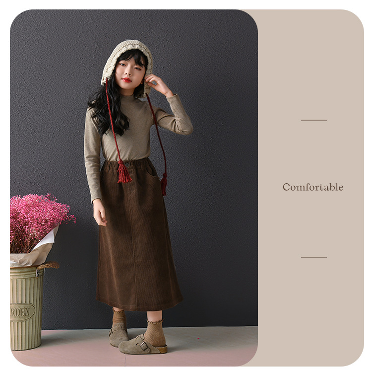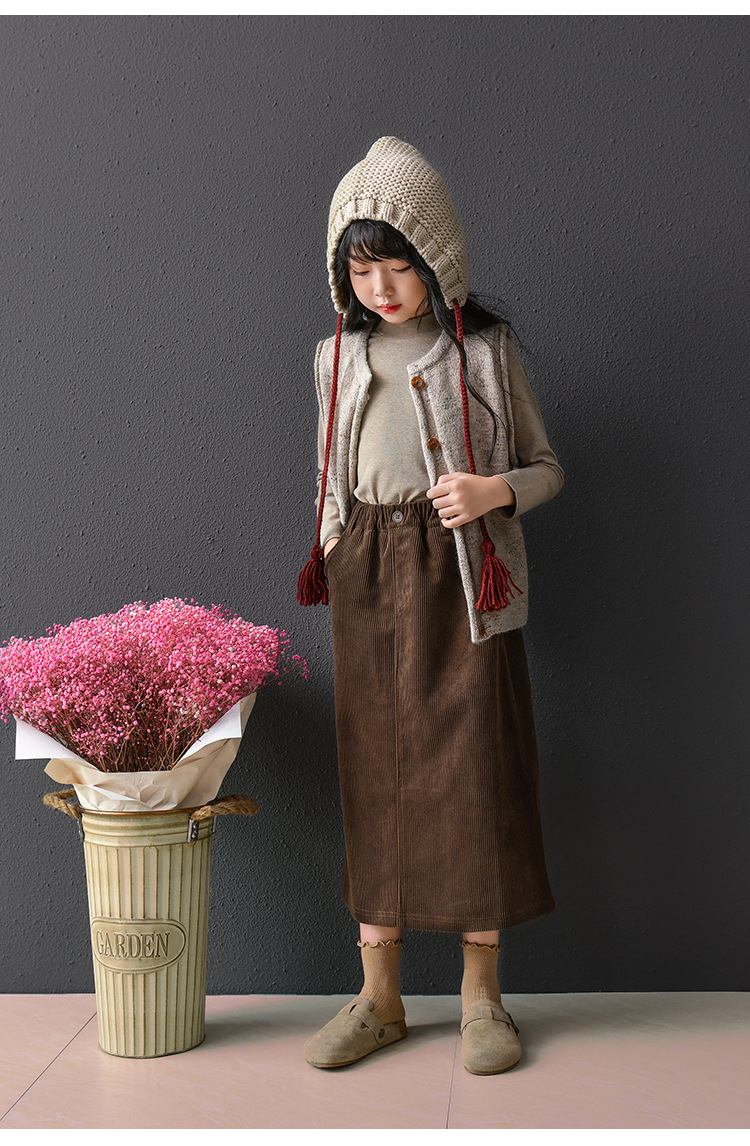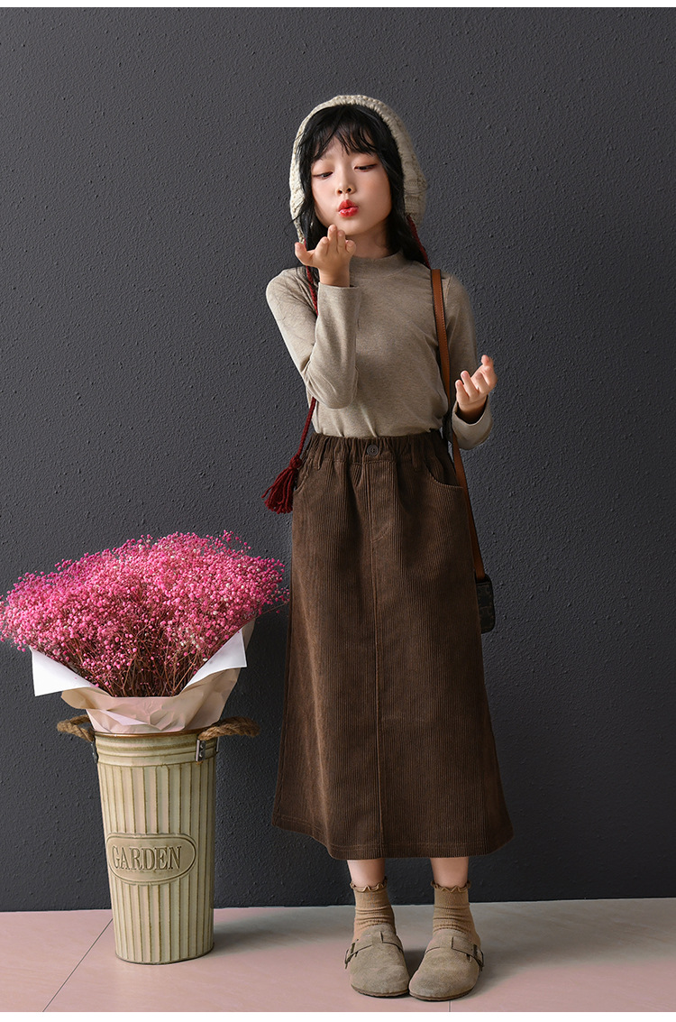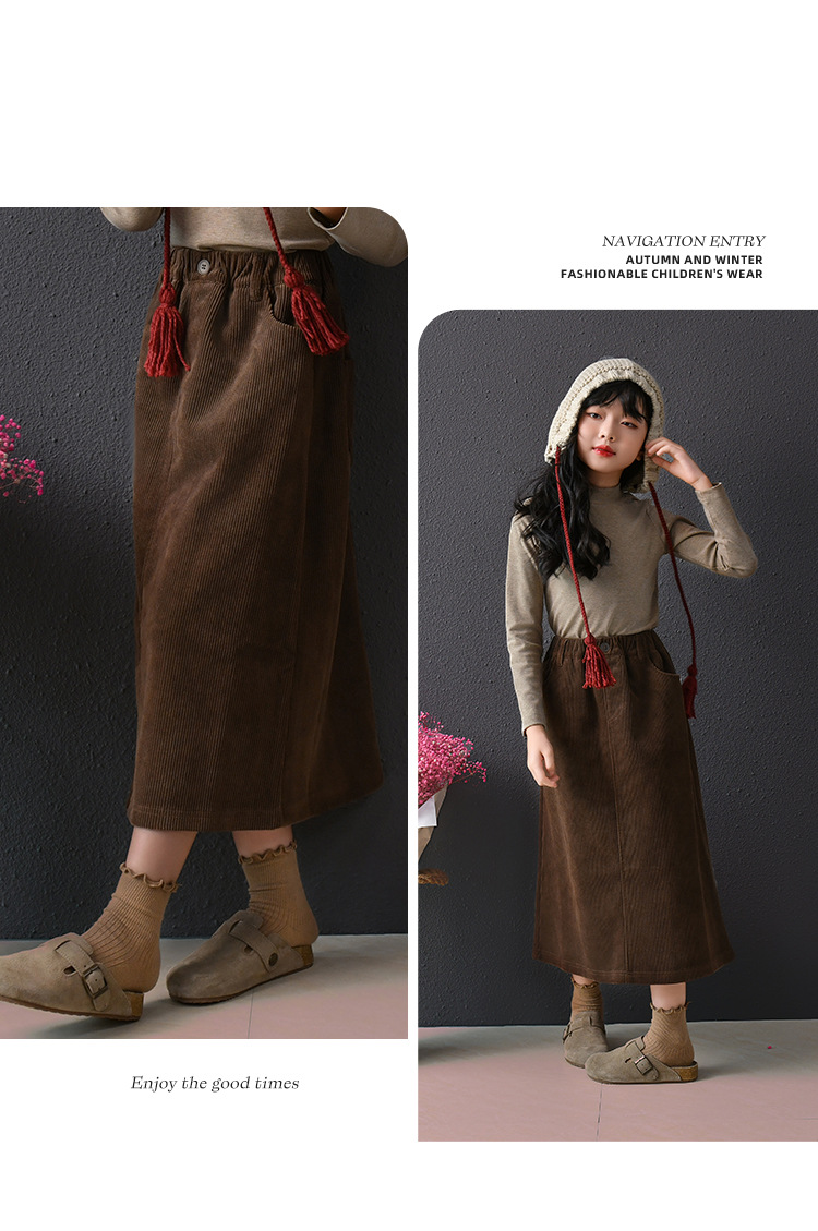 Falda de media longitud para niñas otoño e invierno para niños, falda cálida de pana de cintura alta retro para niños