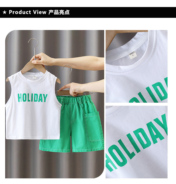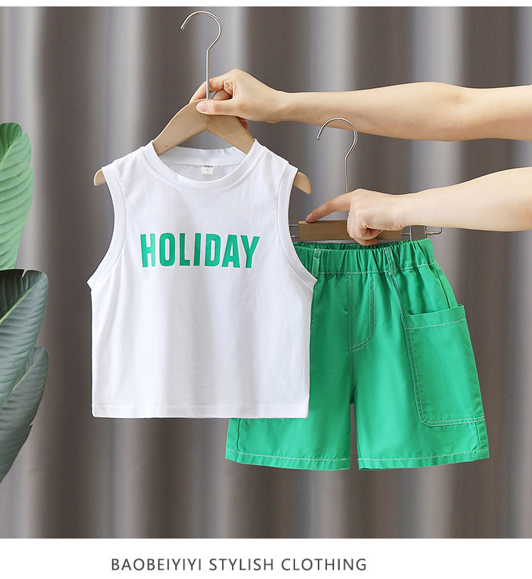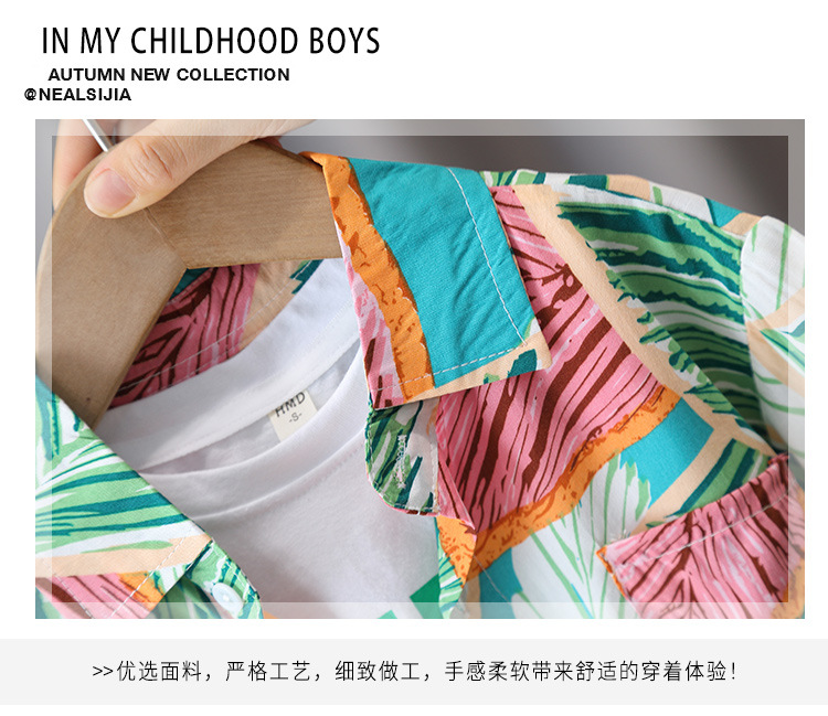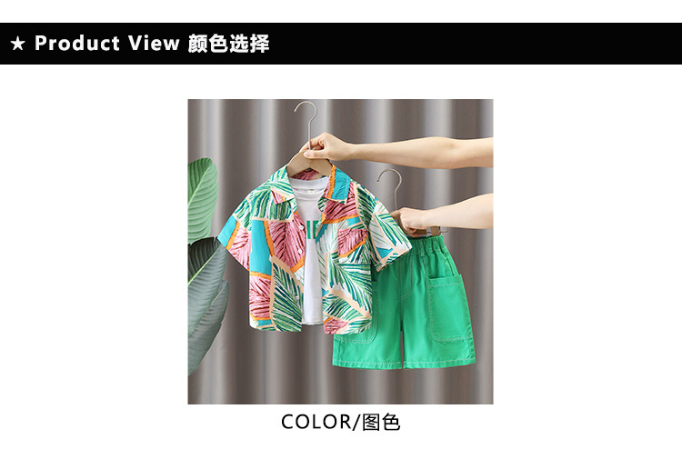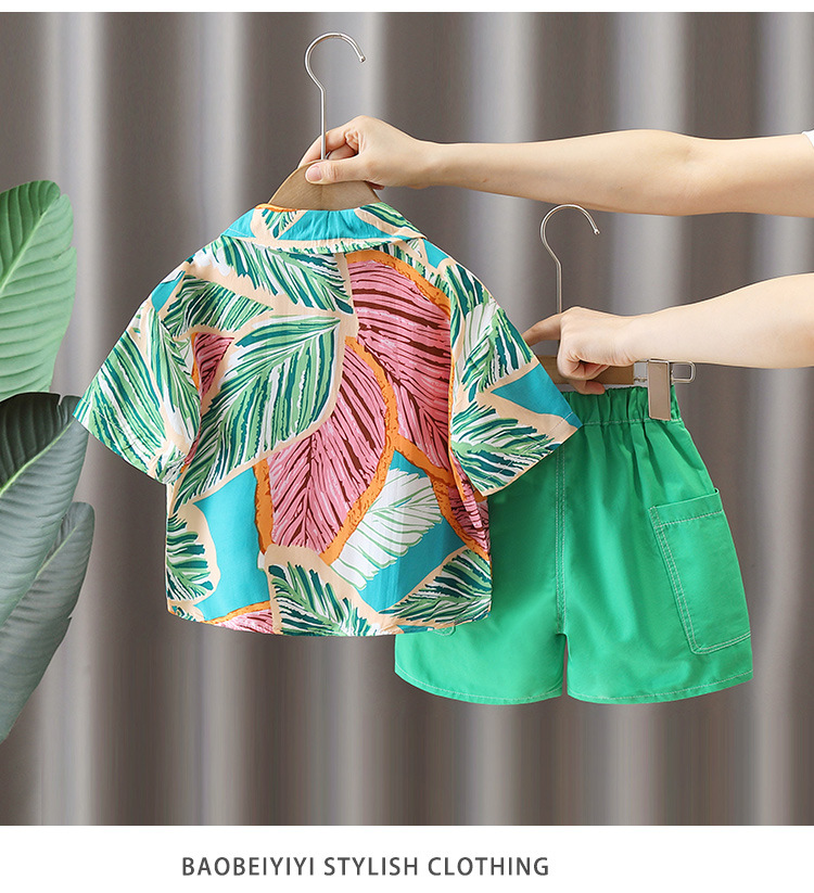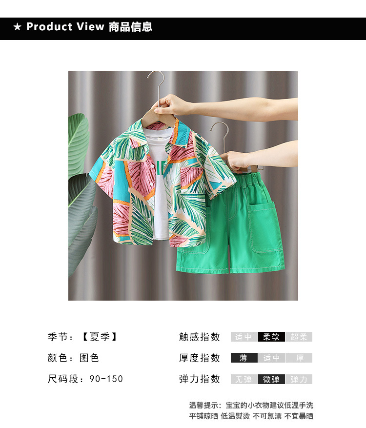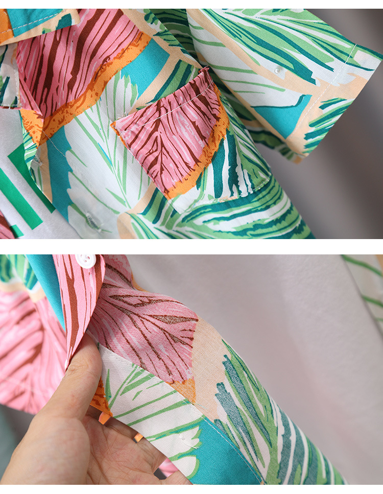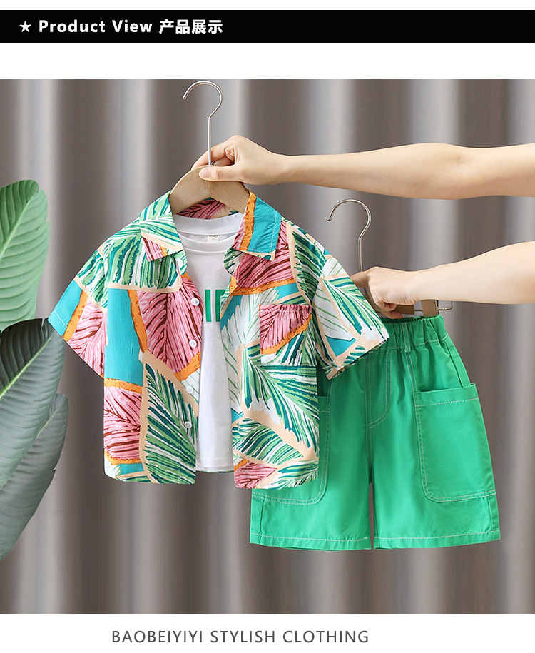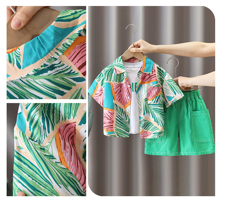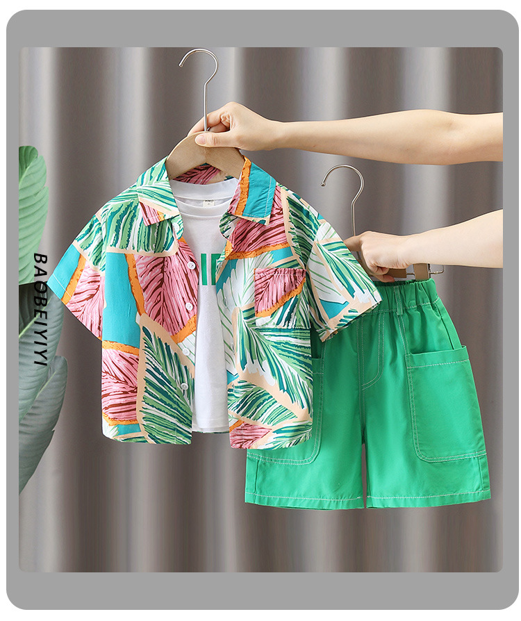 5684 traje de camisa de estilo de vacaciones para niños 2025 verano nuevo traje de tres piezas de ropa de playa de Sanya junto al mar para niños