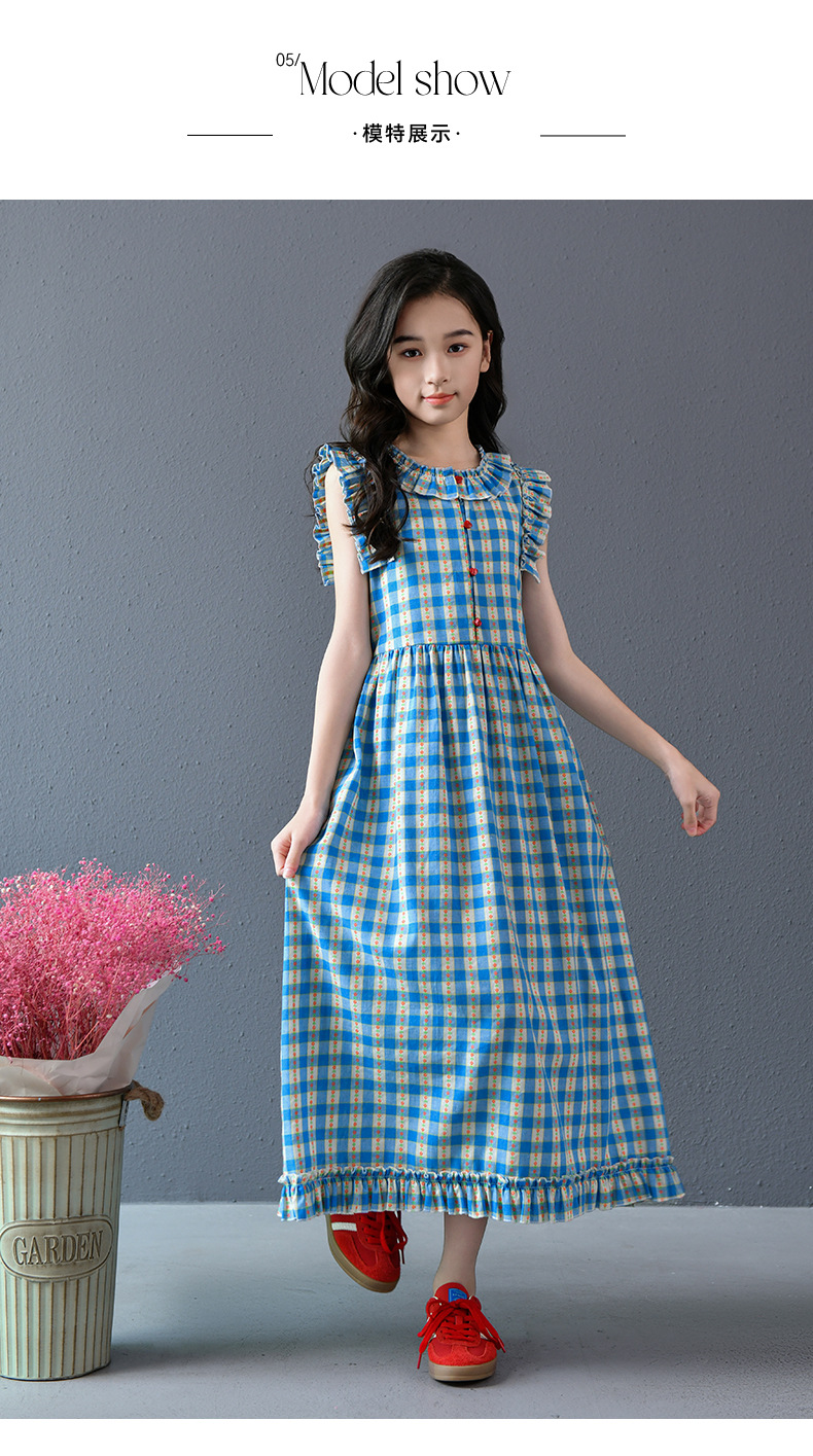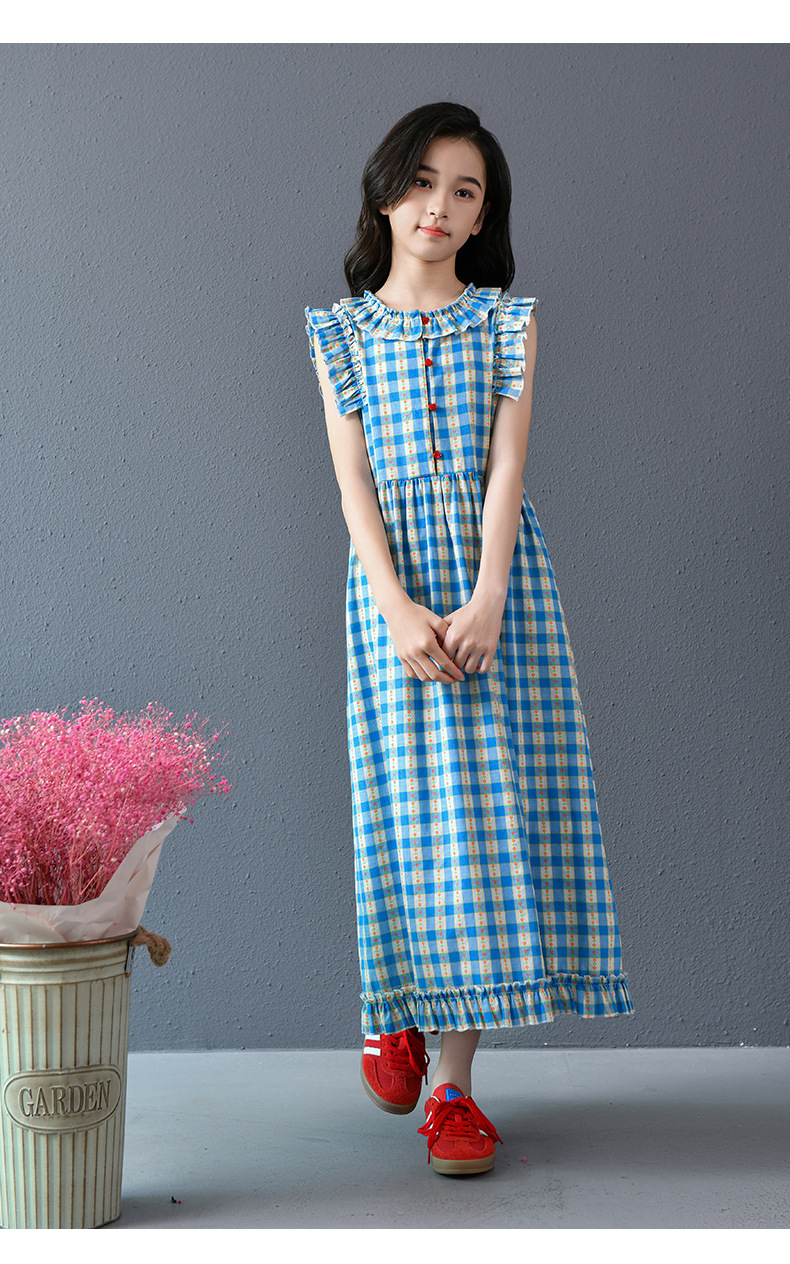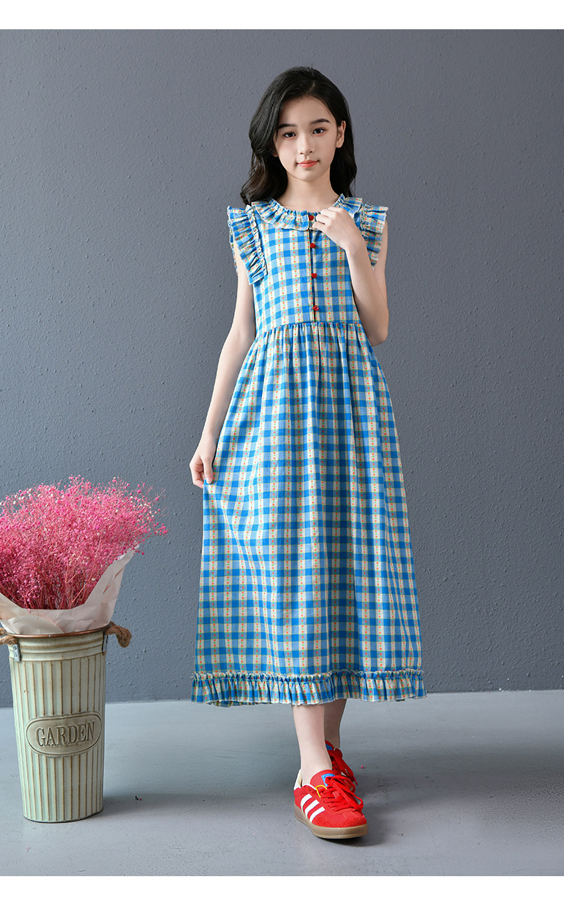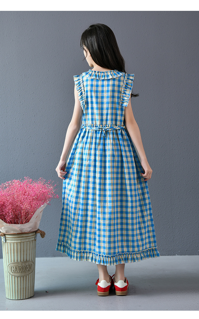 Real shot spot 2025 niñas a cuadros estilo coreano dulce vestido de algodón con mangas voladoras cuello redondo falda larga a cuadros azules