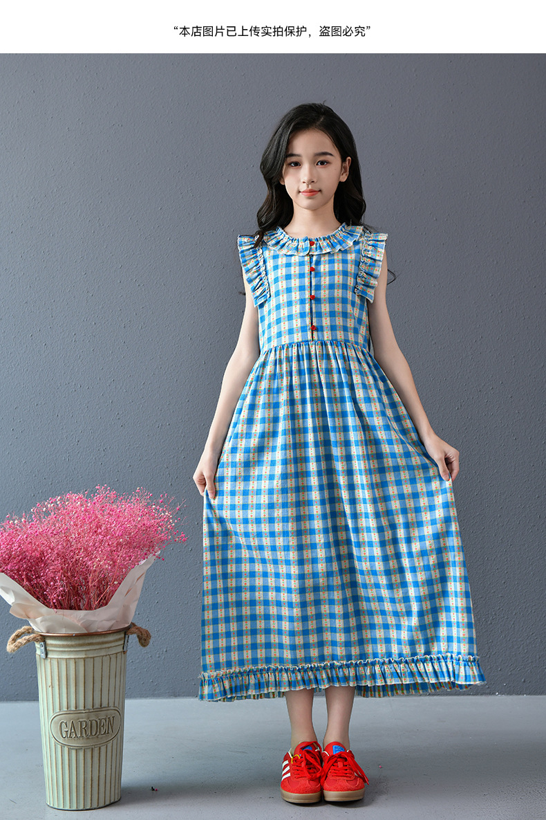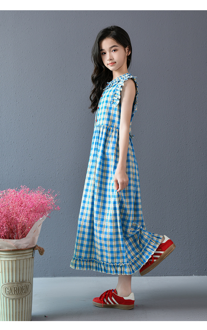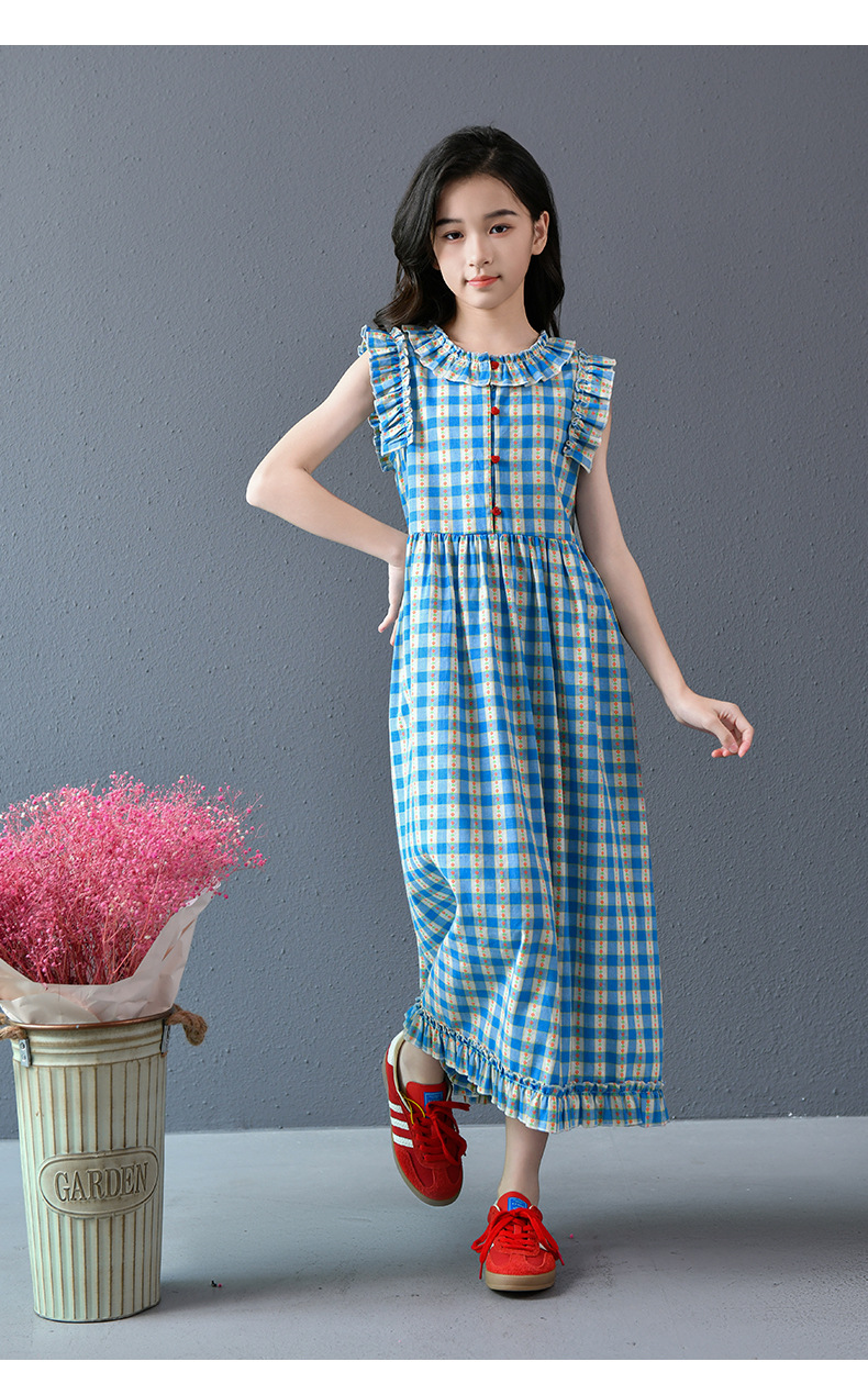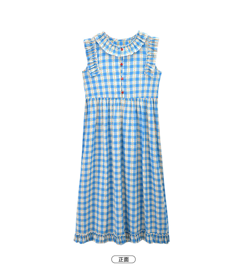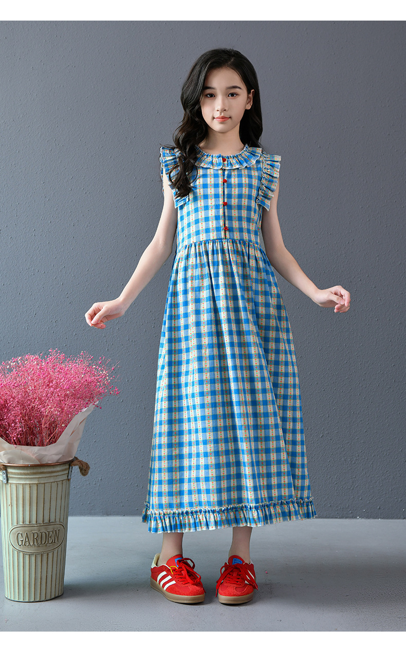 Real shot spot 2025 niñas a cuadros estilo coreano dulce vestido de algodón con mangas voladoras cuello redondo falda larga a cuadros azules