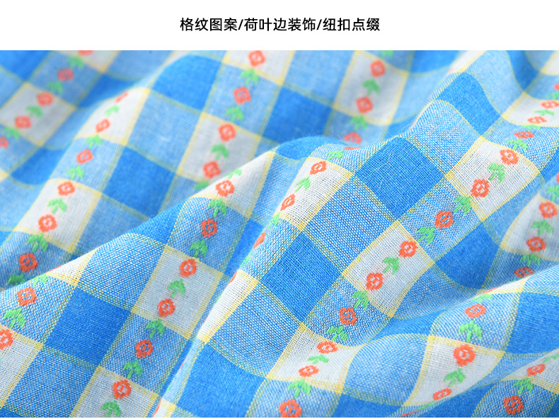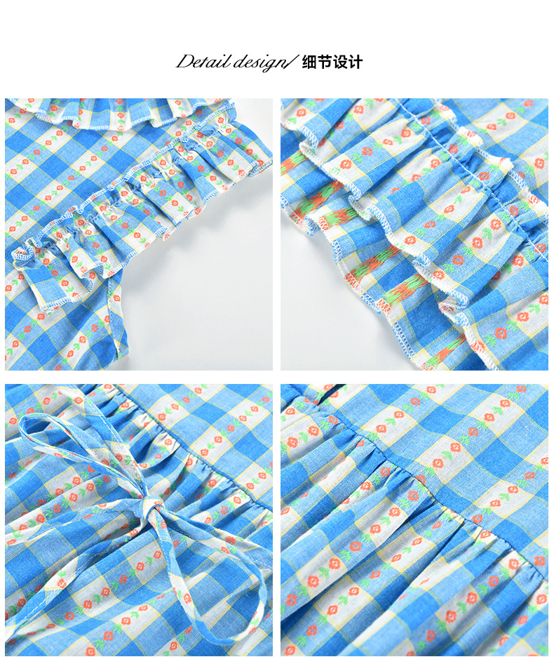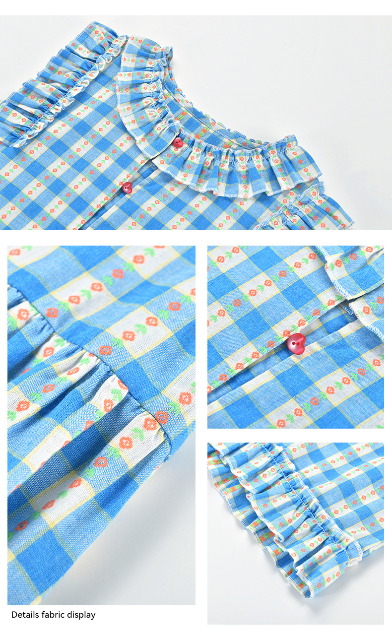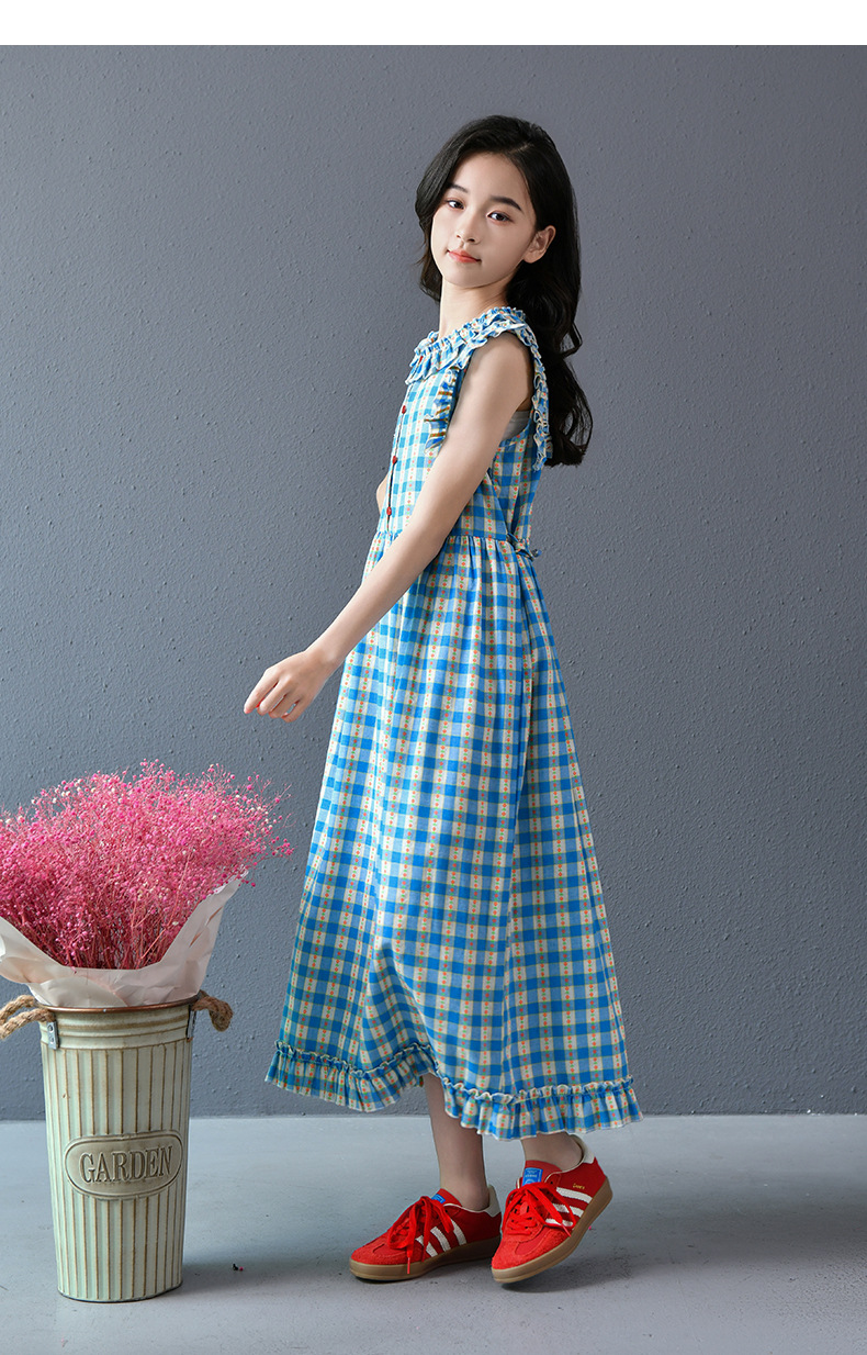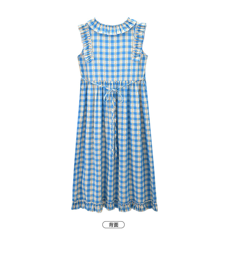 Real shot spot 2025 niñas a cuadros estilo coreano dulce vestido de algodón con mangas voladoras cuello redondo falda larga a cuadros azules