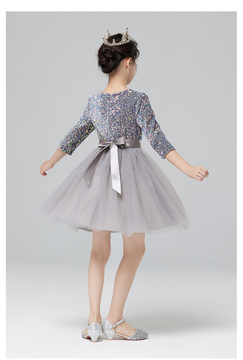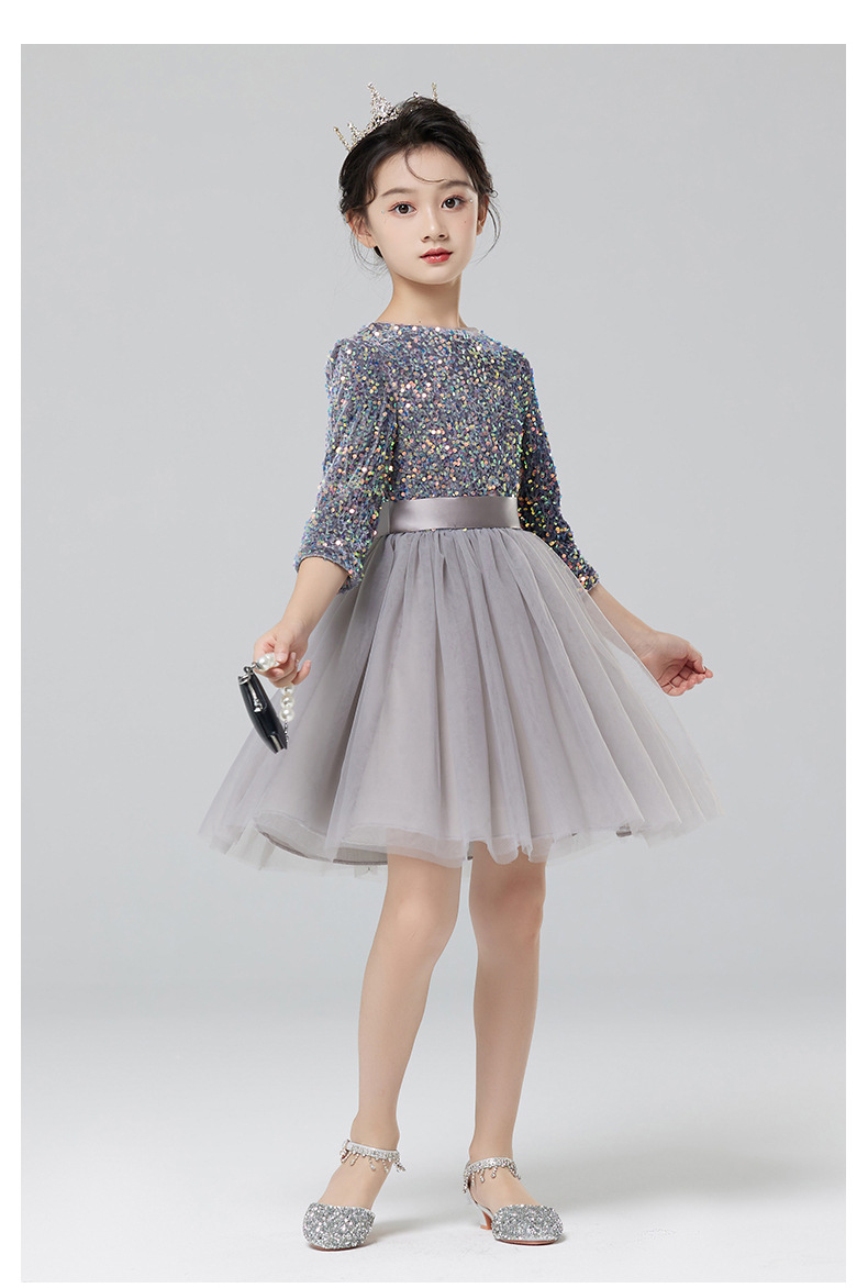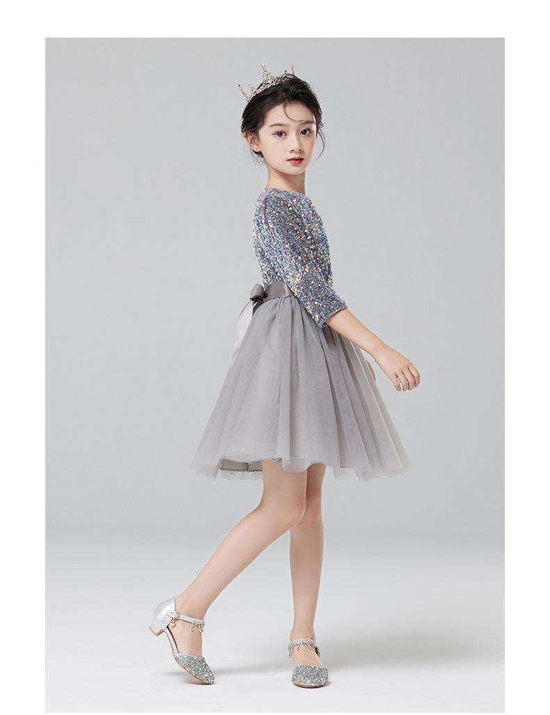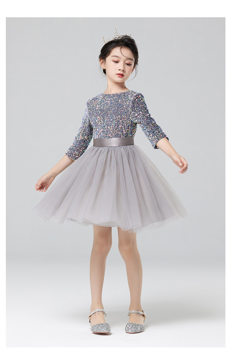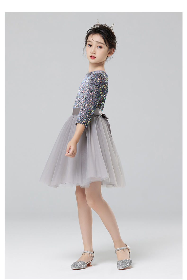 Vestidos para niños, vestidos de princesa de alta gama para niñas, vestidos de interpretación de piano gris, vestidos cortos de manga larga para niños