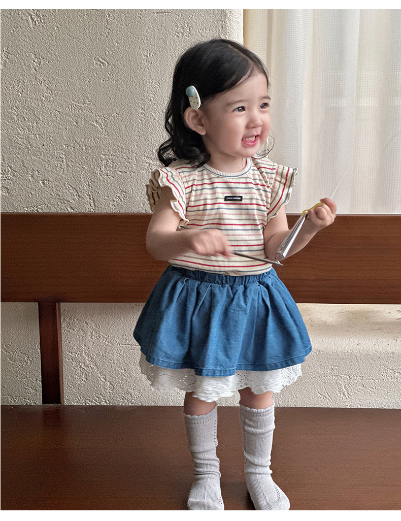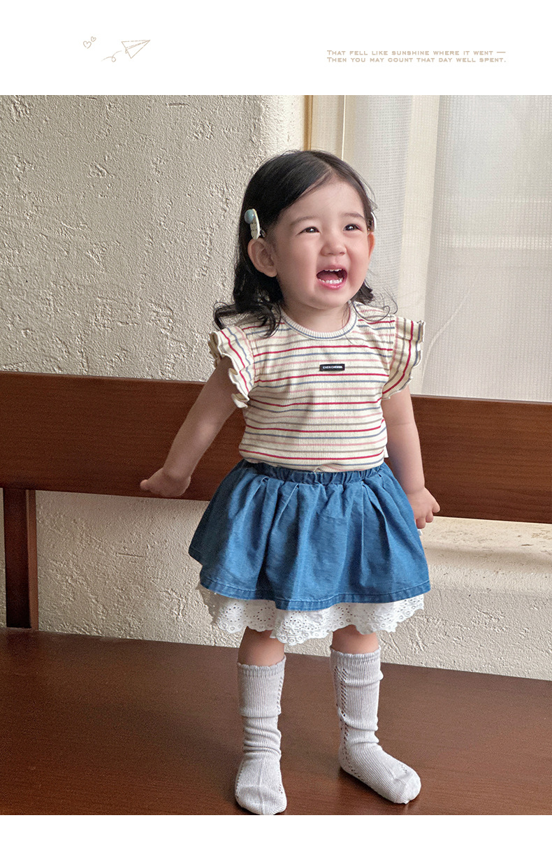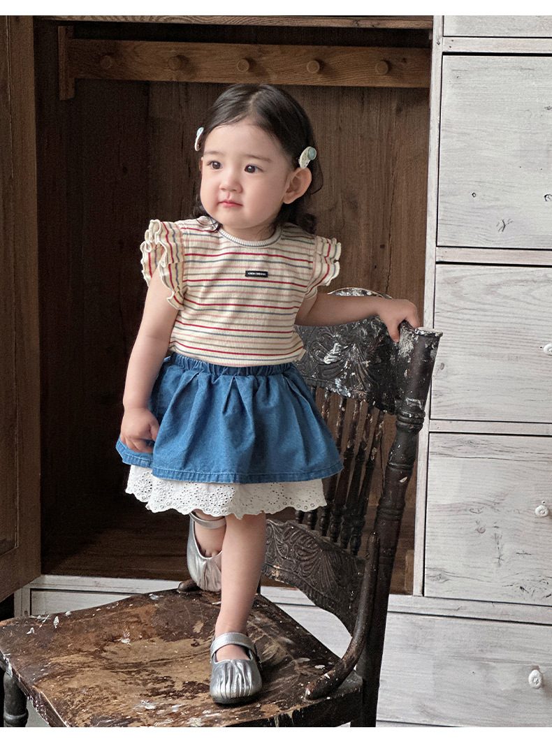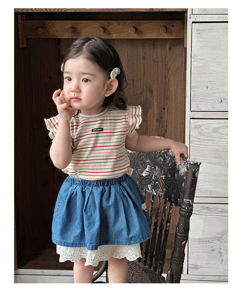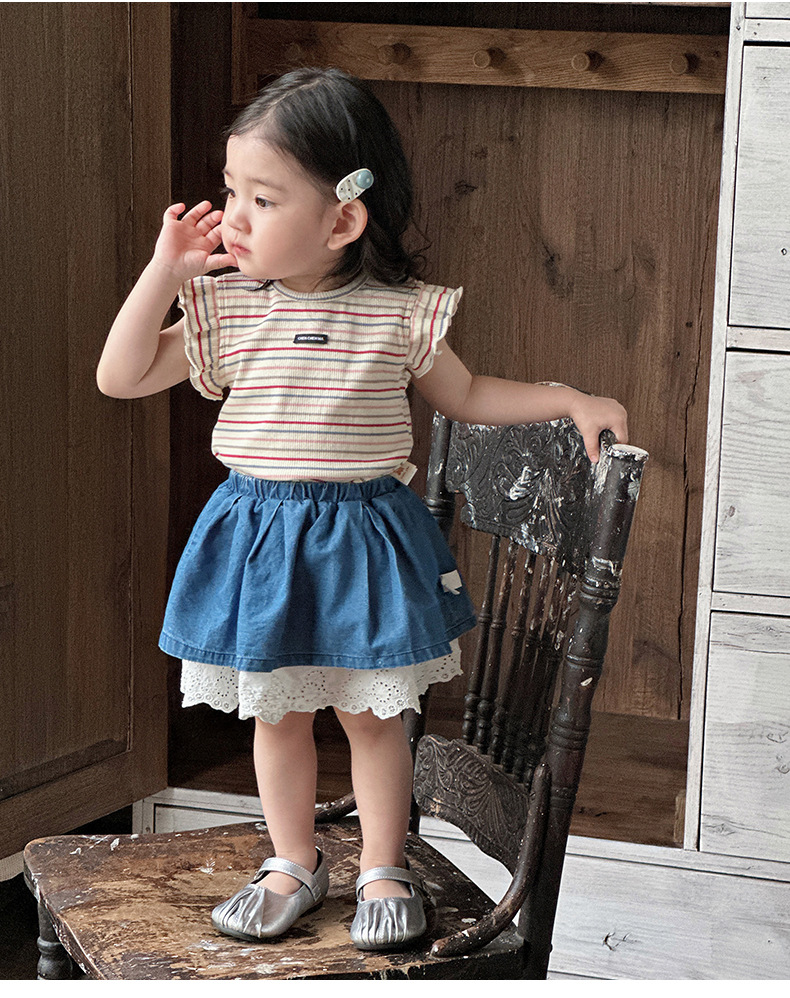 Traje pequeño de estilo occidental para bebés y niños pequeños 2025 verano nuevo estilo coreano delgado top a rayas falda de encaje de dos piezas