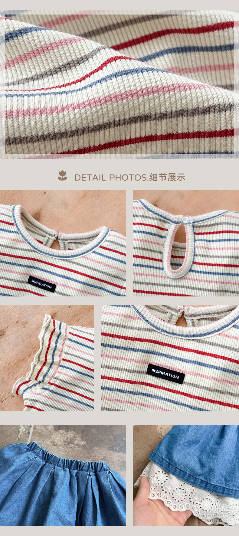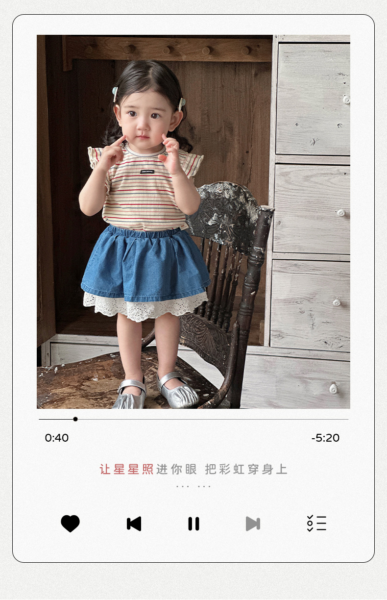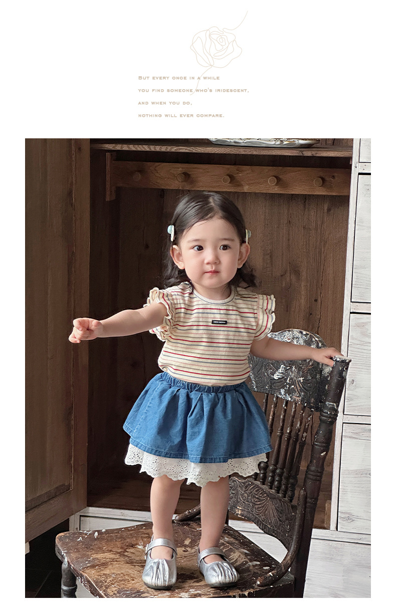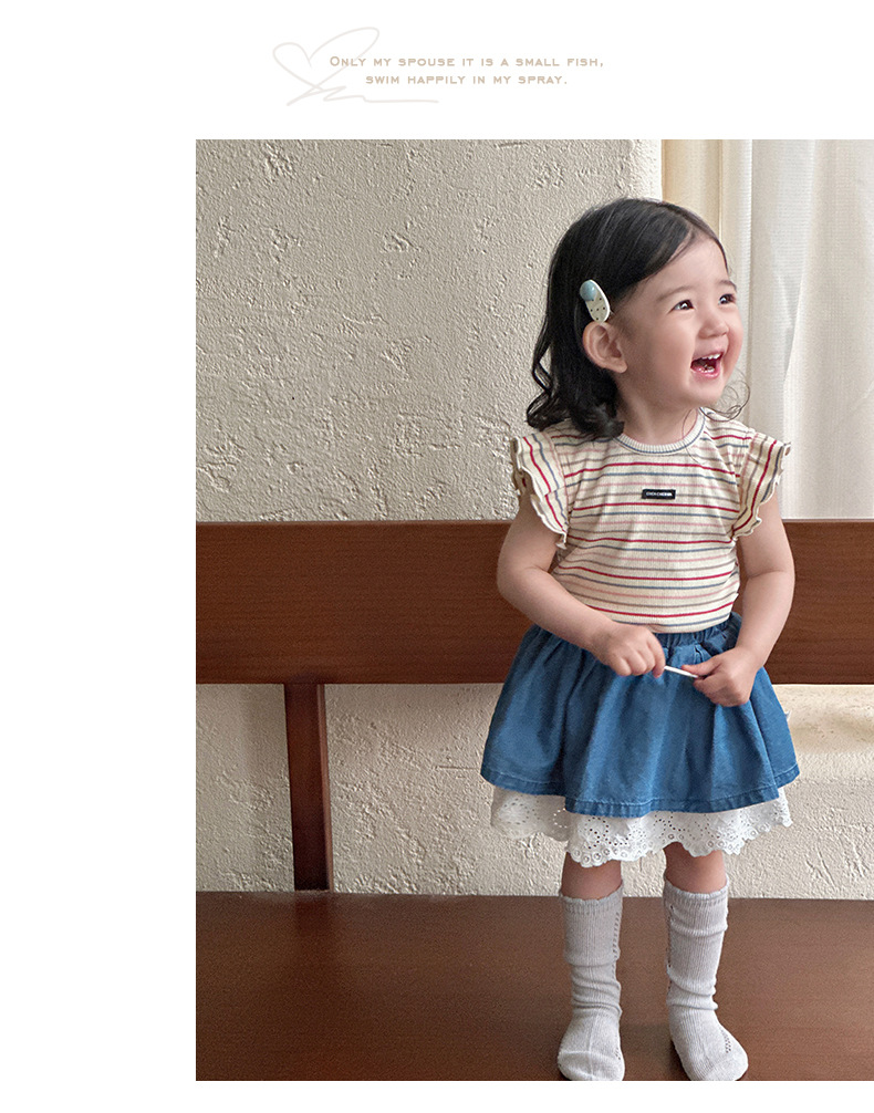 Traje pequeño de estilo occidental para bebés y niños pequeños 2025 verano nuevo estilo coreano delgado top a rayas falda de encaje de dos piezas