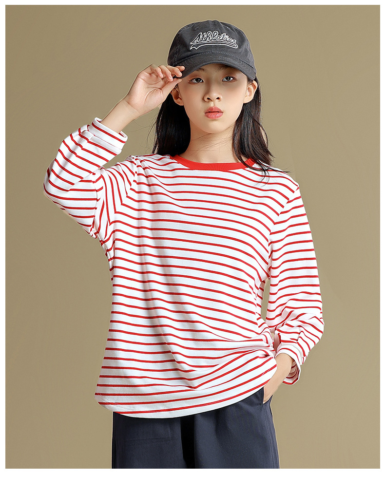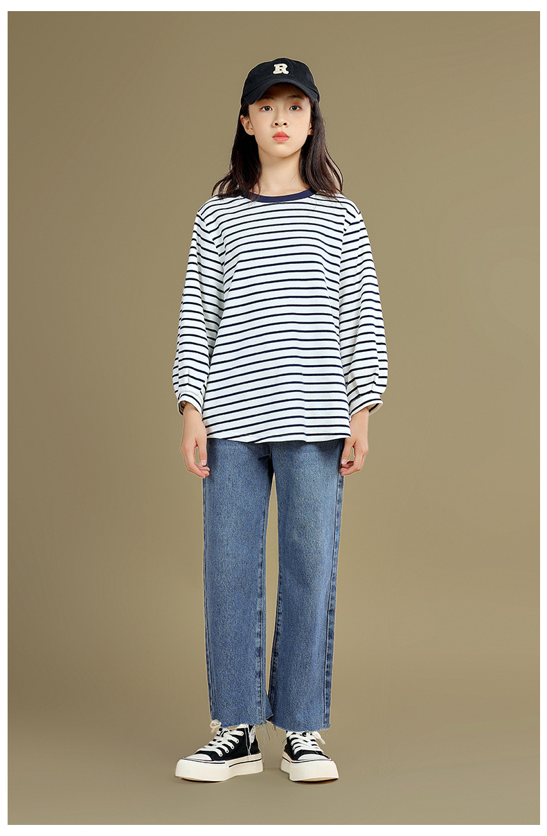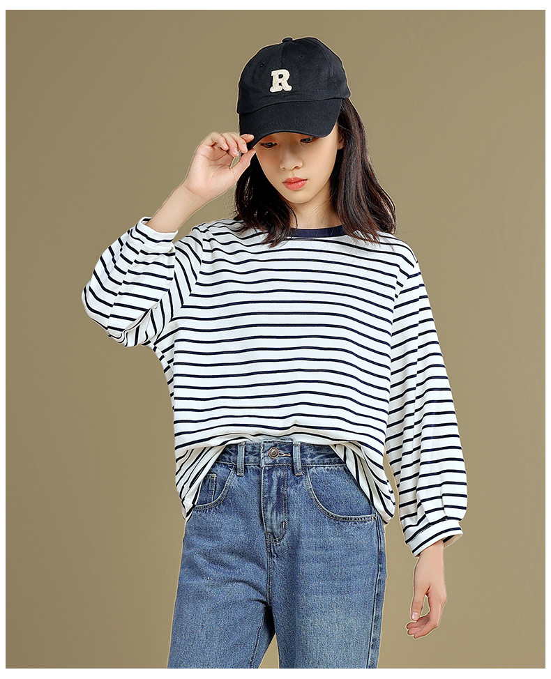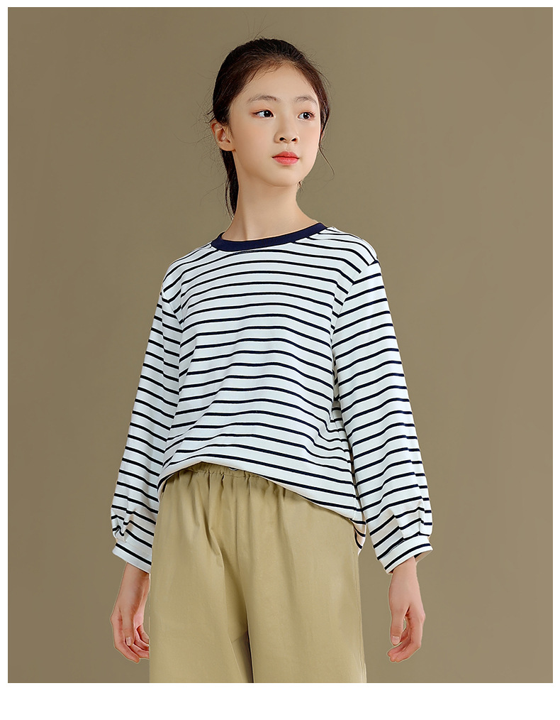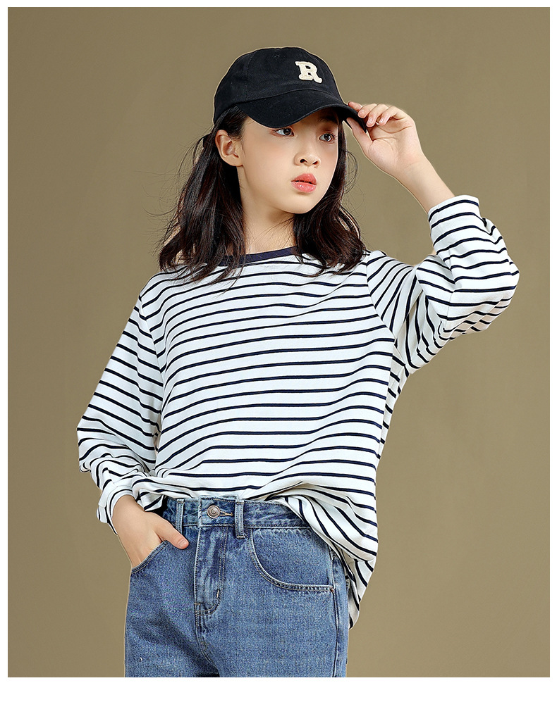 Camiseta de manga larga para niñas 2023 otoño nuevos niños medianos y grandes sueltos a rayas camisa de fondo delgada versátil cuello redondo superior