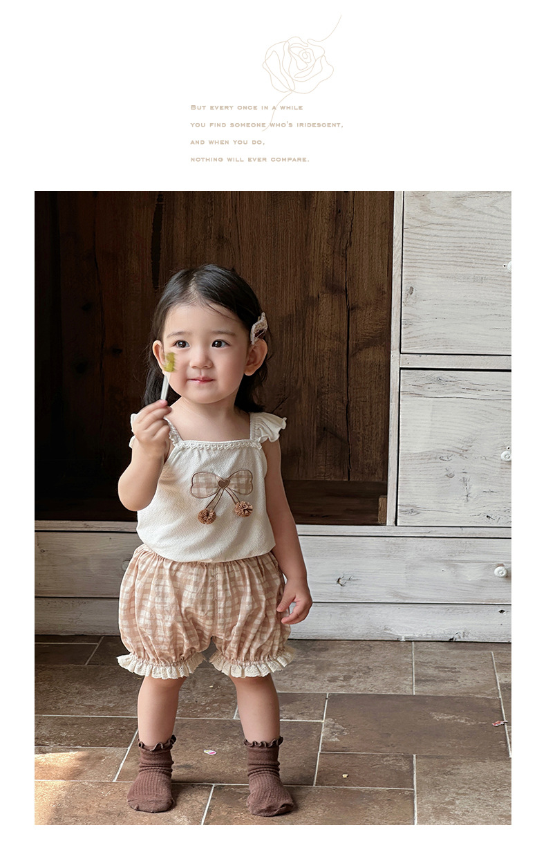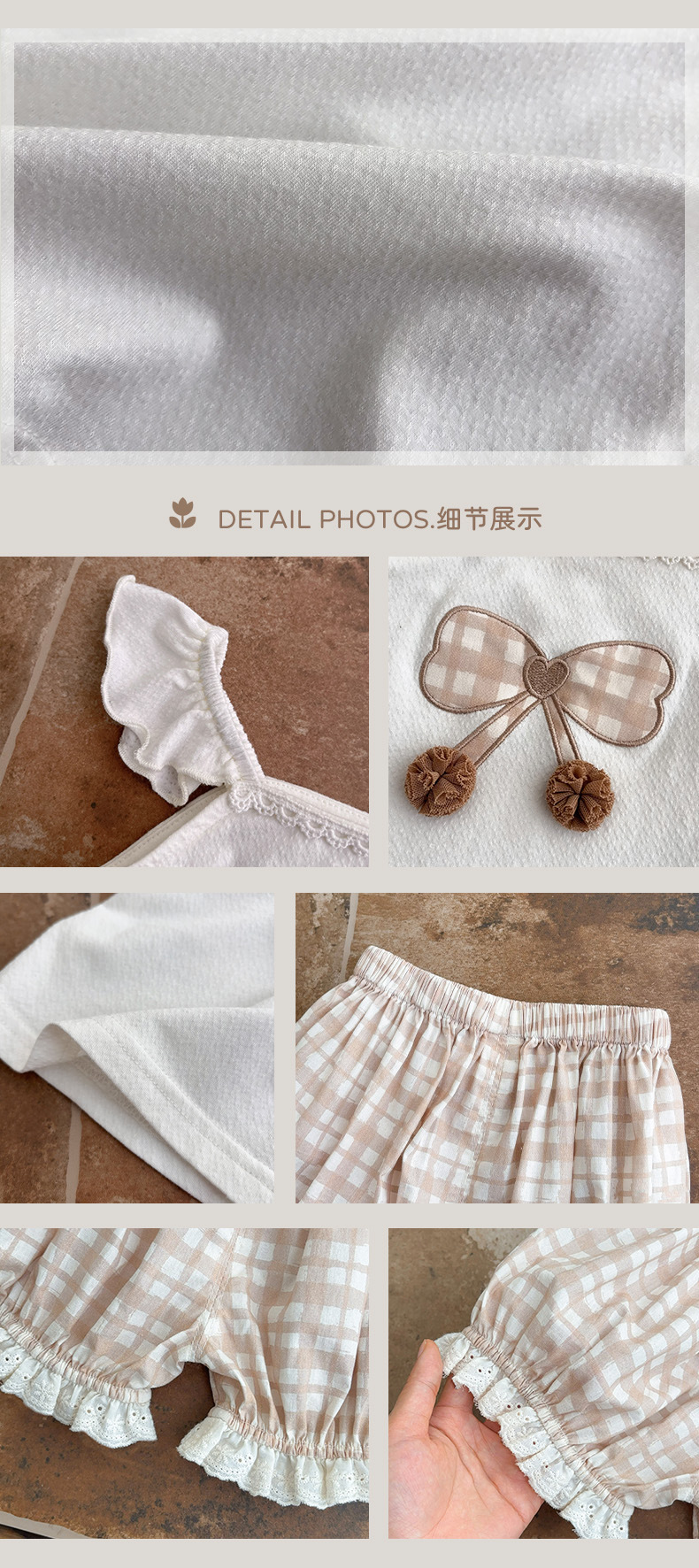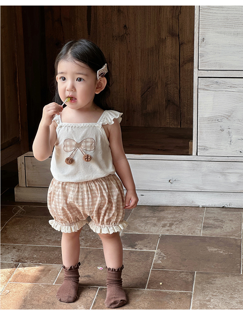 Traje de pantalones cortos a cuadros superior con mangas voladoras pequeñas para niñas 2025 verano nuevo estilo bebé traje de dos piezas de lazo coreano