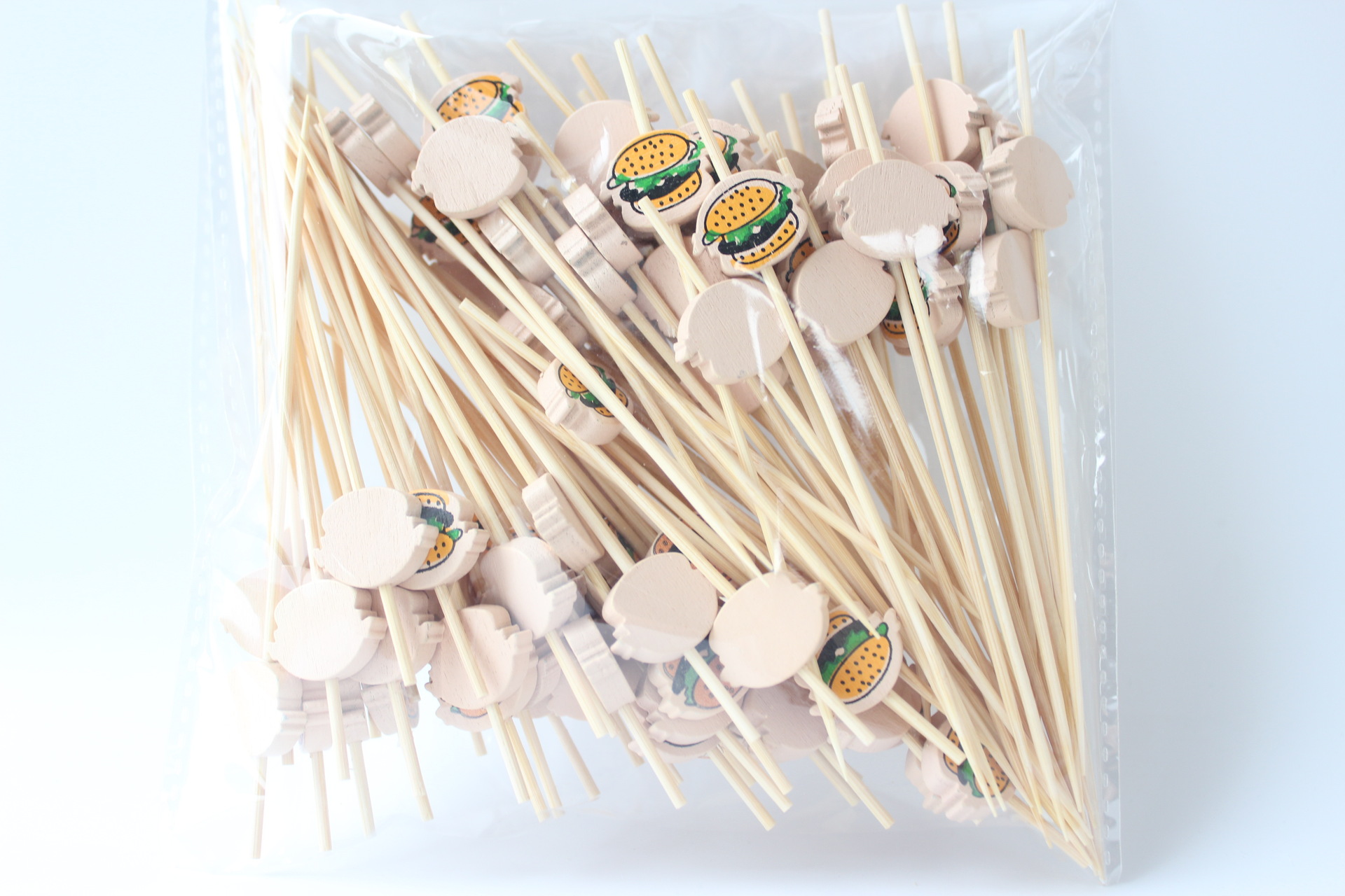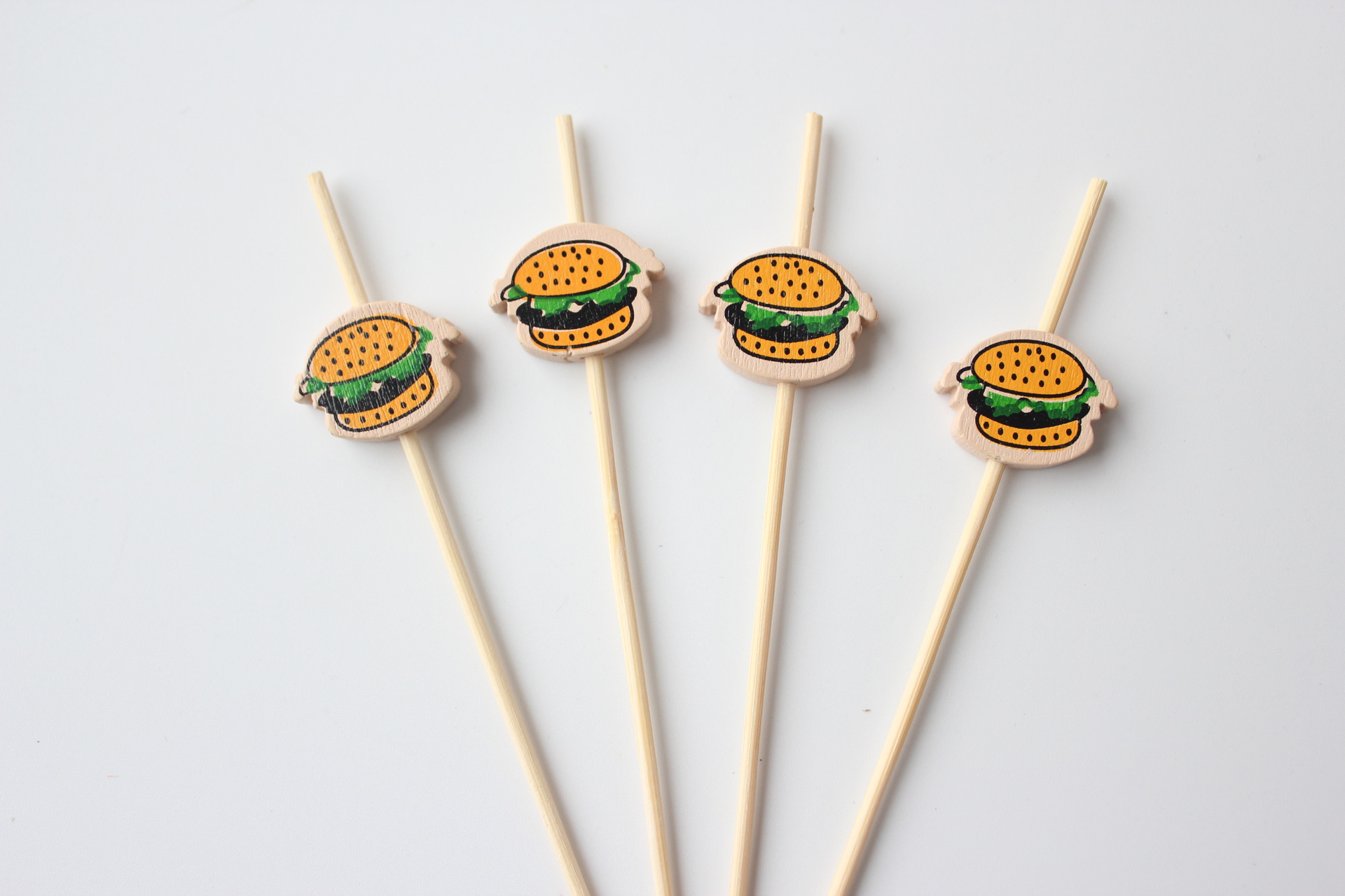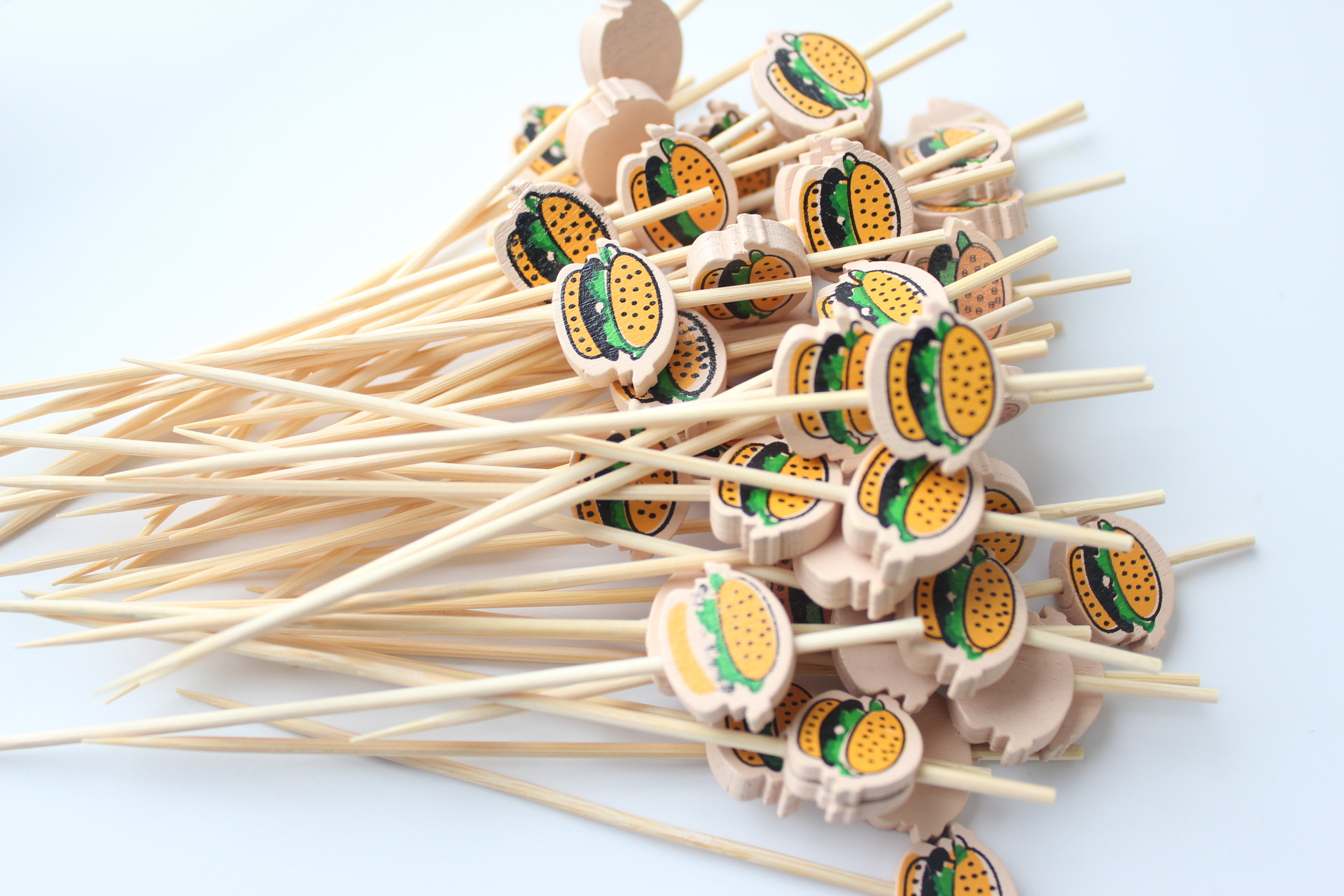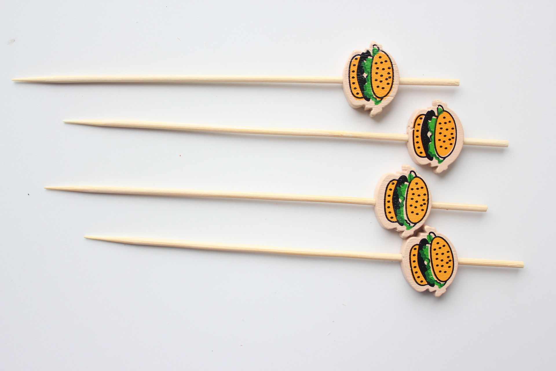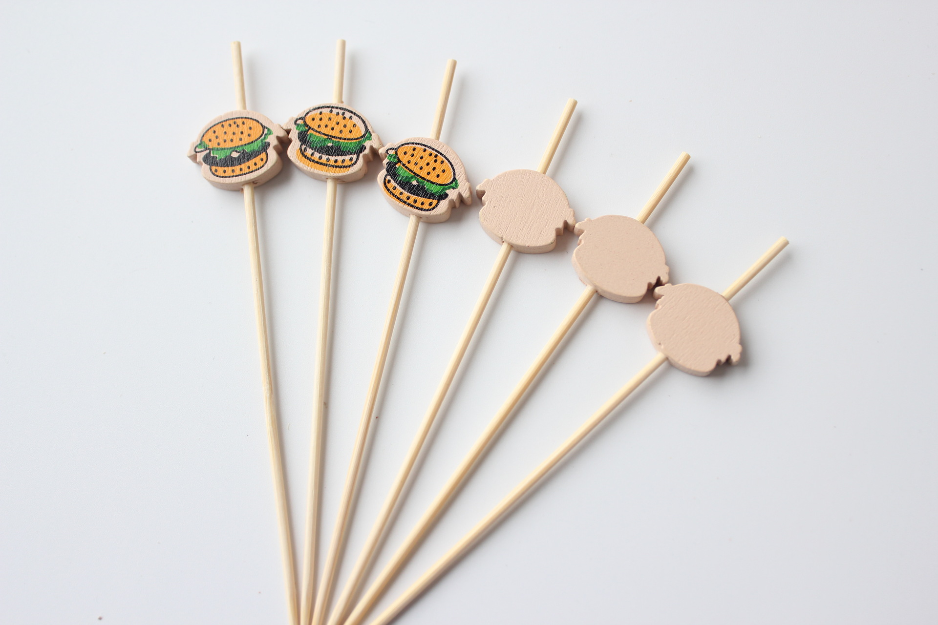 Directo de fábrica al por mayor creativo fruta palo fruta enchufe desechable bambú niños dibujos animados hamburguesa fija cóctel decorativo