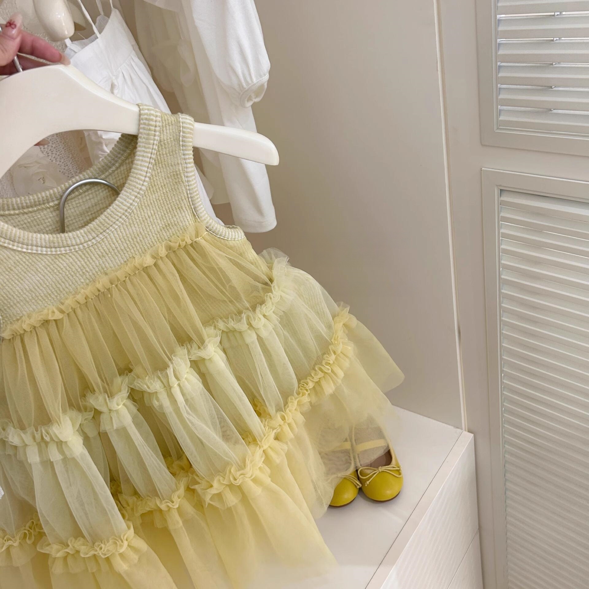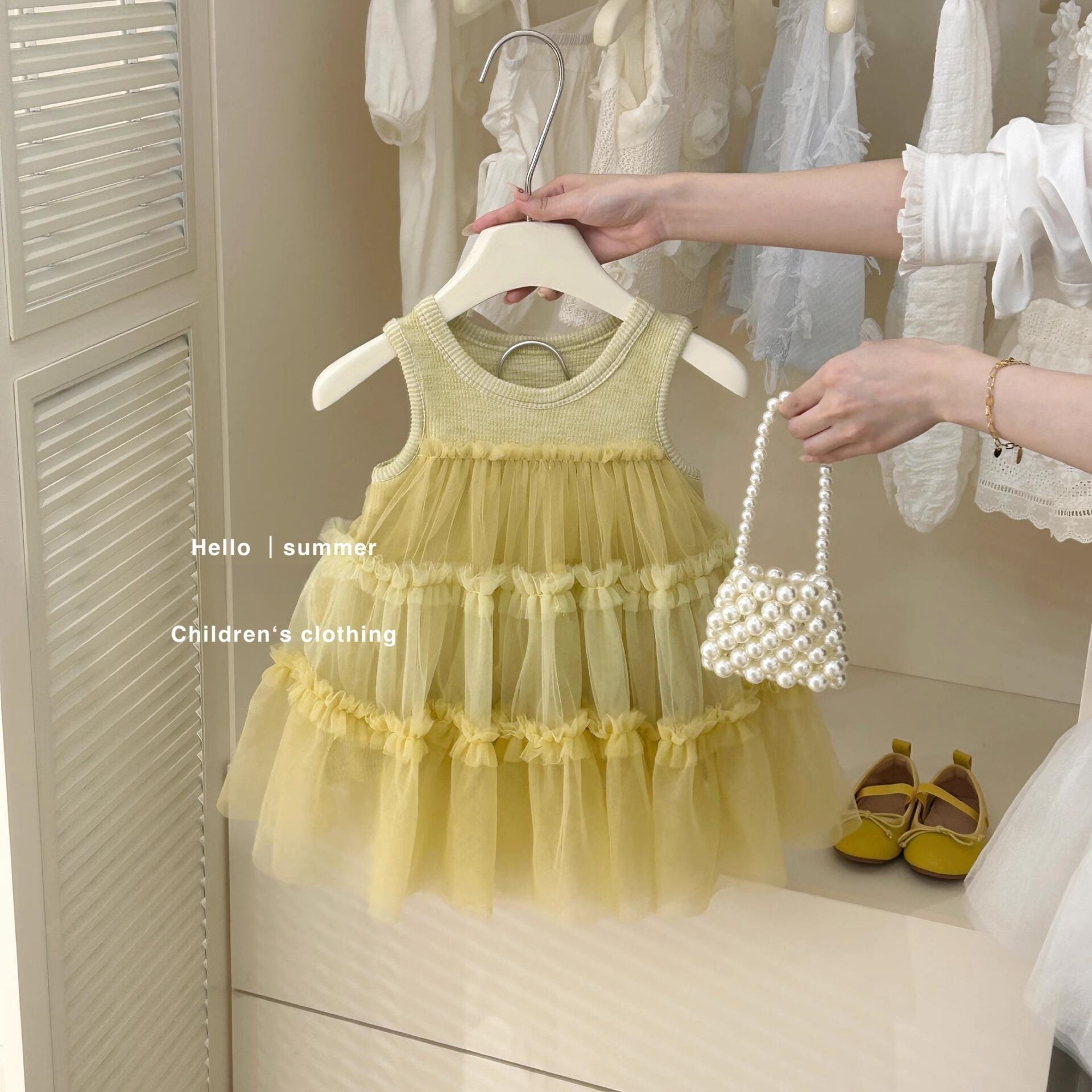 [Xianning Seven] Vestido de chaleco de costura de malla para niñas coreanas Falda larga de hadas Vestido de princesa de estilo occidental para bebés