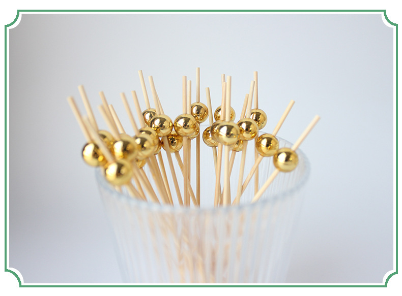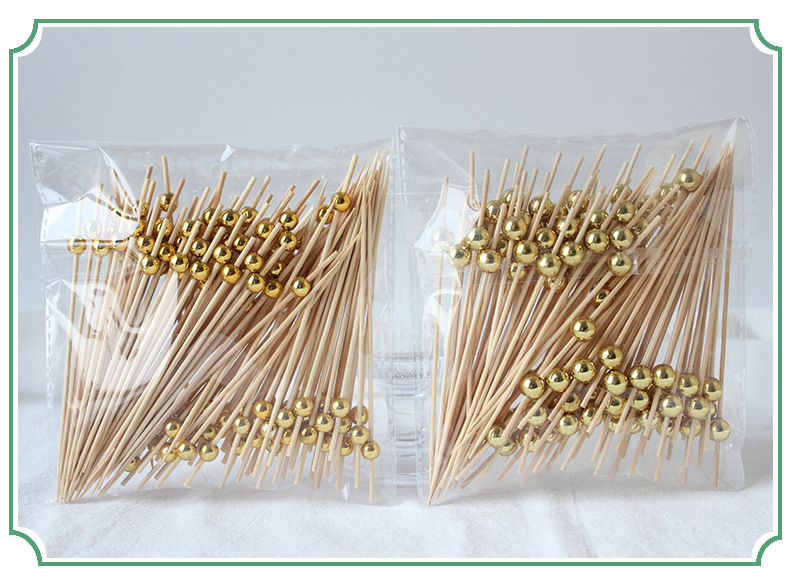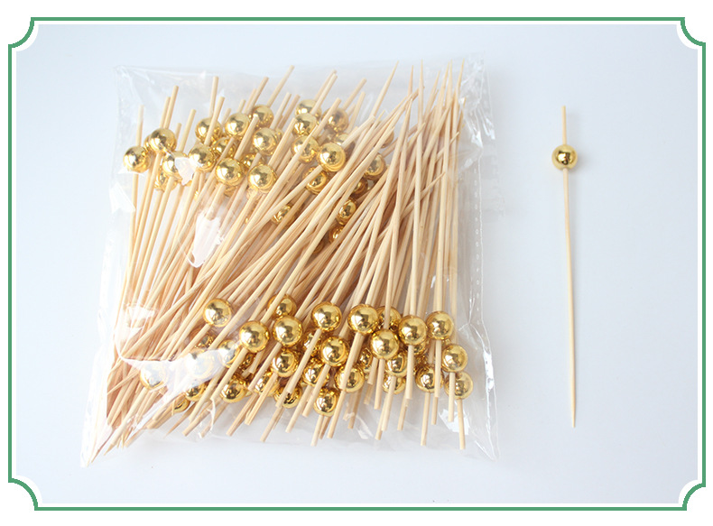 Amazon 100 pcs/paquete de brochetas de frutas con cuentas doradas galvanizadas tenedor de frutas de bambú decorativo desechable brochetas creativas