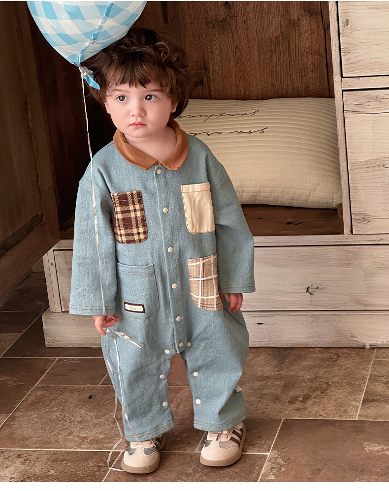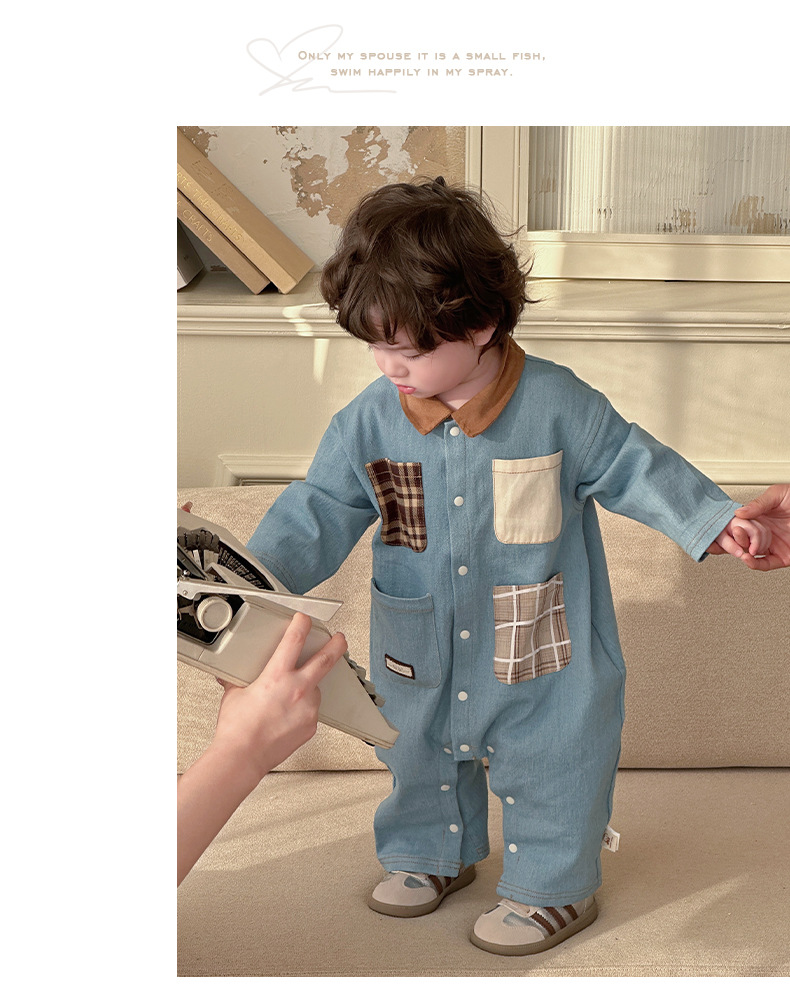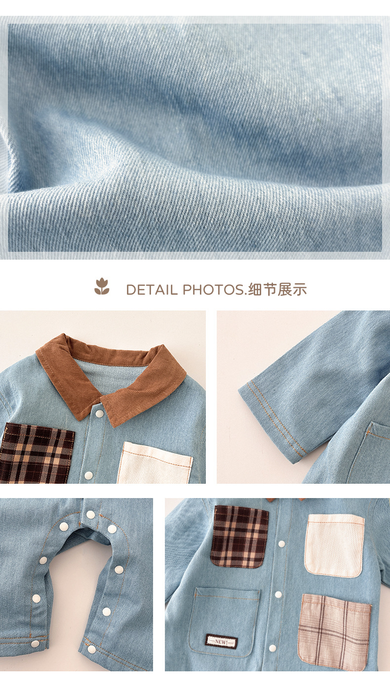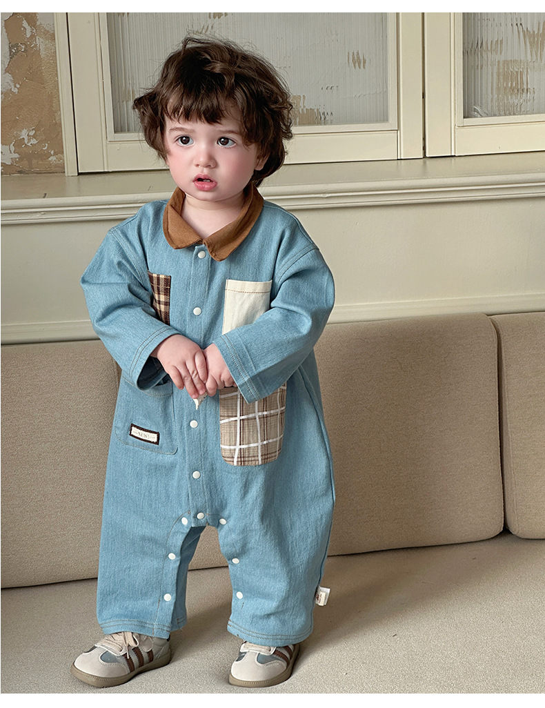 Primavera nuevo estilo bebé mono hombre bebé estilo occidental casual solapa de manga larga mameluco ropa de casa para salir gatear