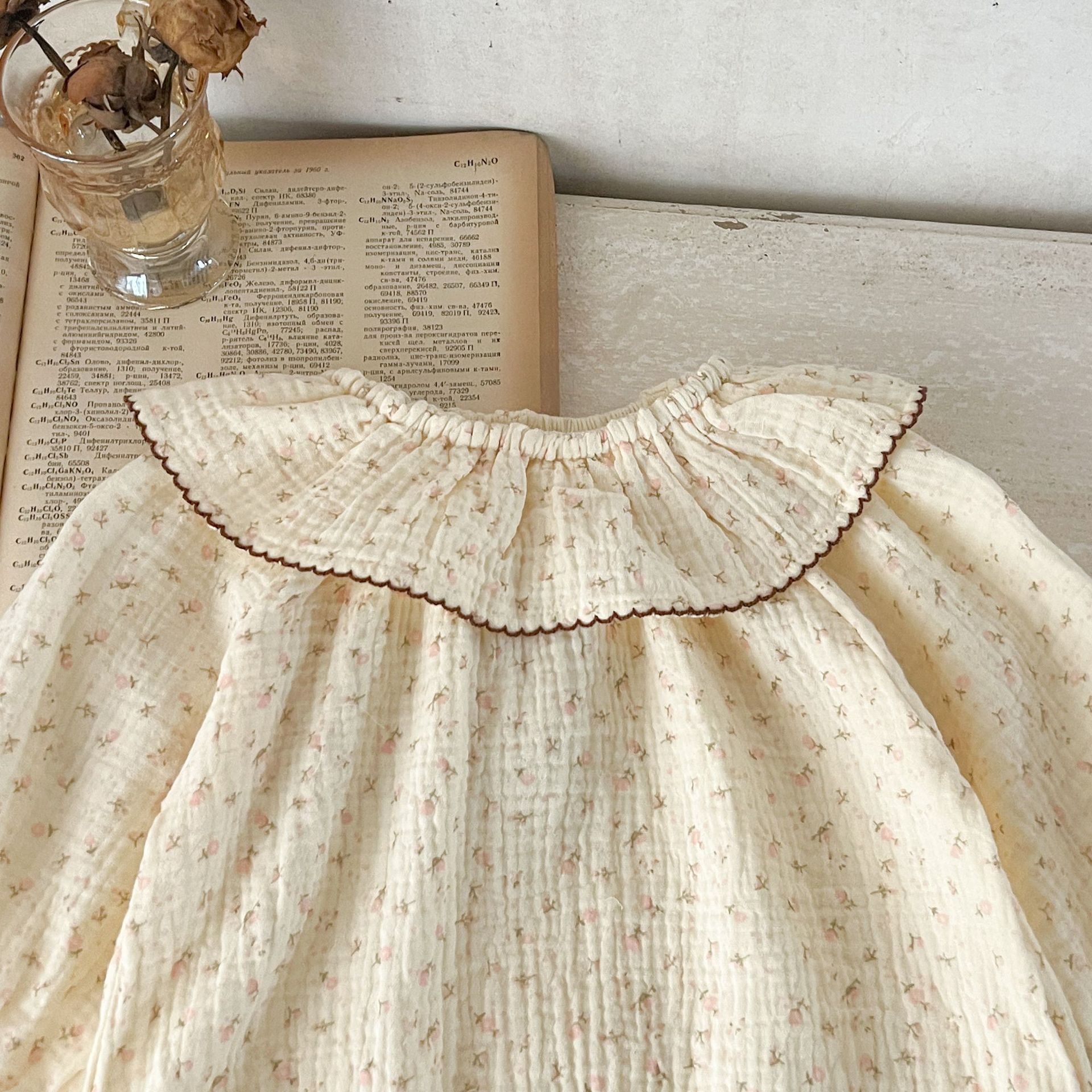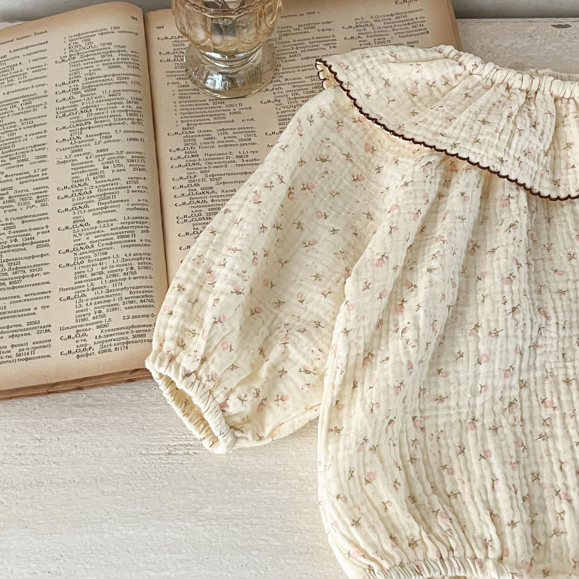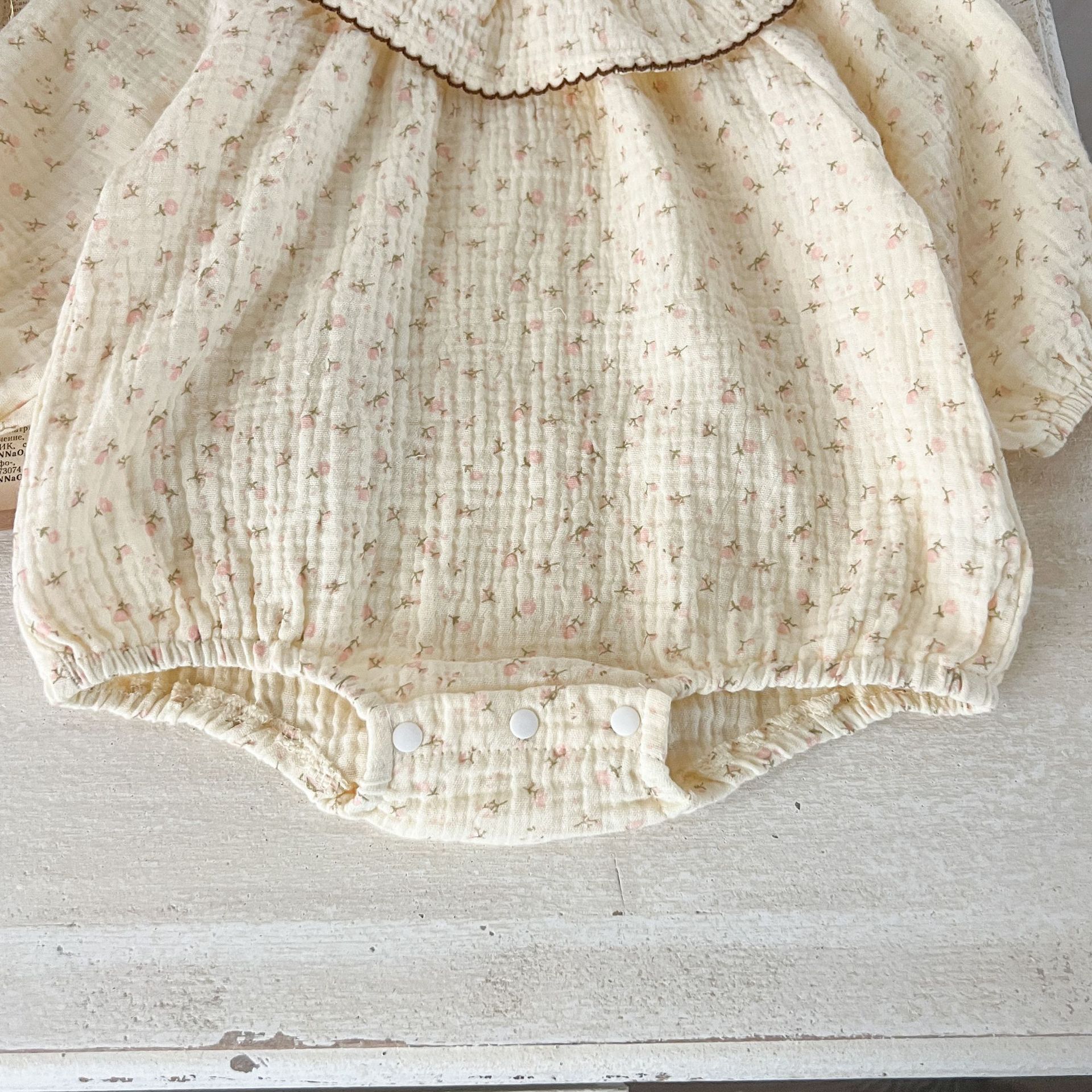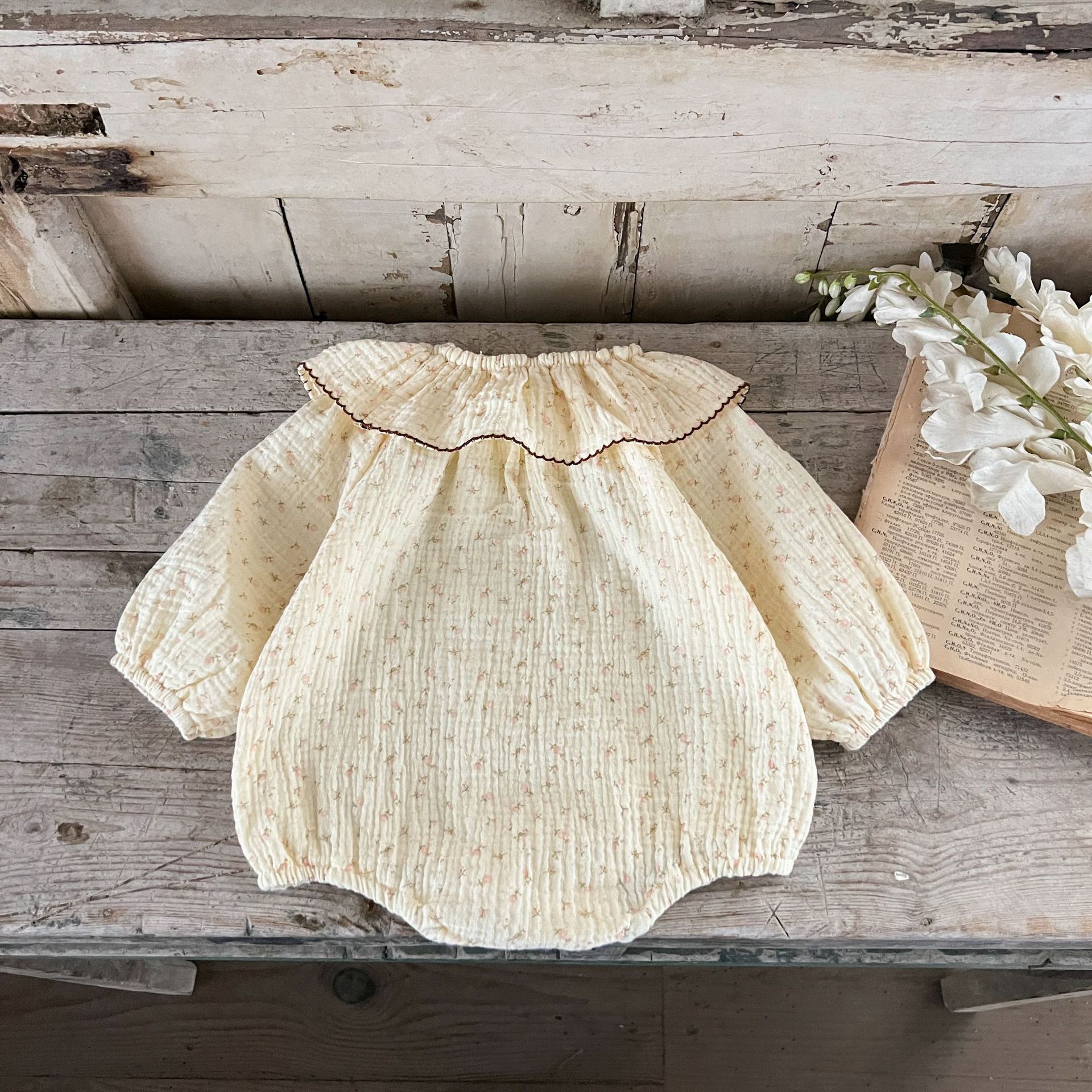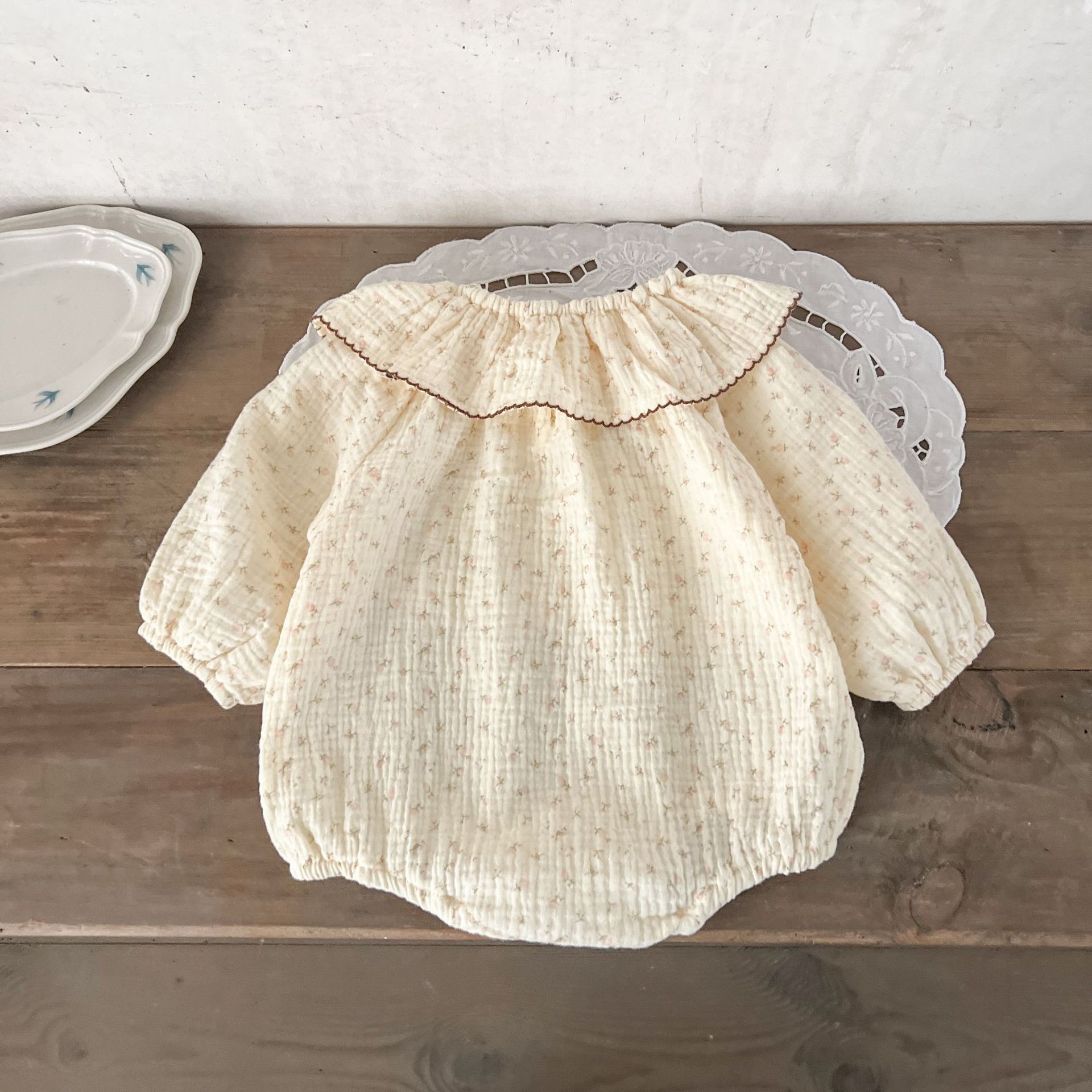 Ins coreano niña bebé algodón de doble capa arrugado cuello de hoja de loto floral mameluco de color de contraste mameluco recién nacido
