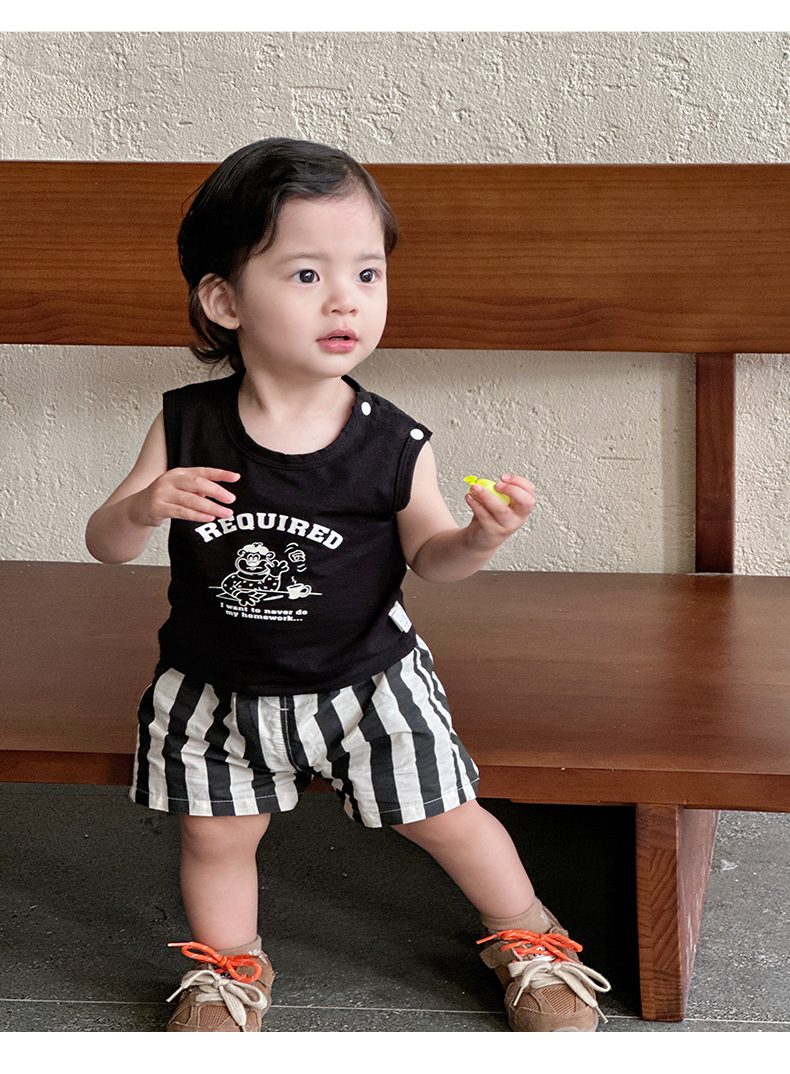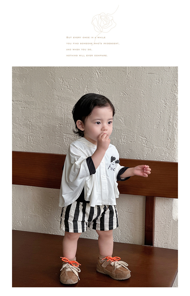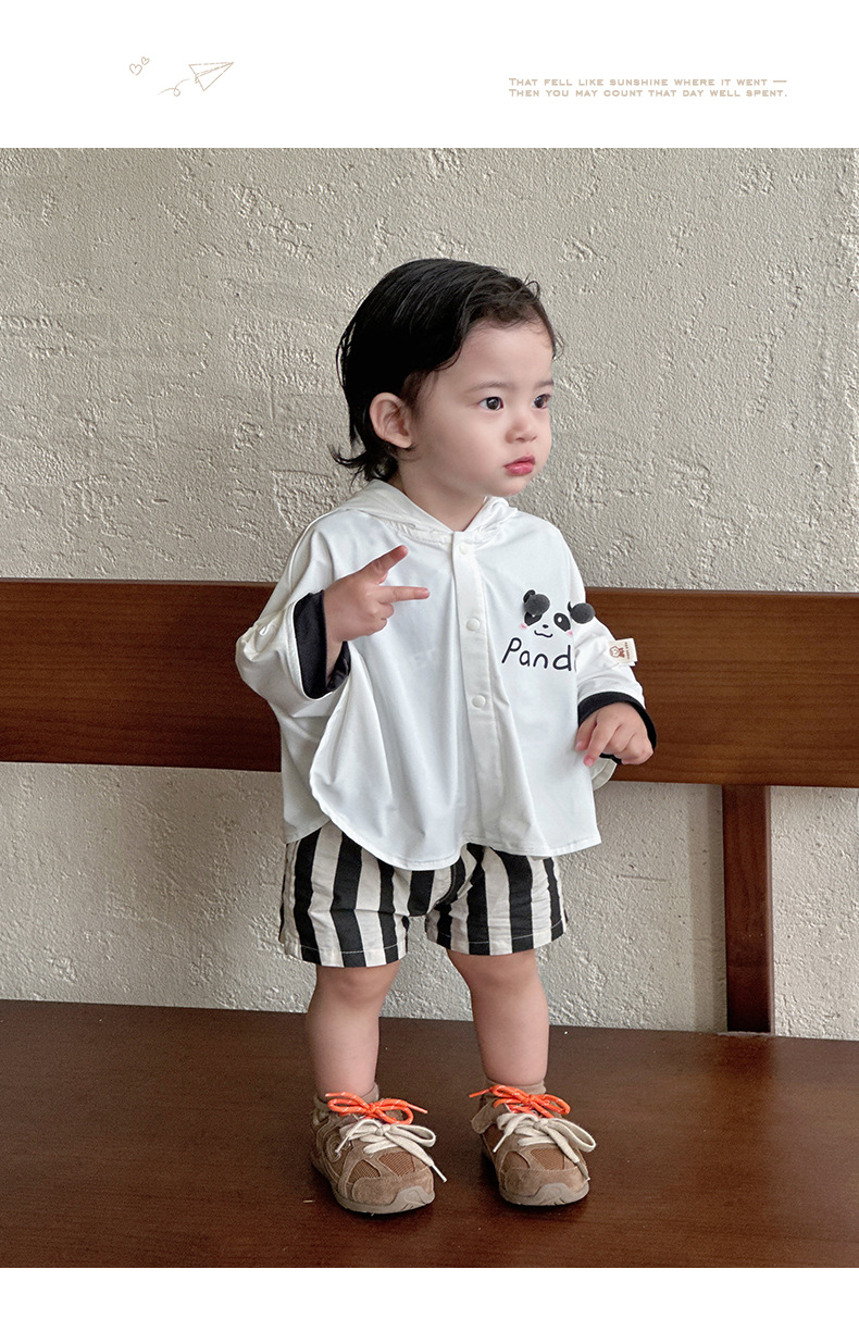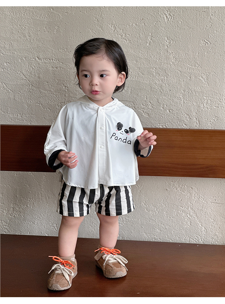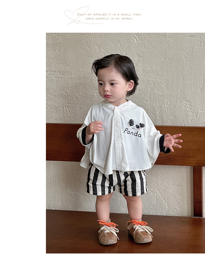 Traje de estilo coreano pequeño chaleco de bebé de verano con pantalones cortos a rayas, lindo juego de tres piezas de capa de panda