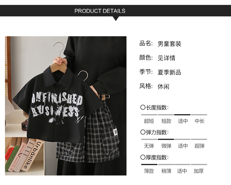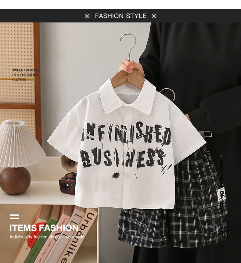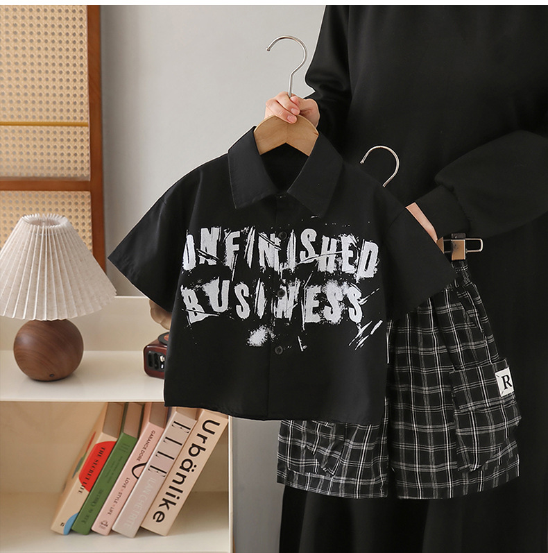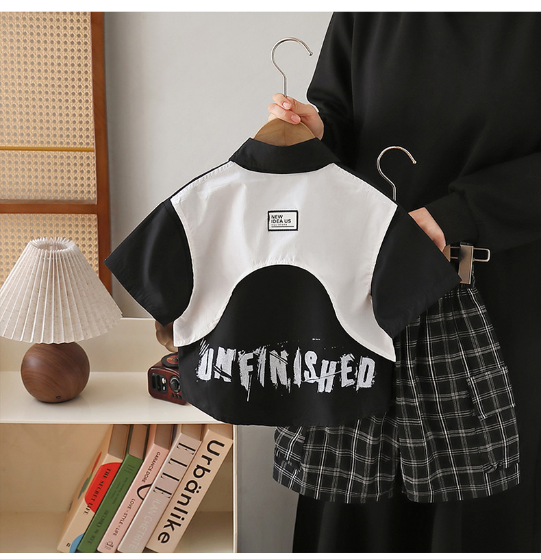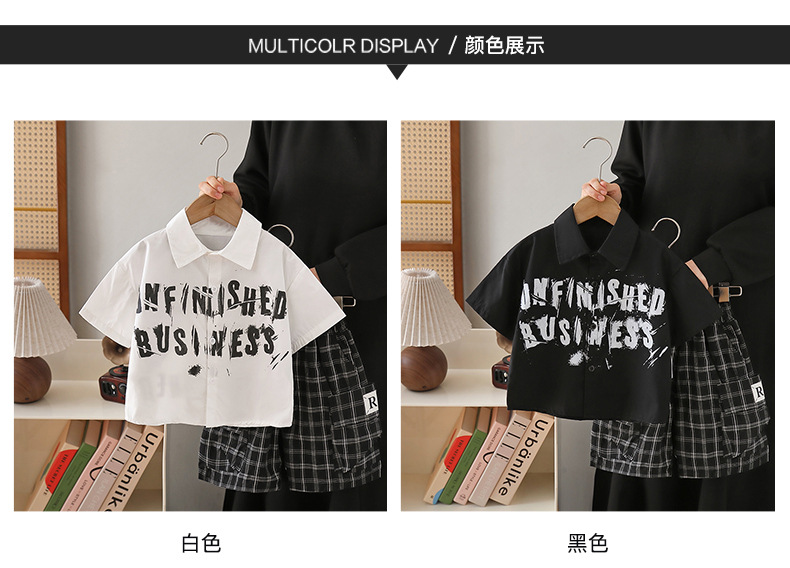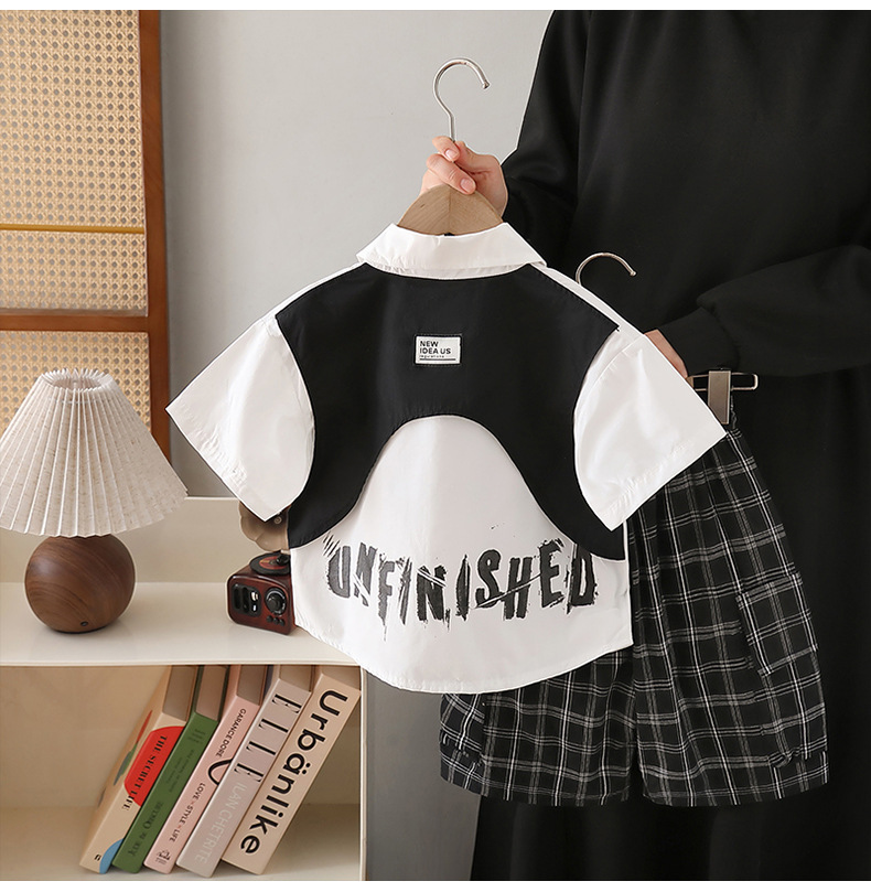 7195 traje de verano para niños y niñas 2025 nueva camisa falsa de dos piezas para niños de manga corta ropa fina de verano de dos piezas