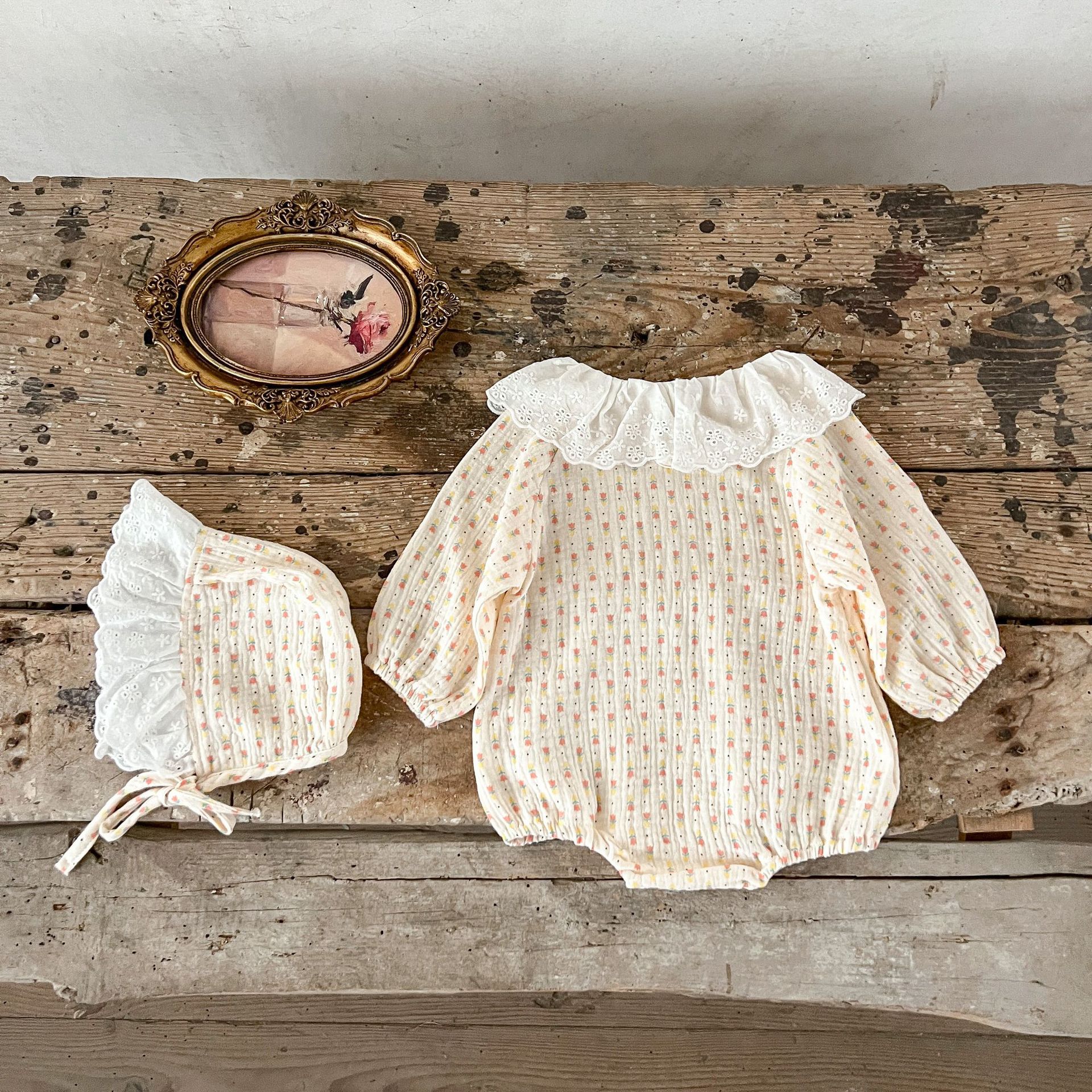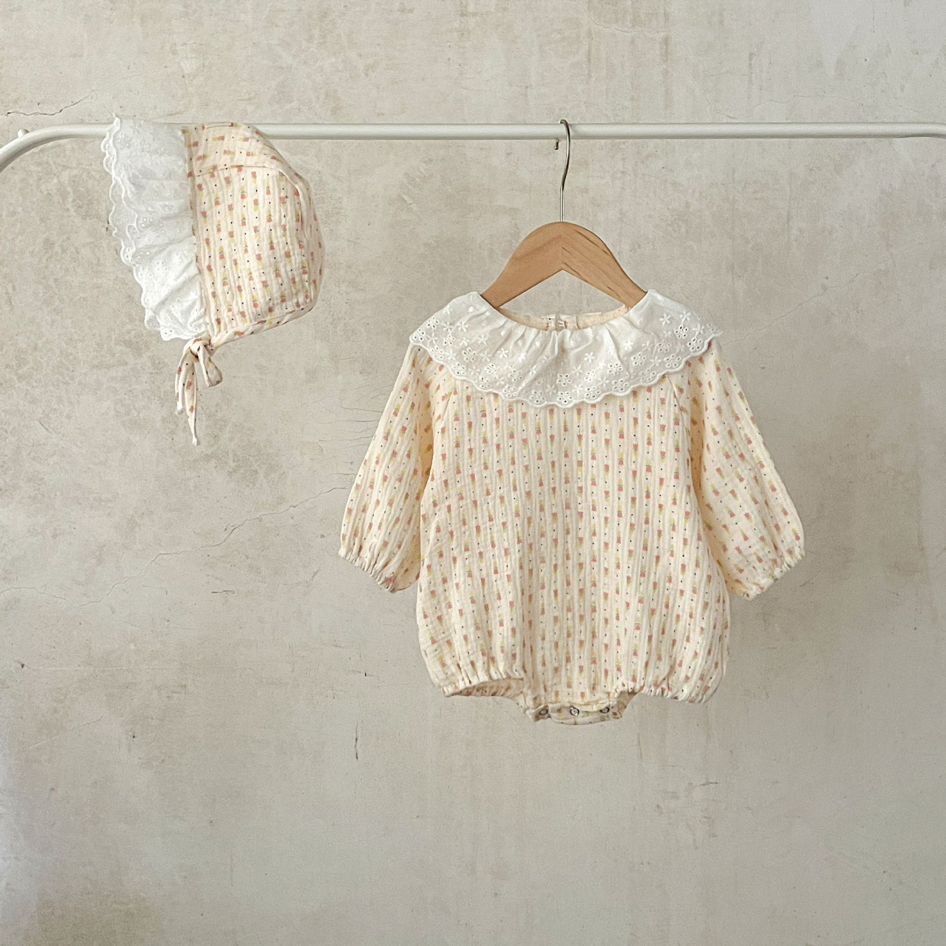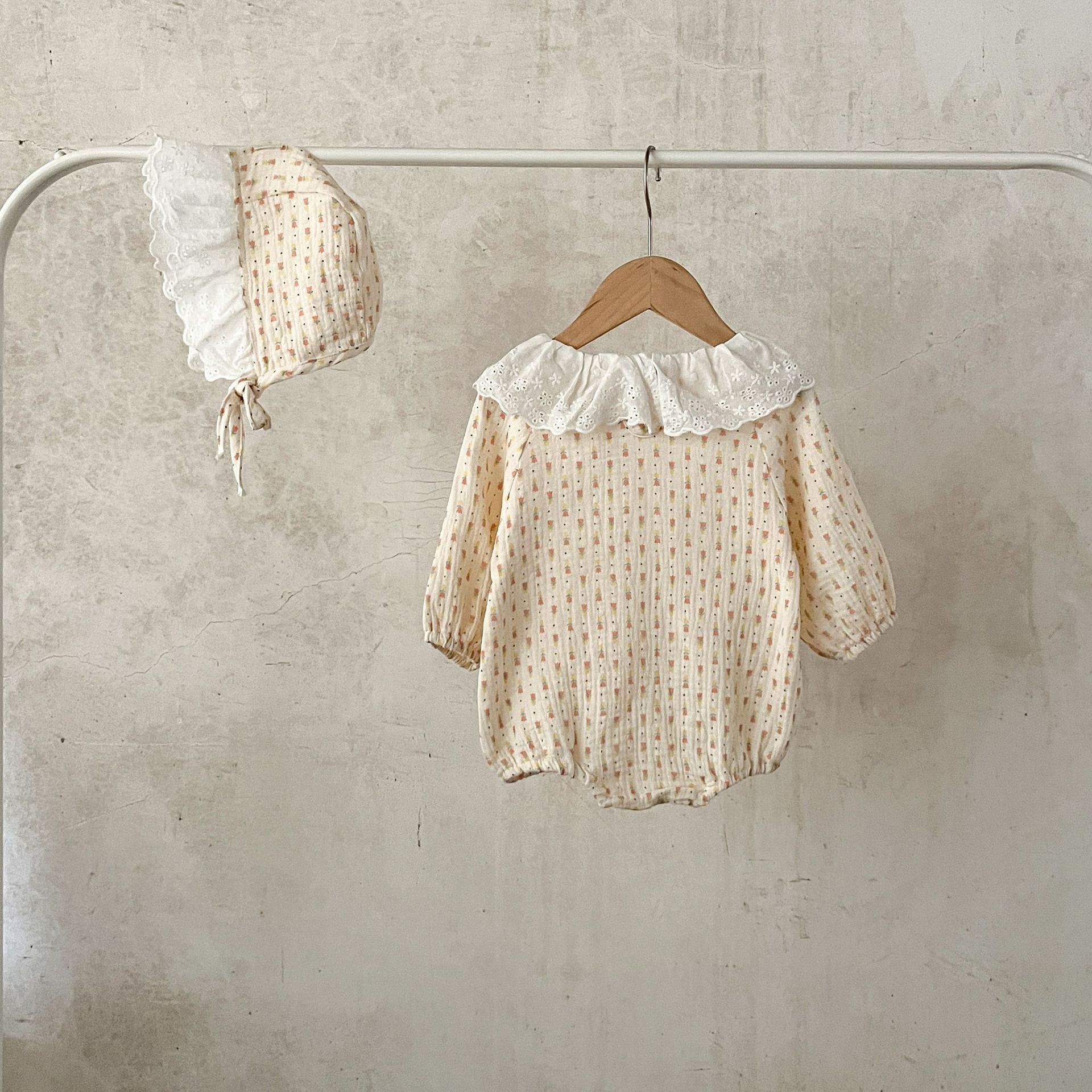 INS estilo coreano collar de encaje de bebé para niñas zanahoria impreso algodón suelto de doble capa mameluco de gasa para sombrero gratis moda