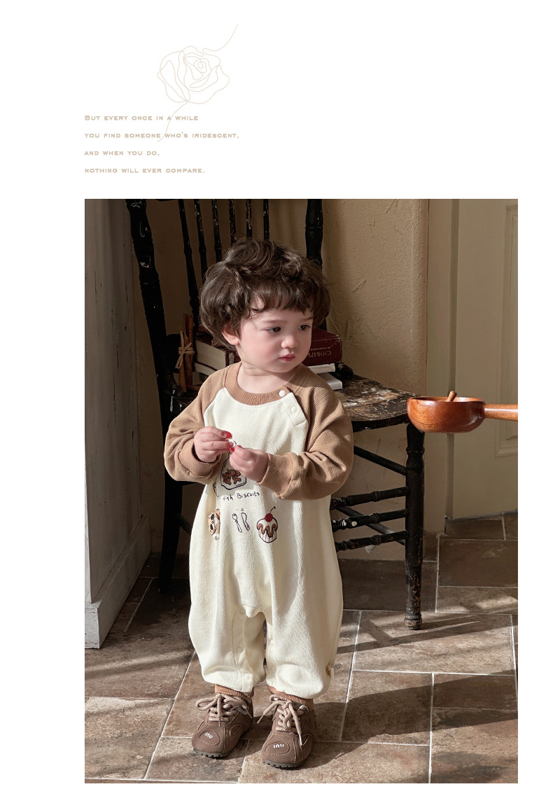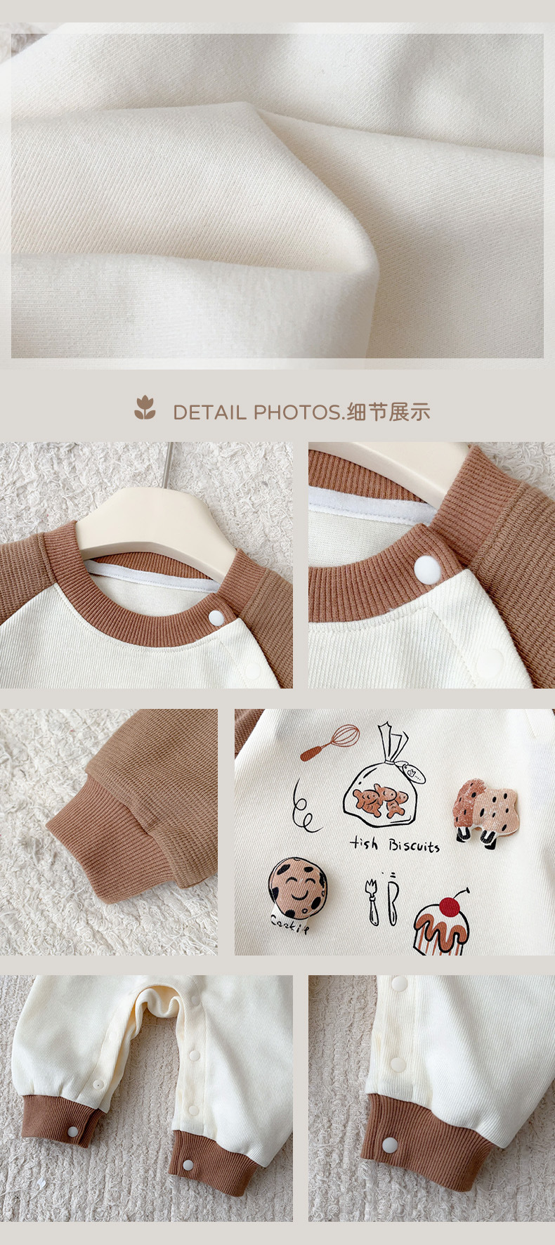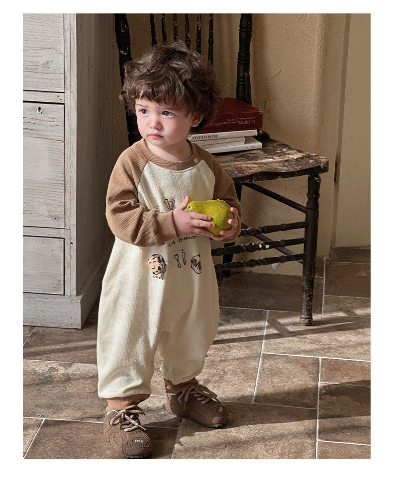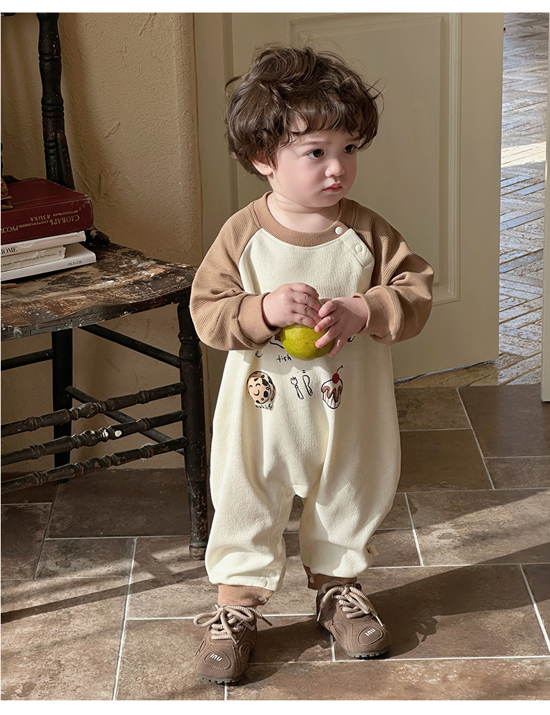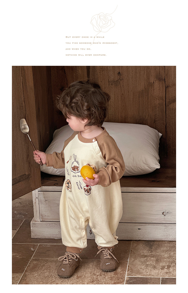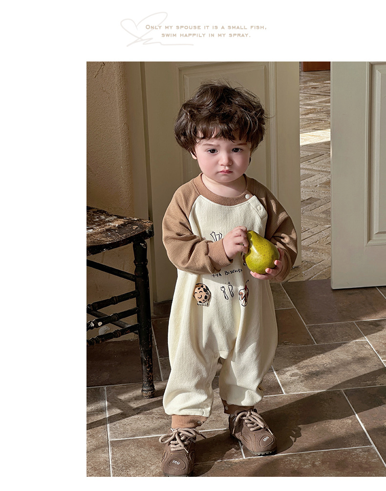 Nuevos productos en la primavera de 2025, monos para bebés masculinos coreanos, galletas de graffiti, ropa de gatear de manga larga para bebés y niños pequeños de estilo occidental