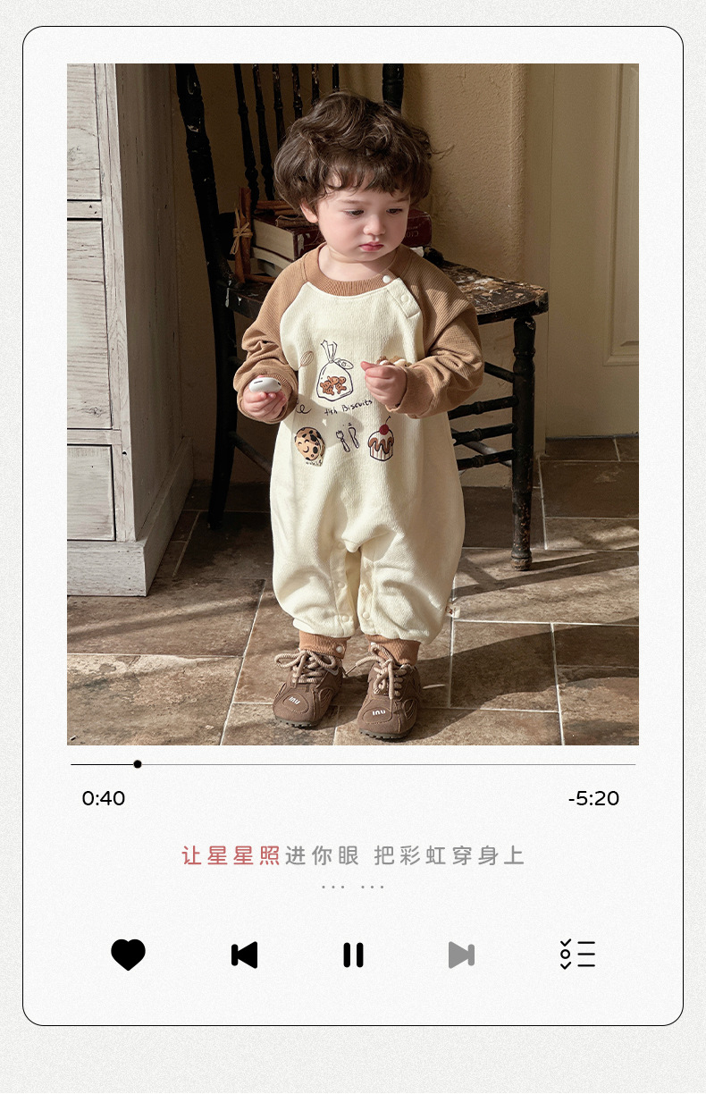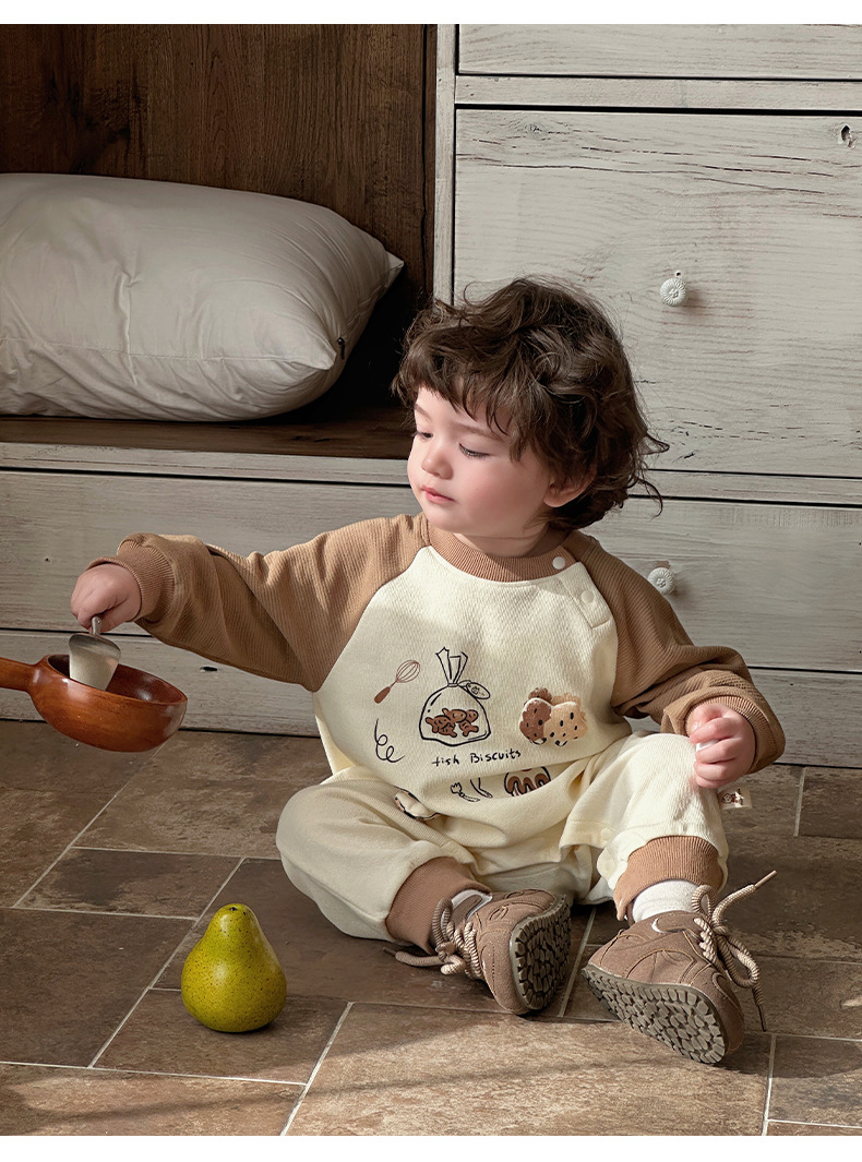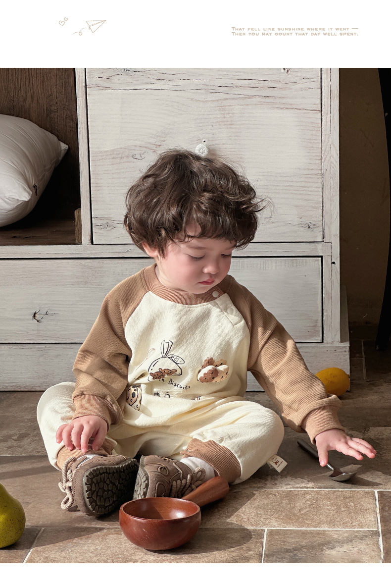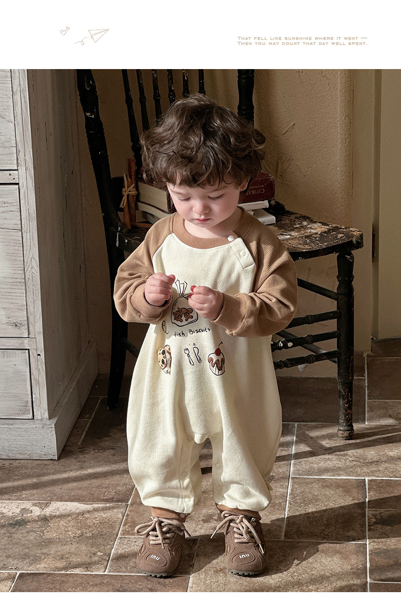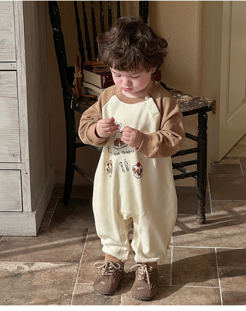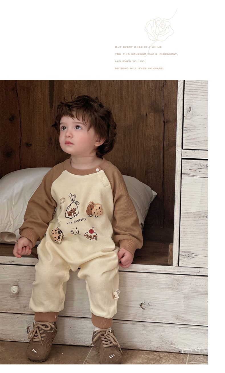 Nuevos productos en la primavera de 2025, monos para bebés masculinos coreanos, galletas de graffiti, ropa de gatear de manga larga para bebés y niños pequeños de estilo occidental