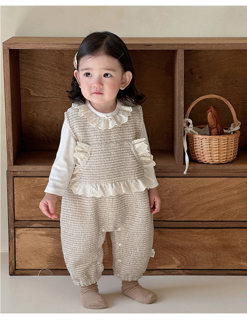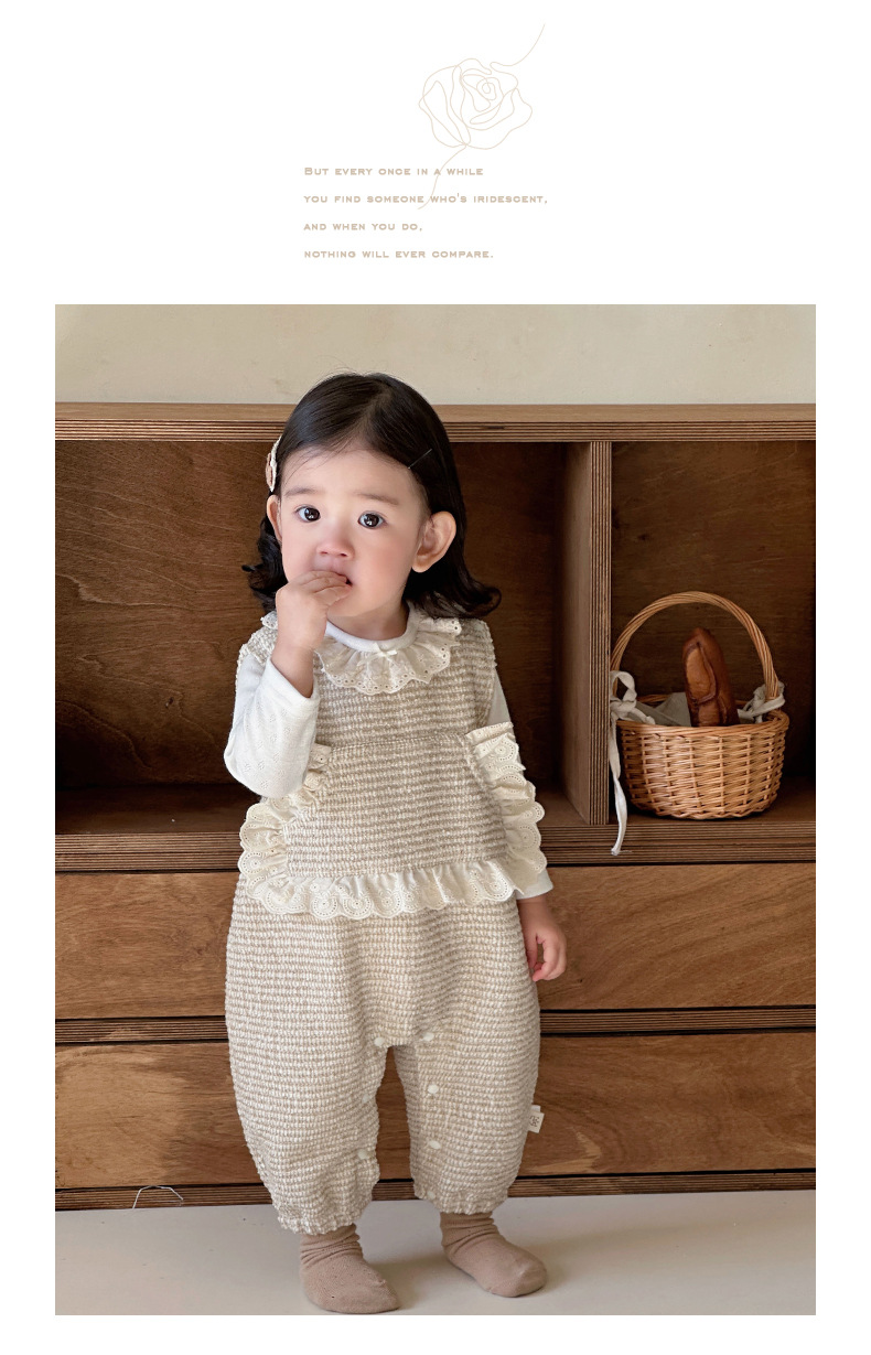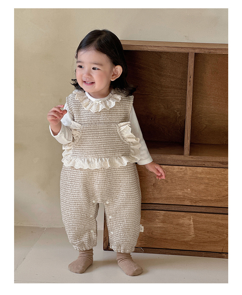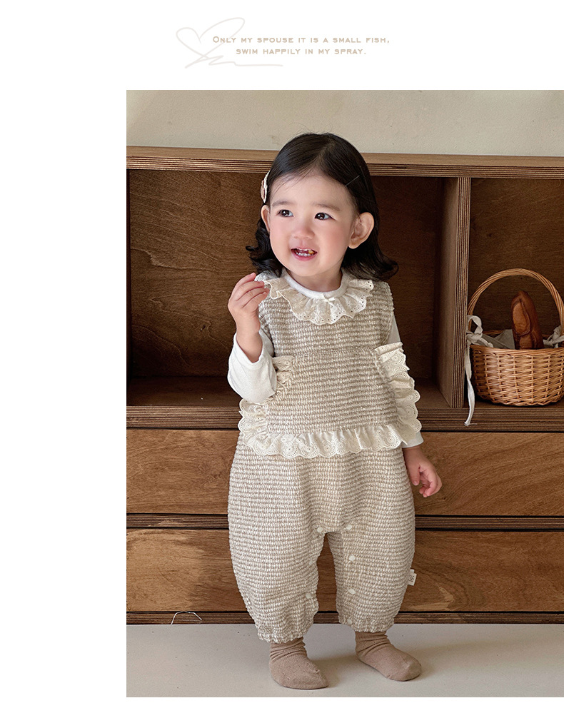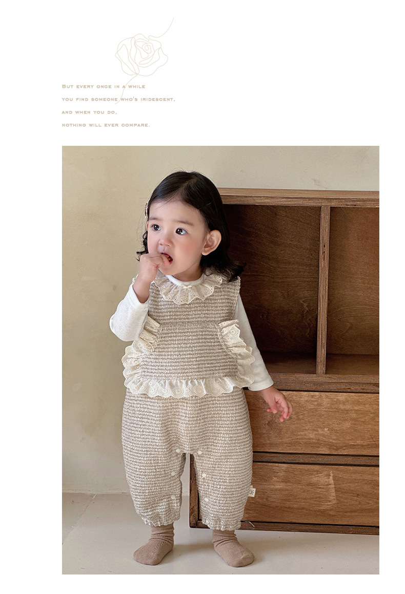 2025 primavera y otoño nuevo producto coreano traje ropa para bebés dulce camisa de fondo de encaje hueco mono de dos piezas