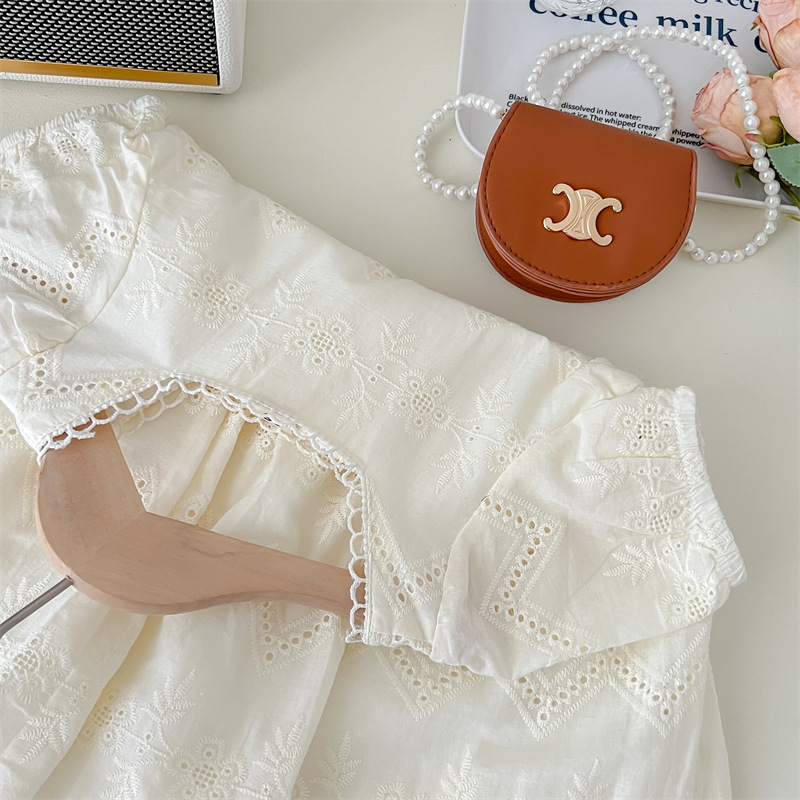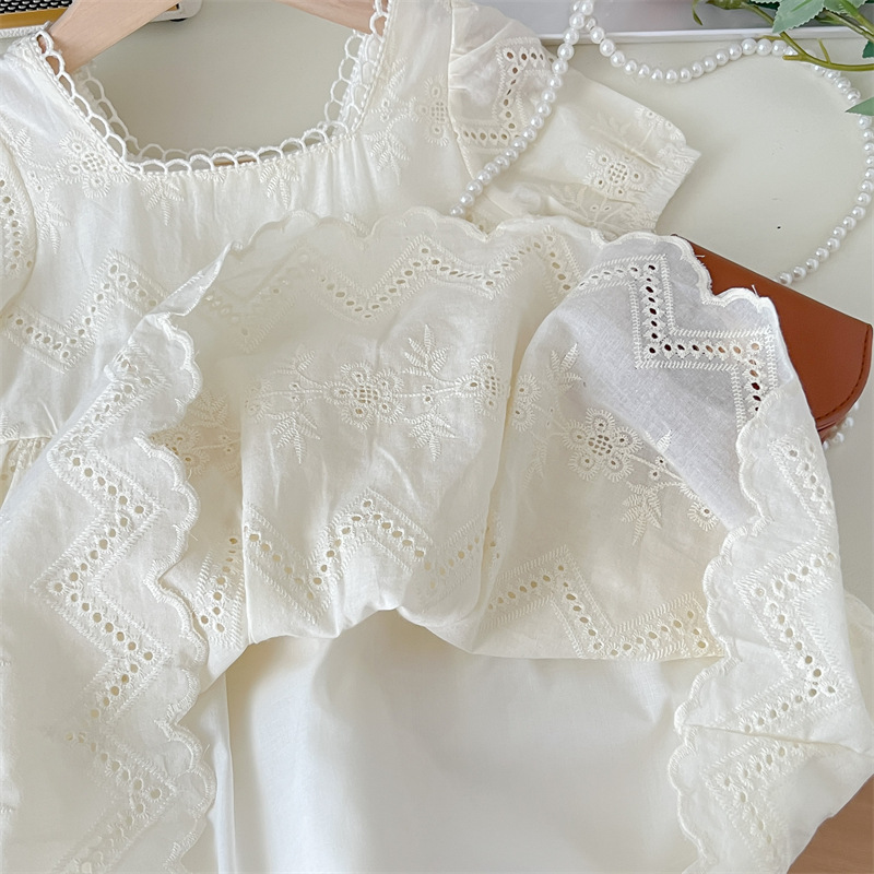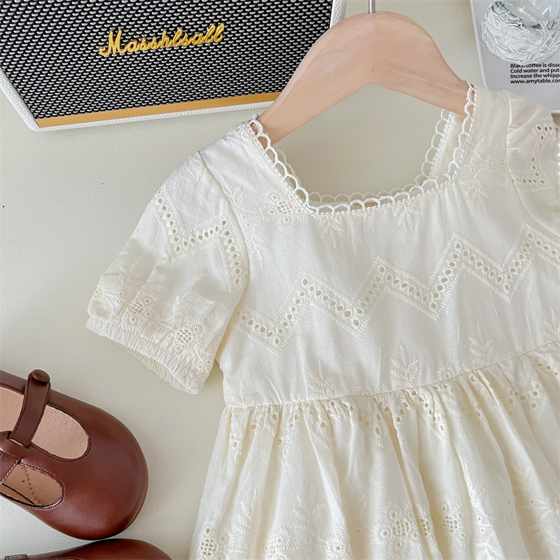 Versión coreana del vestido de manga abullonada hueca de las niñas de estilo occidental verano 2025 nuevo encaje de manga corta falda de verano para niños