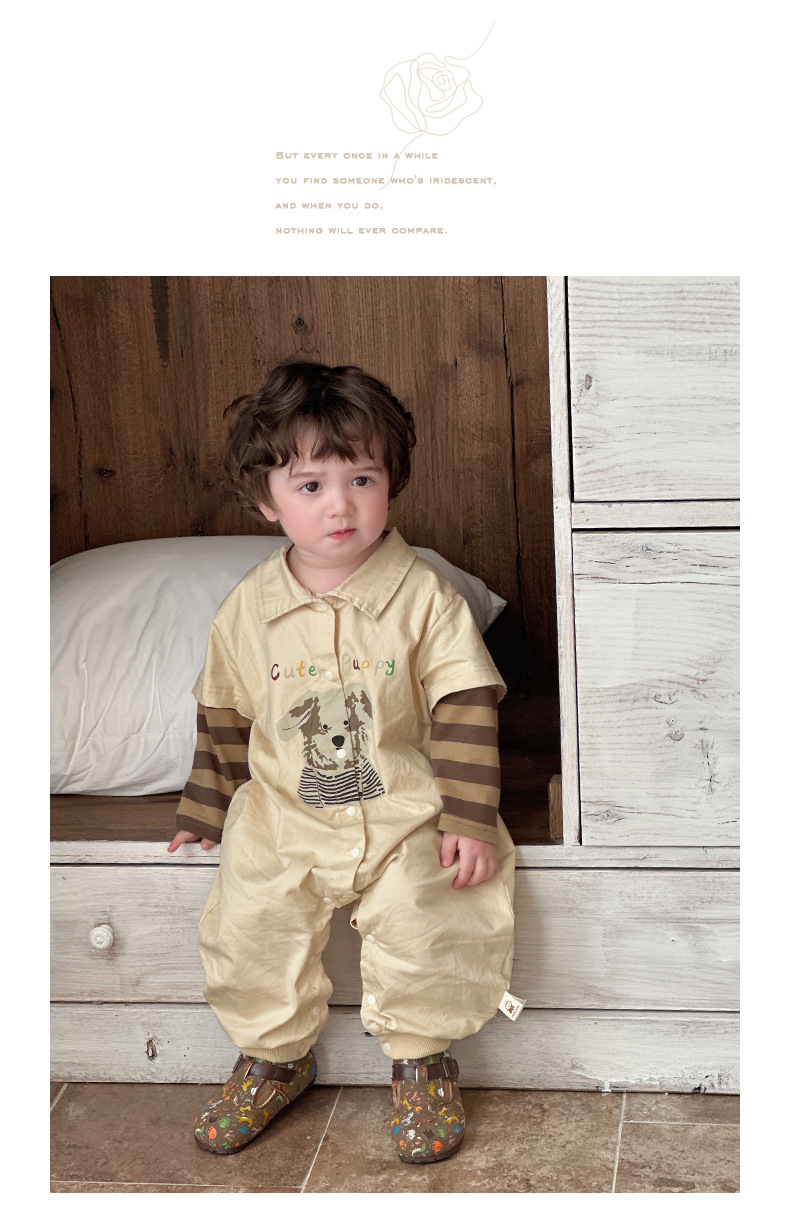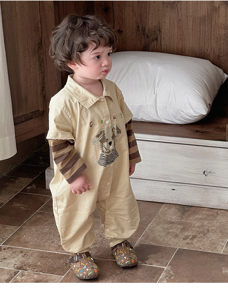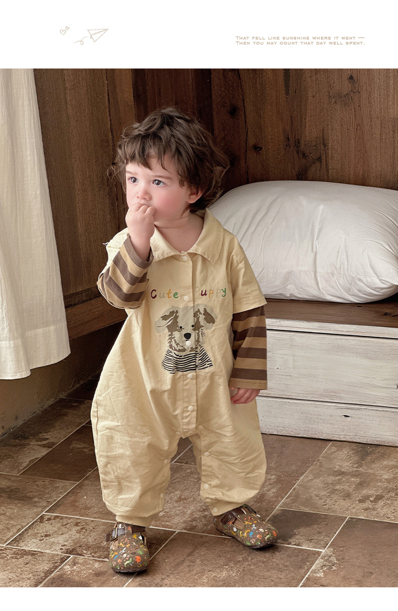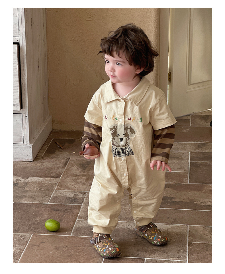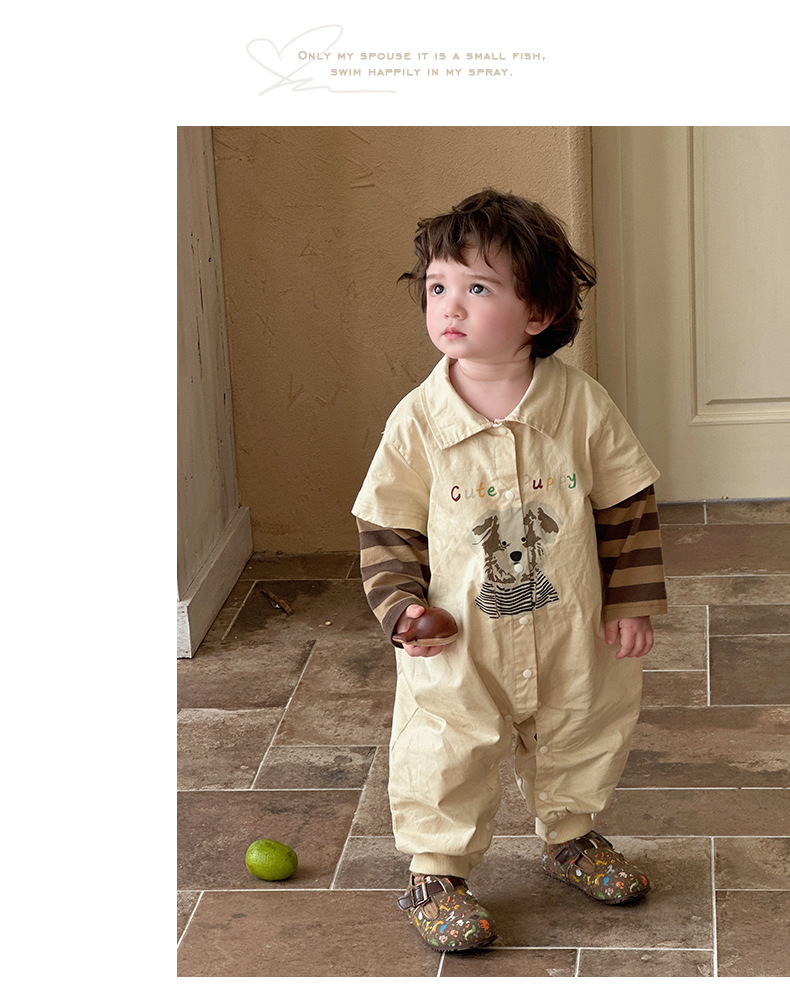 Primavera nuevo bebé mono hombre bebé estilo occidental solapa casual falso dos dibujos animados cachorro salir gateando