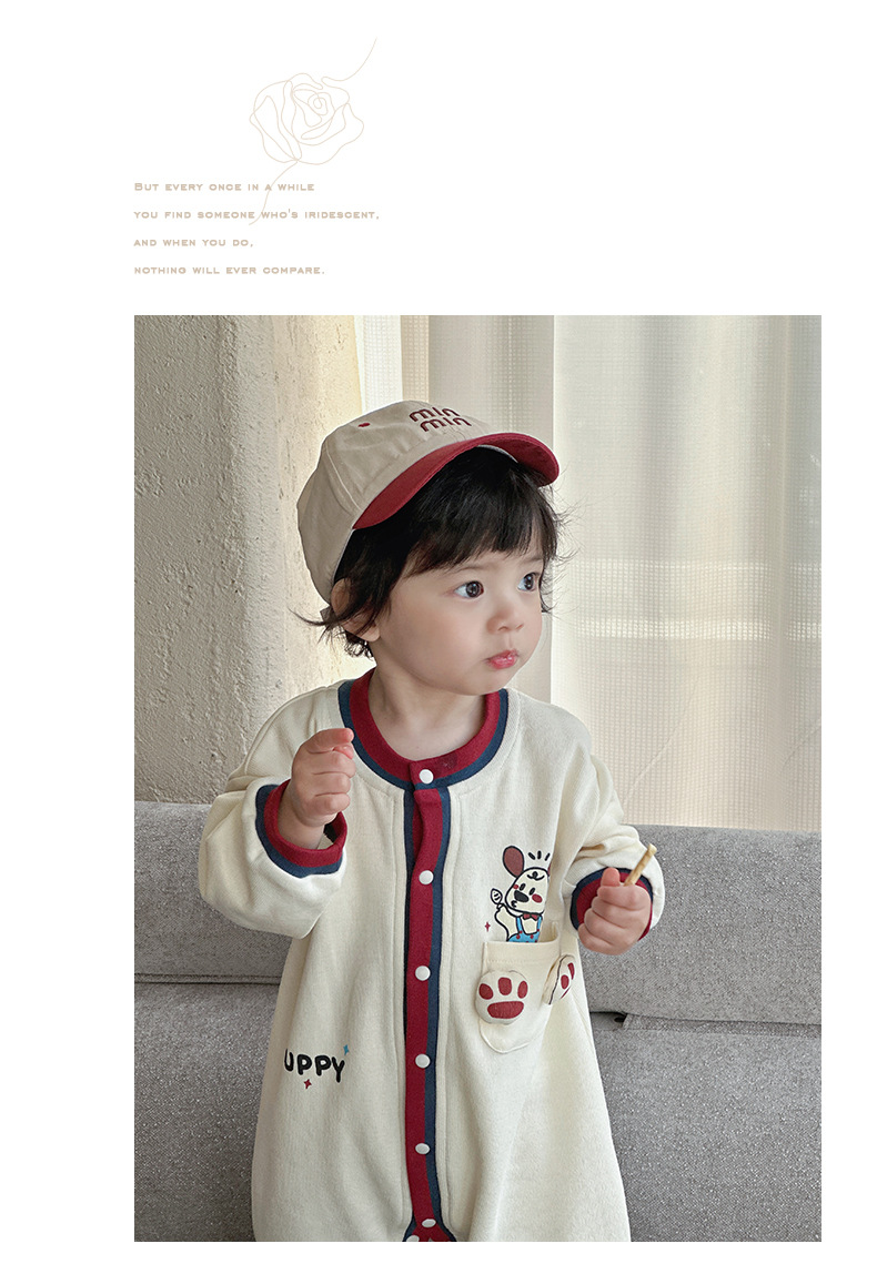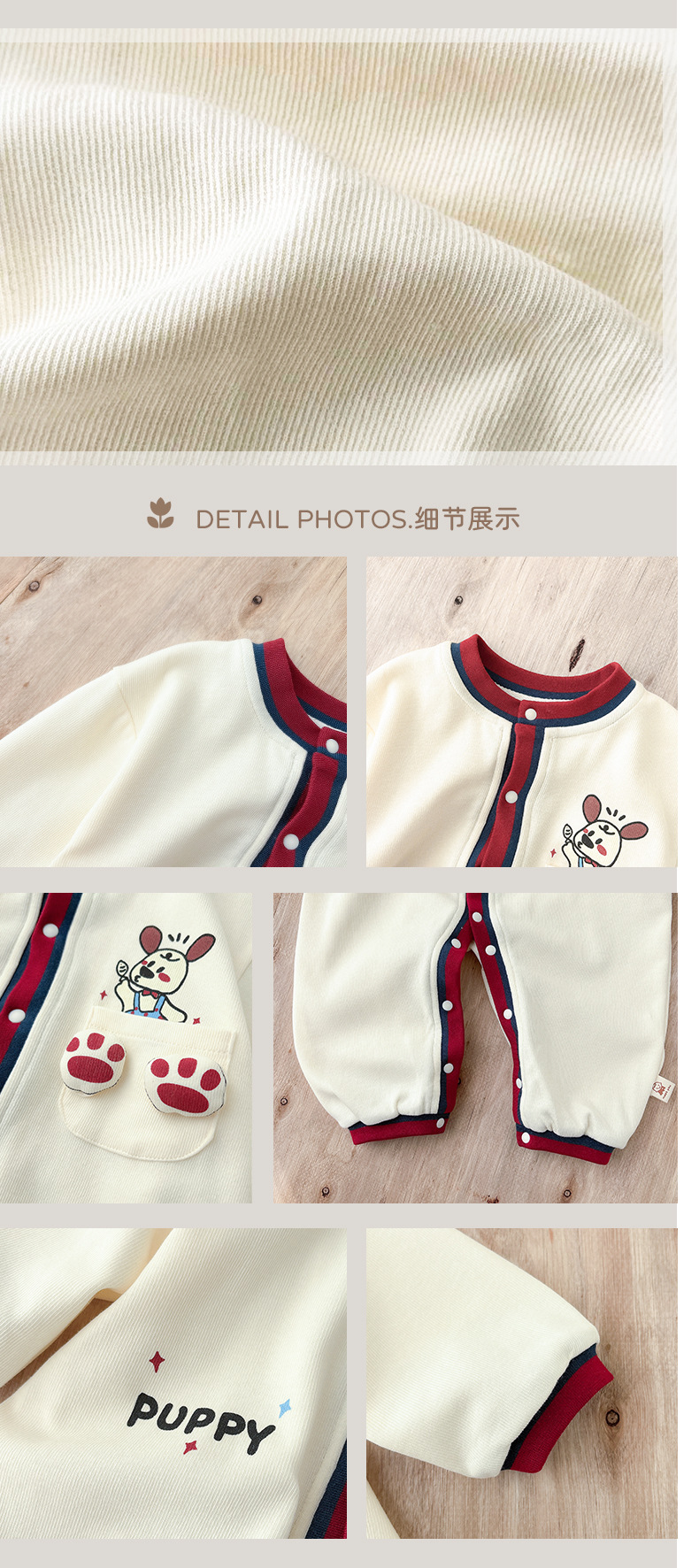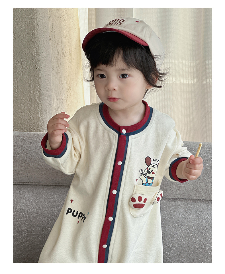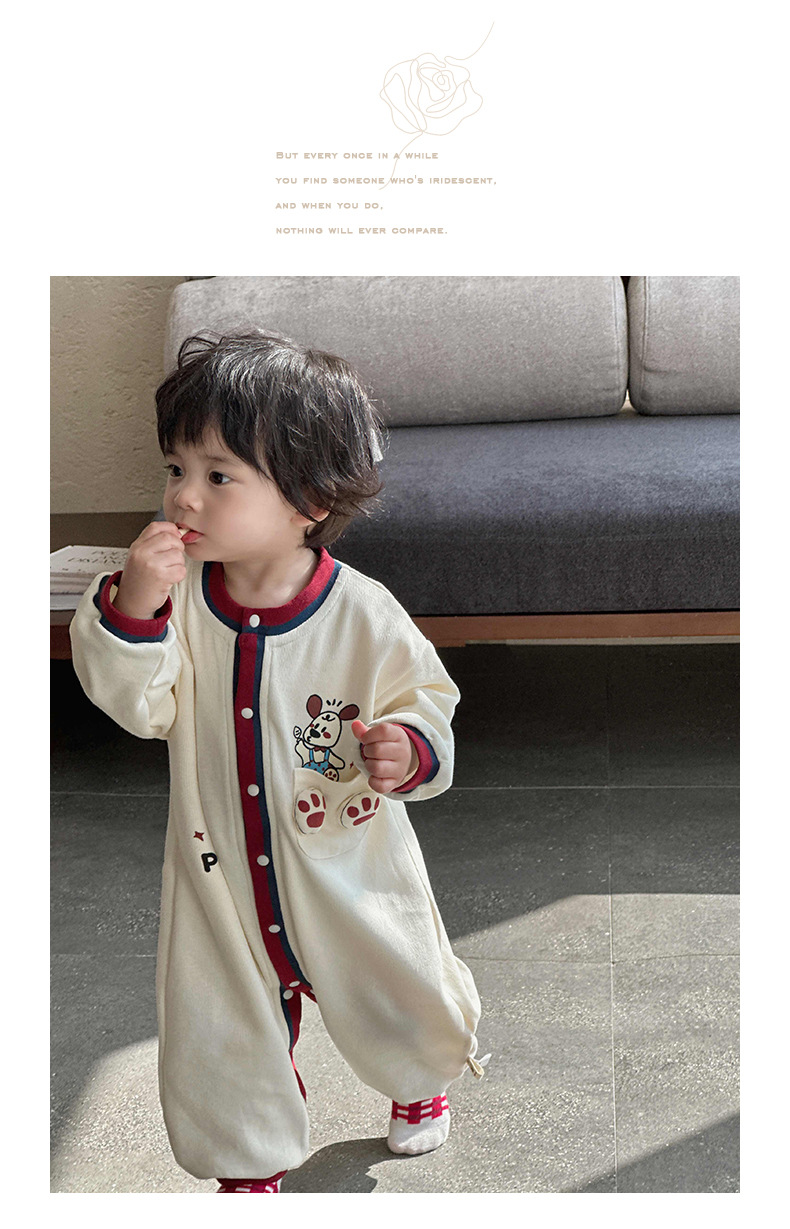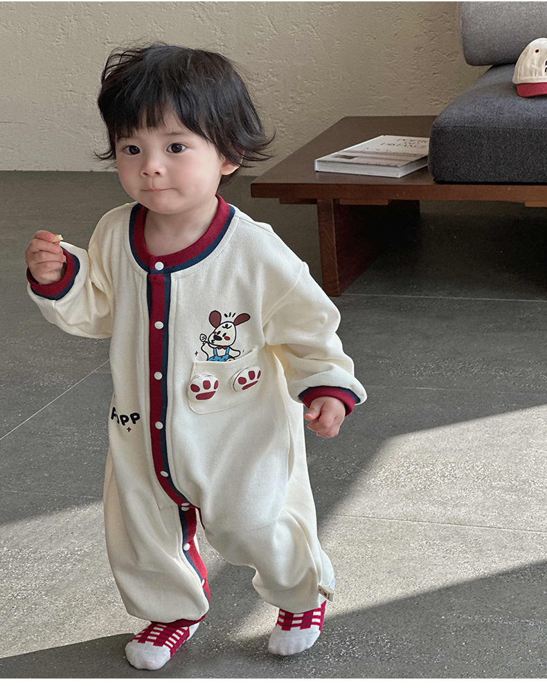 Nuevos productos en la primavera de 2025, ropa de una pieza para bebés masculinos coreanos, bolsillo, huellas de patas de perro, ropa de gatear para bebés y niños pequeños de estilo occidental