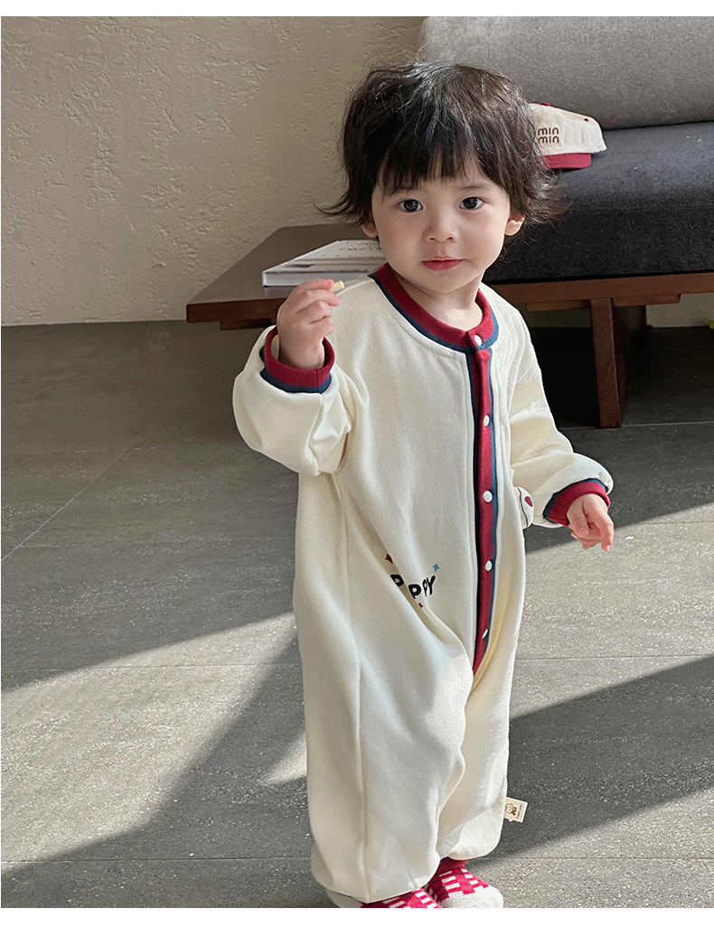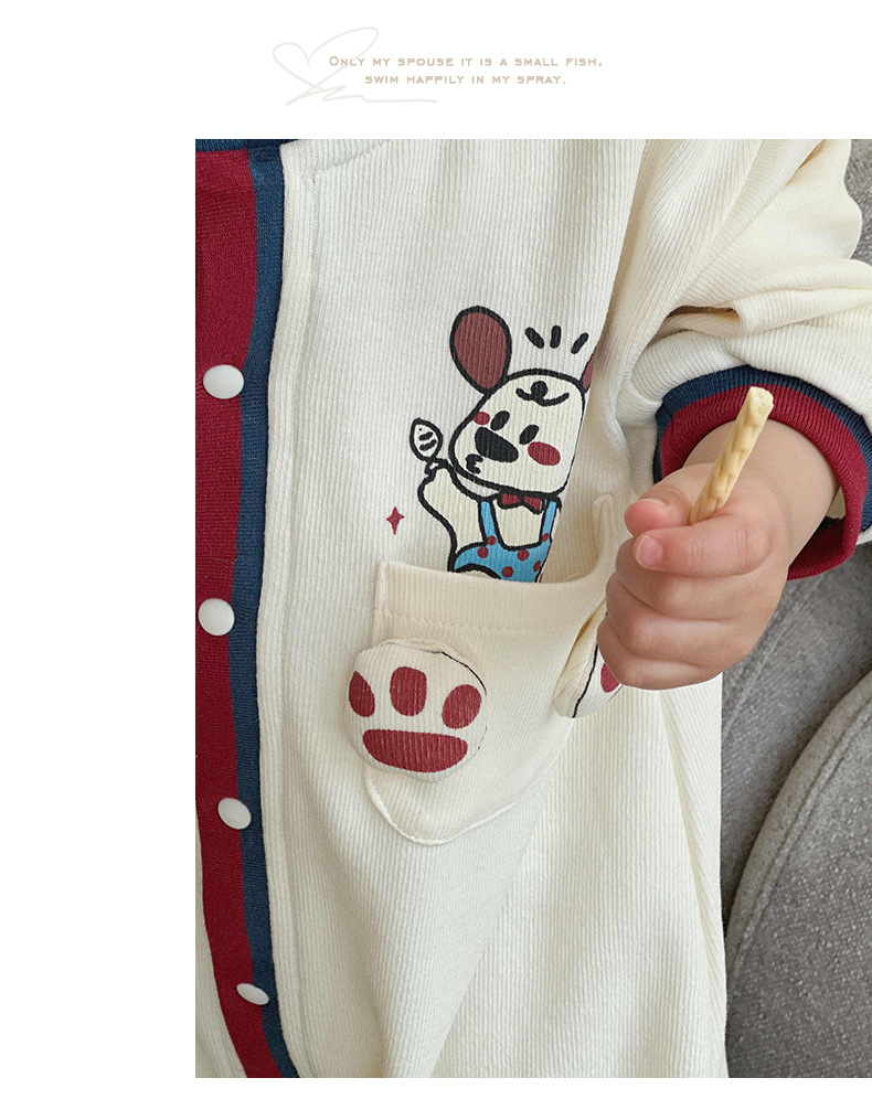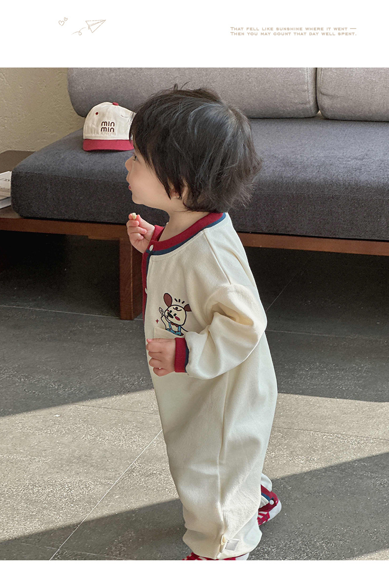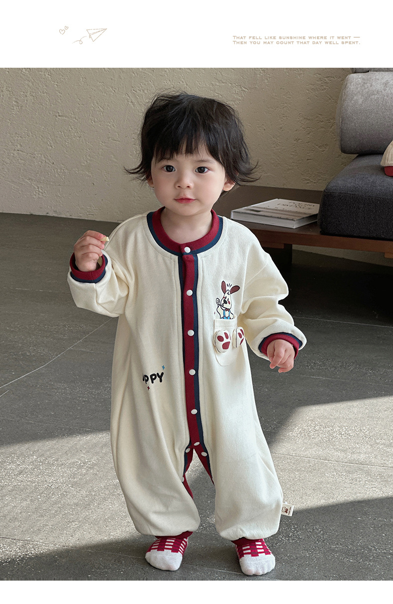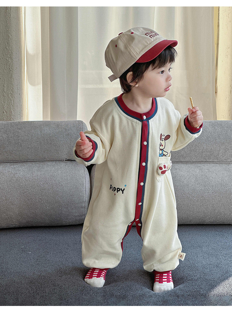 Nuevos productos en la primavera de 2025, ropa de una pieza para bebés masculinos coreanos, bolsillo, huellas de patas de perro, ropa de gatear para bebés y niños pequeños de estilo occidental