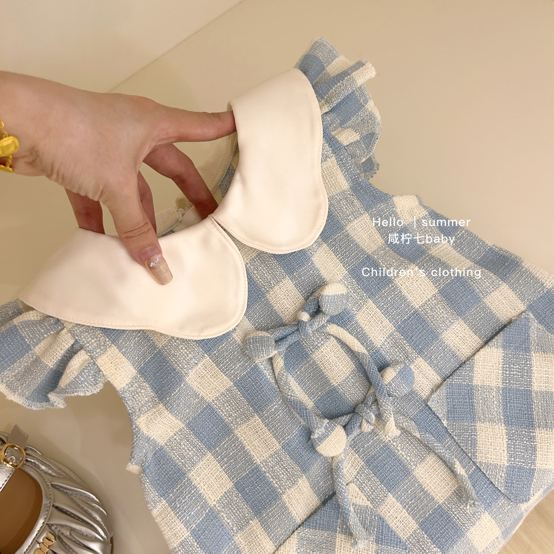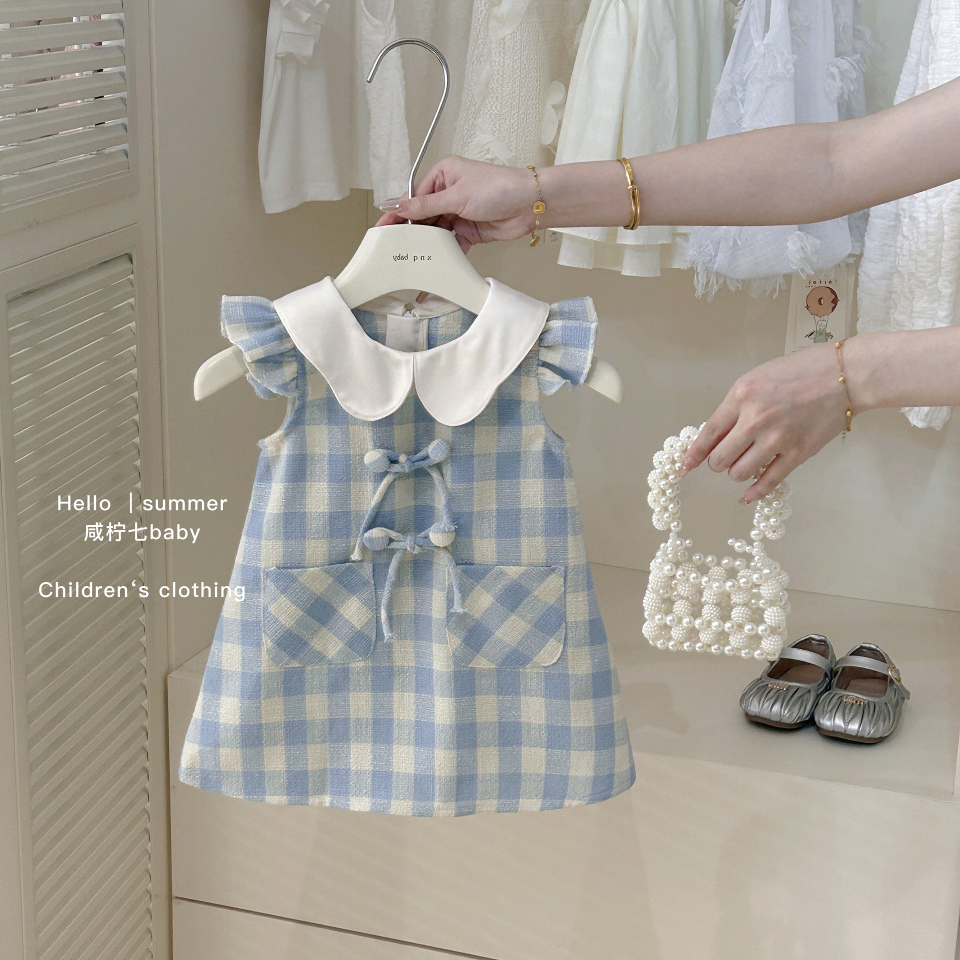 Vestido francés de niñas verano de niños chaleco azul cuadrado vestido de cuello de muñeca vestido de princesa dulce