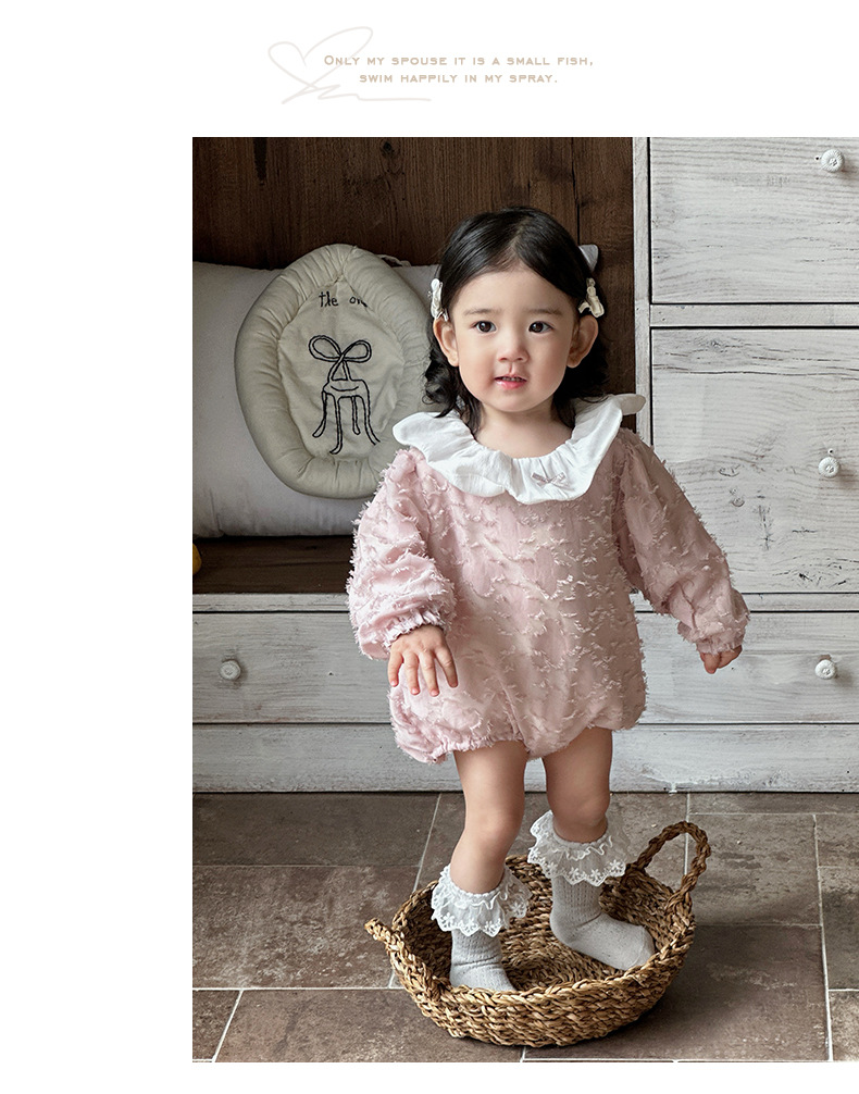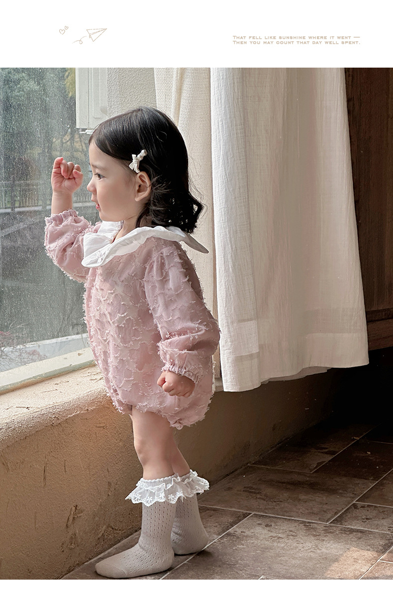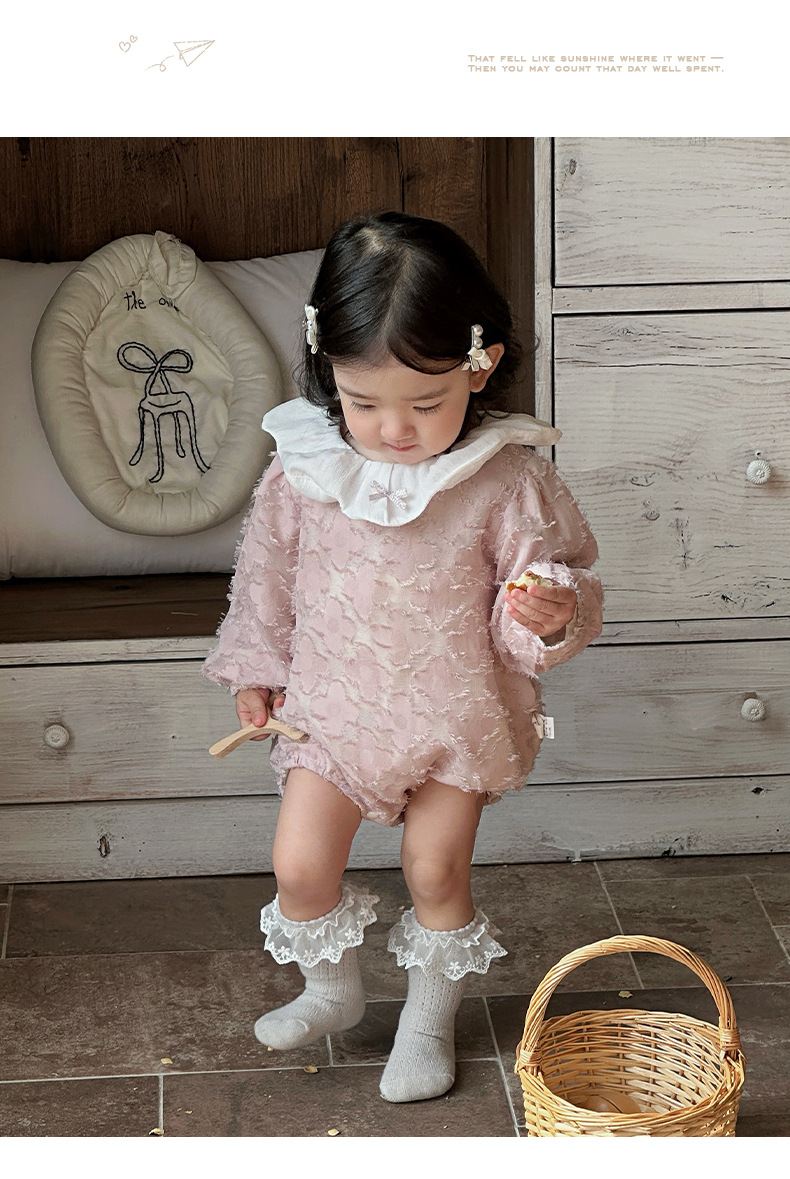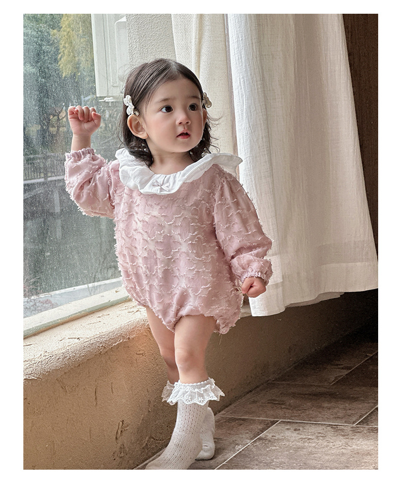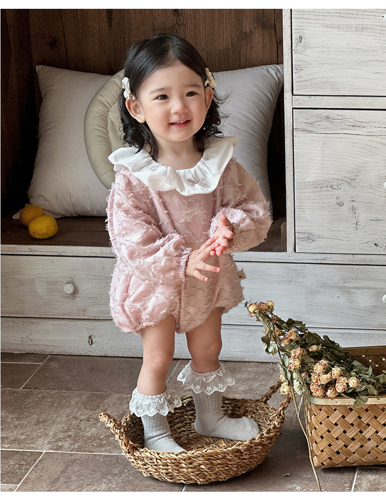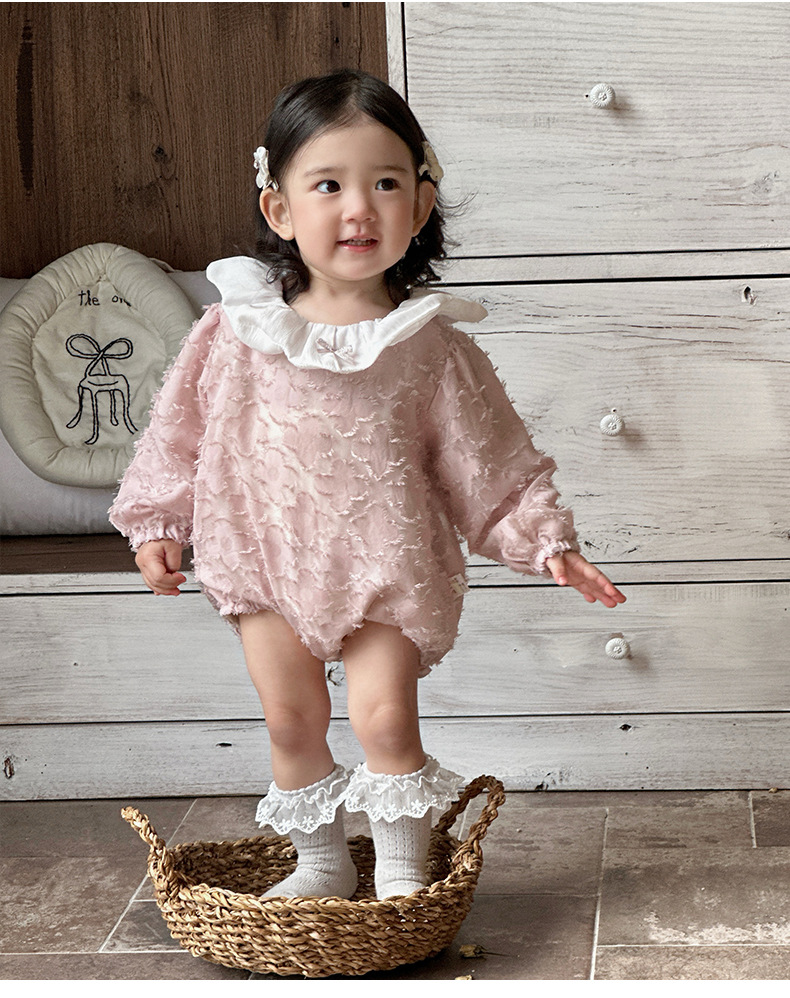 2025 bebé bebé primavera ropa para niños dulce rosa manga larga culo super lindo encaje solapa triángulo mameluco