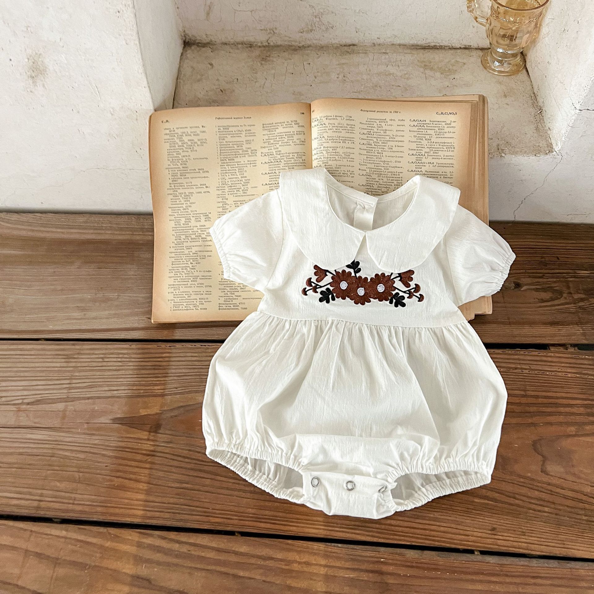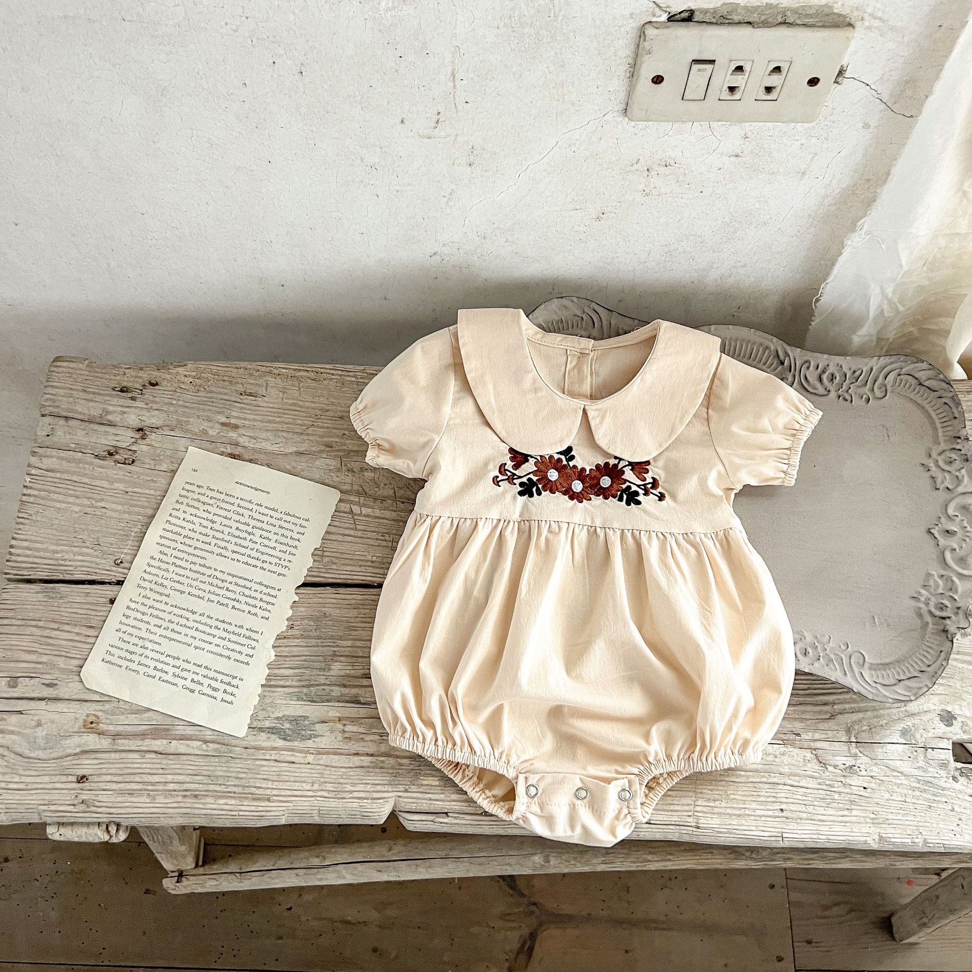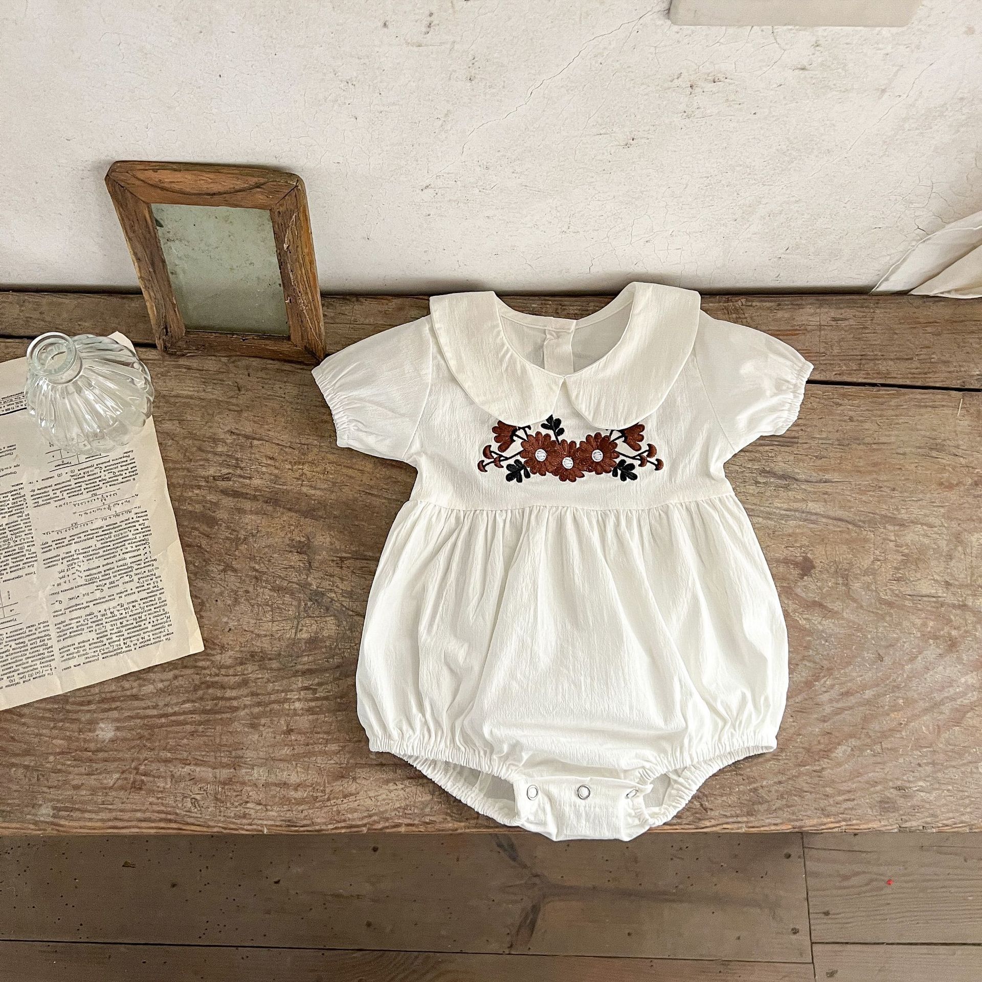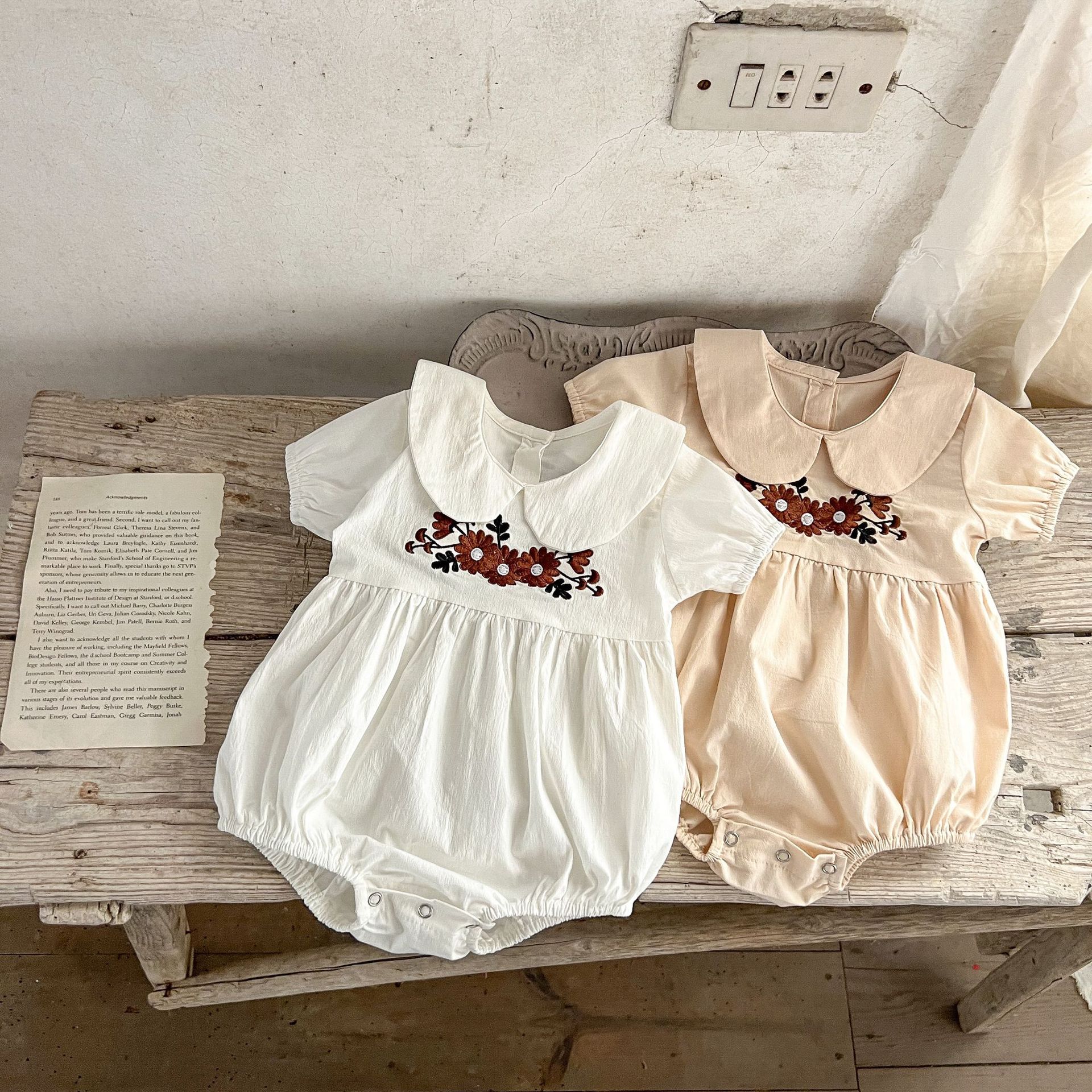 2023 nuevo estilo coreano niñas bebé muñeca collar bordado mameluco ins recién nacido algodón suelta manga corta mameluco