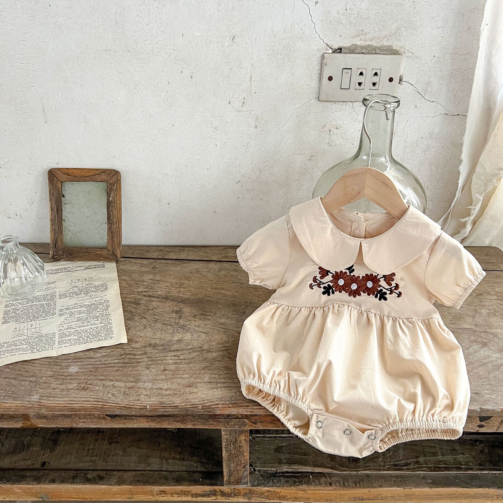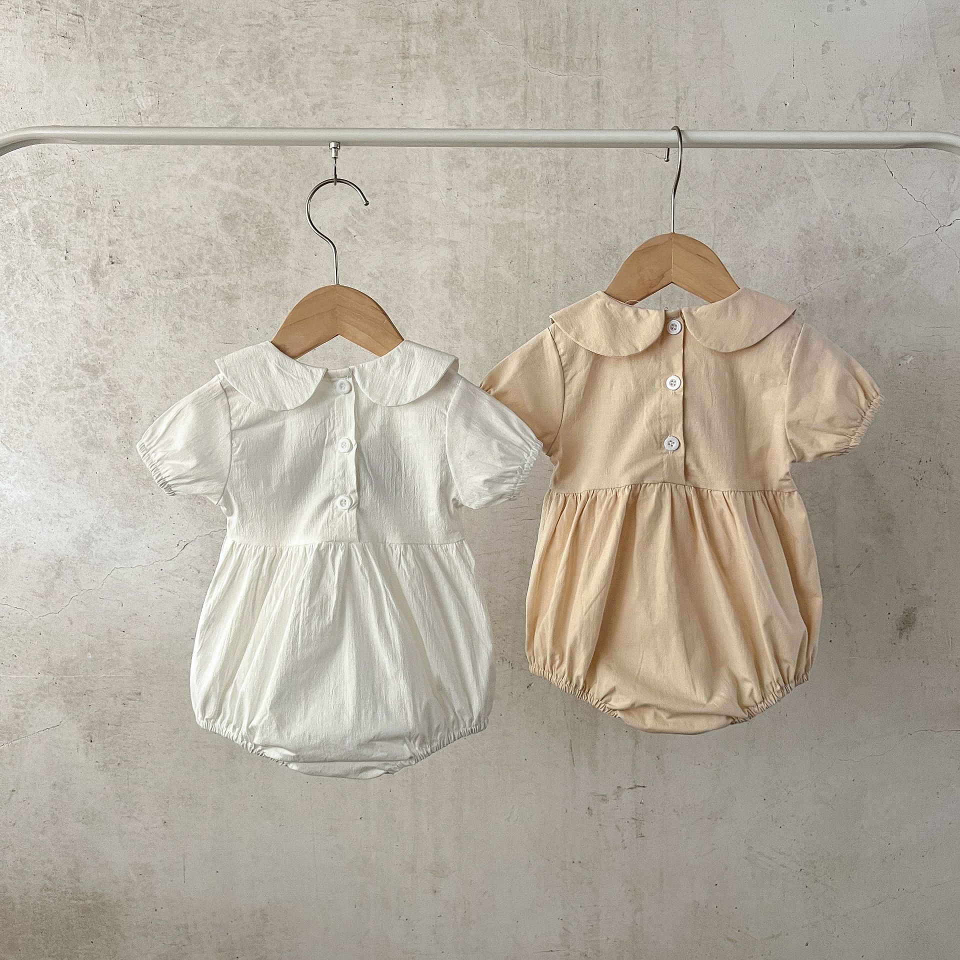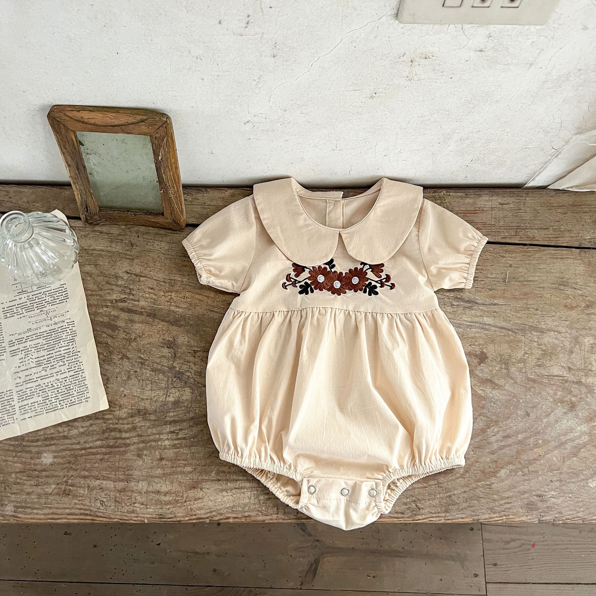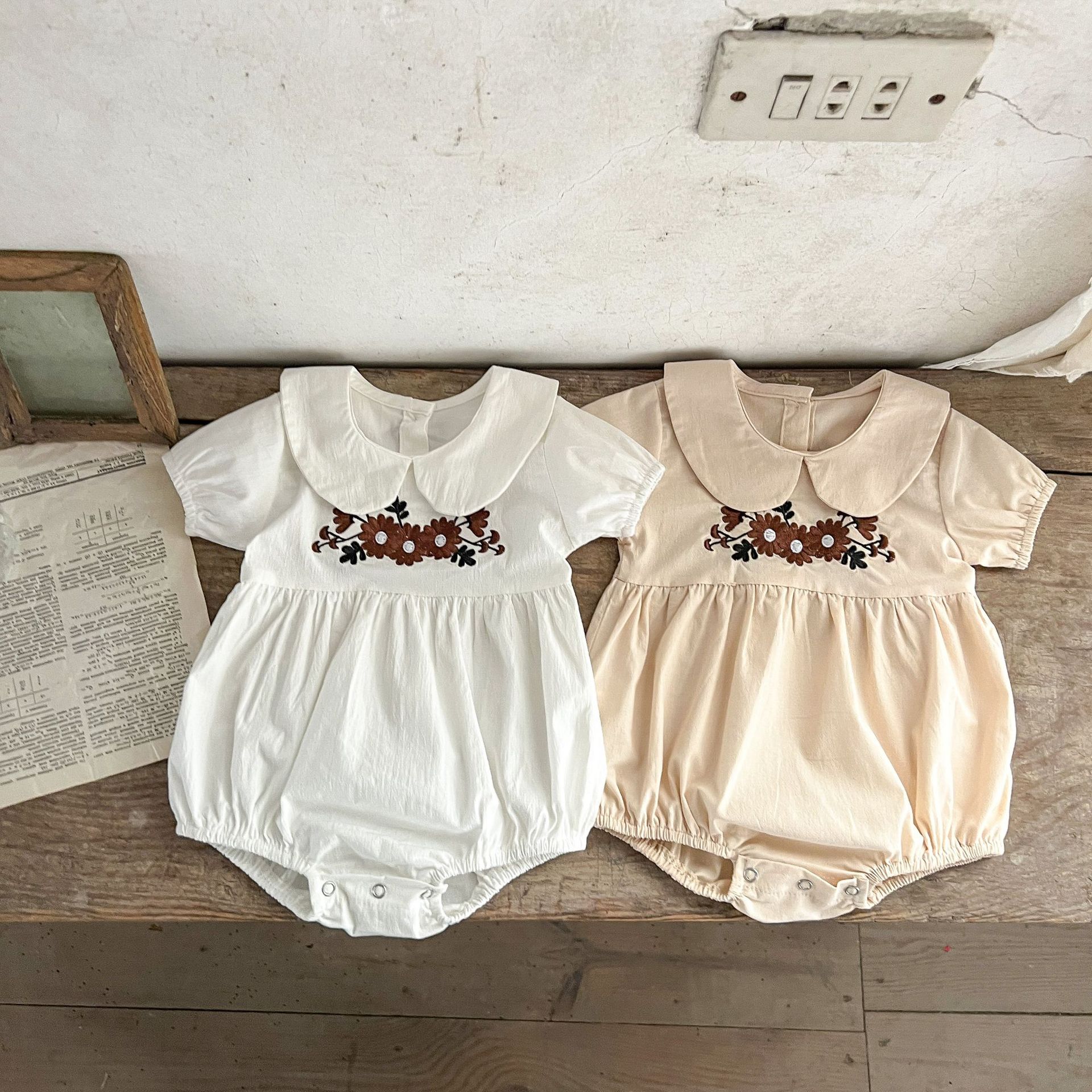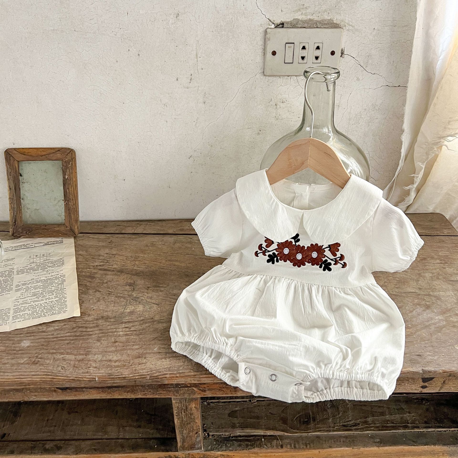 2023 nuevo estilo coreano niñas bebé muñeca collar bordado mameluco ins recién nacido algodón suelta manga corta mameluco