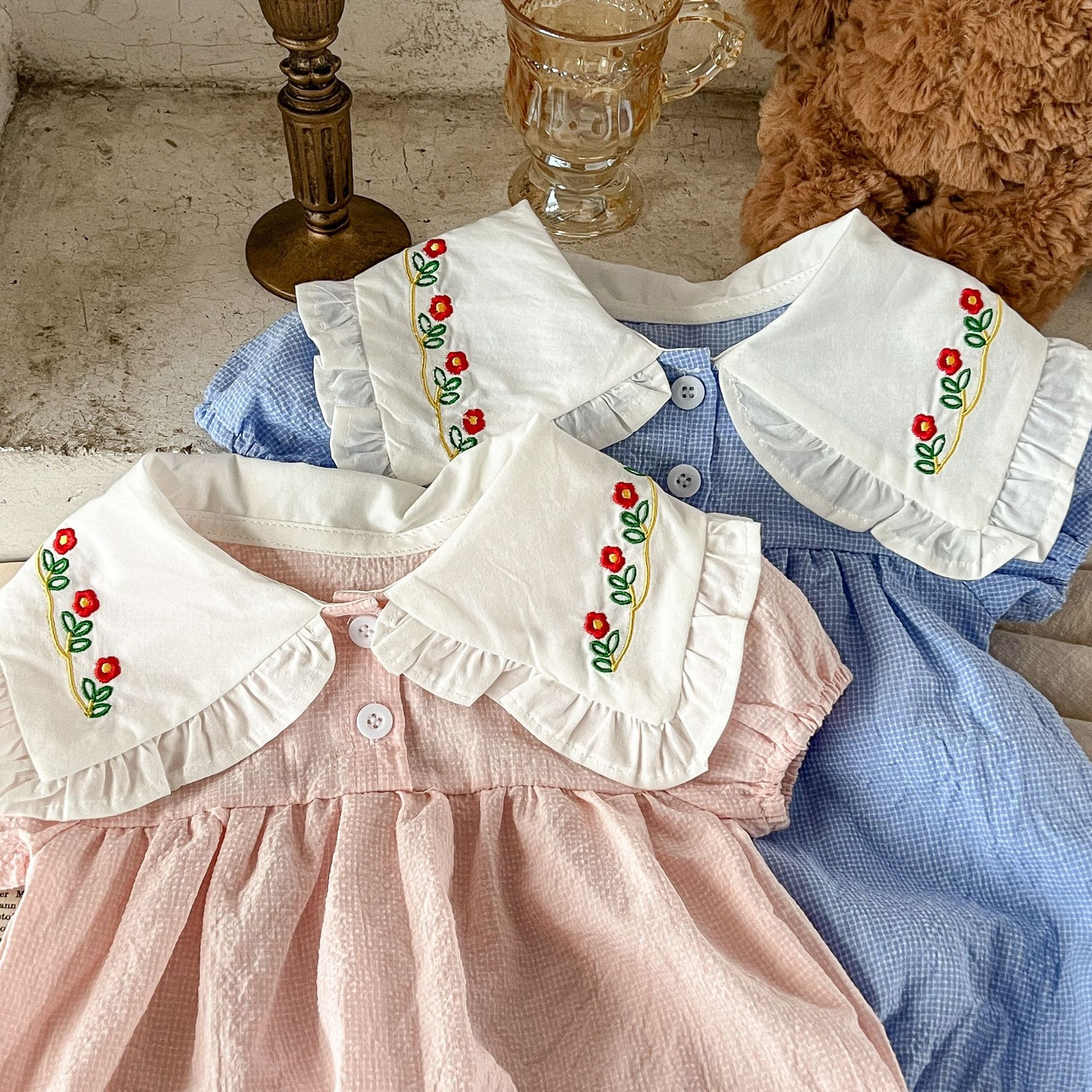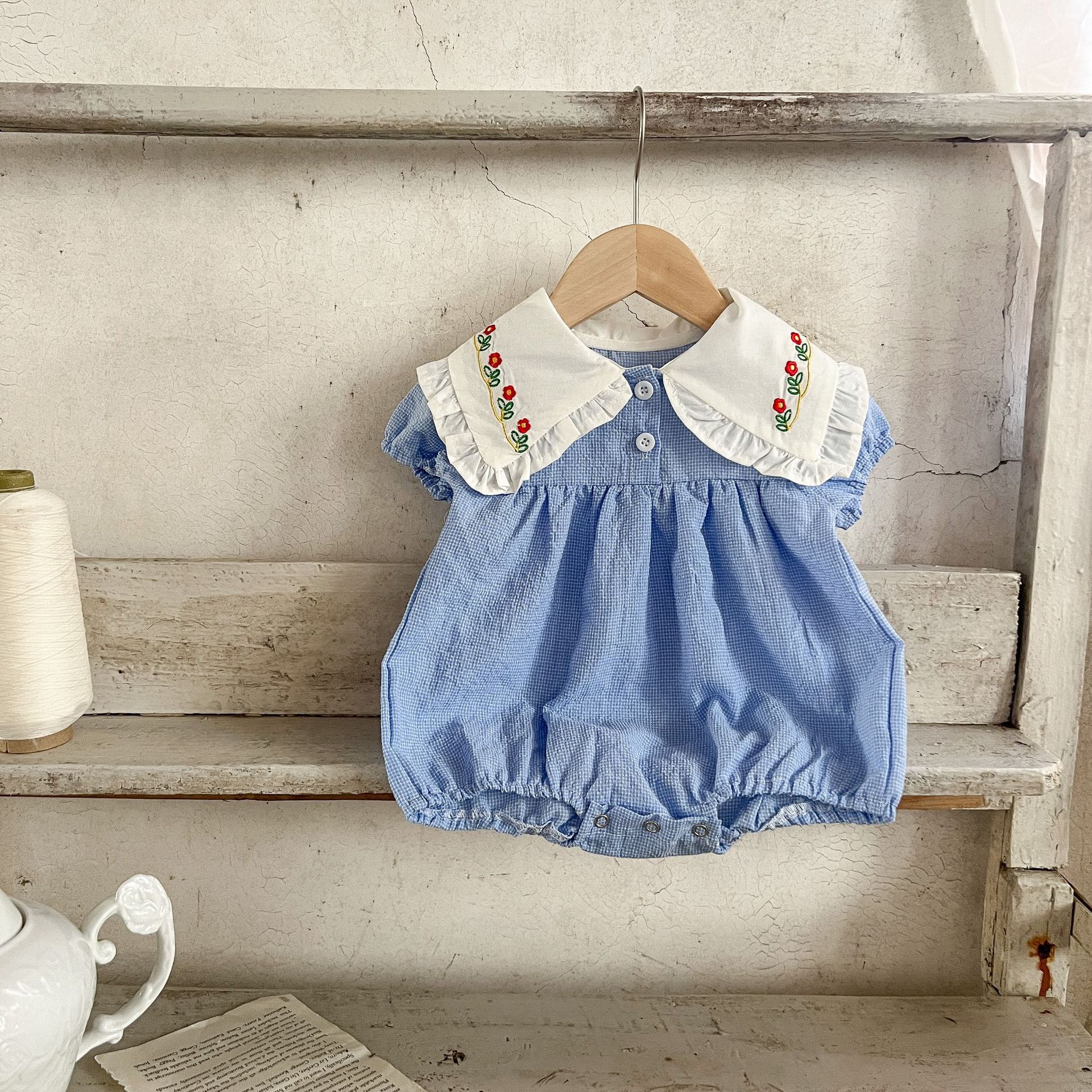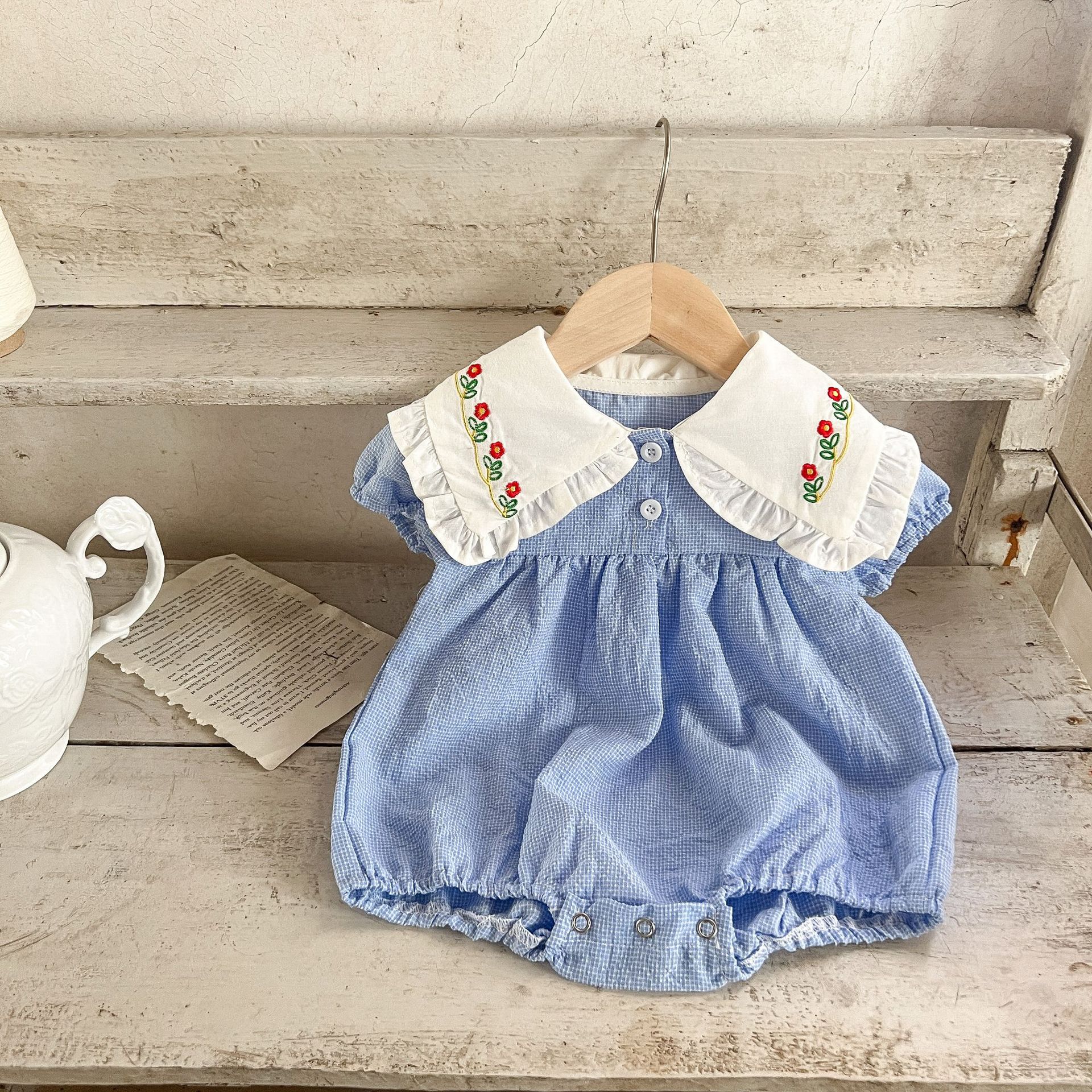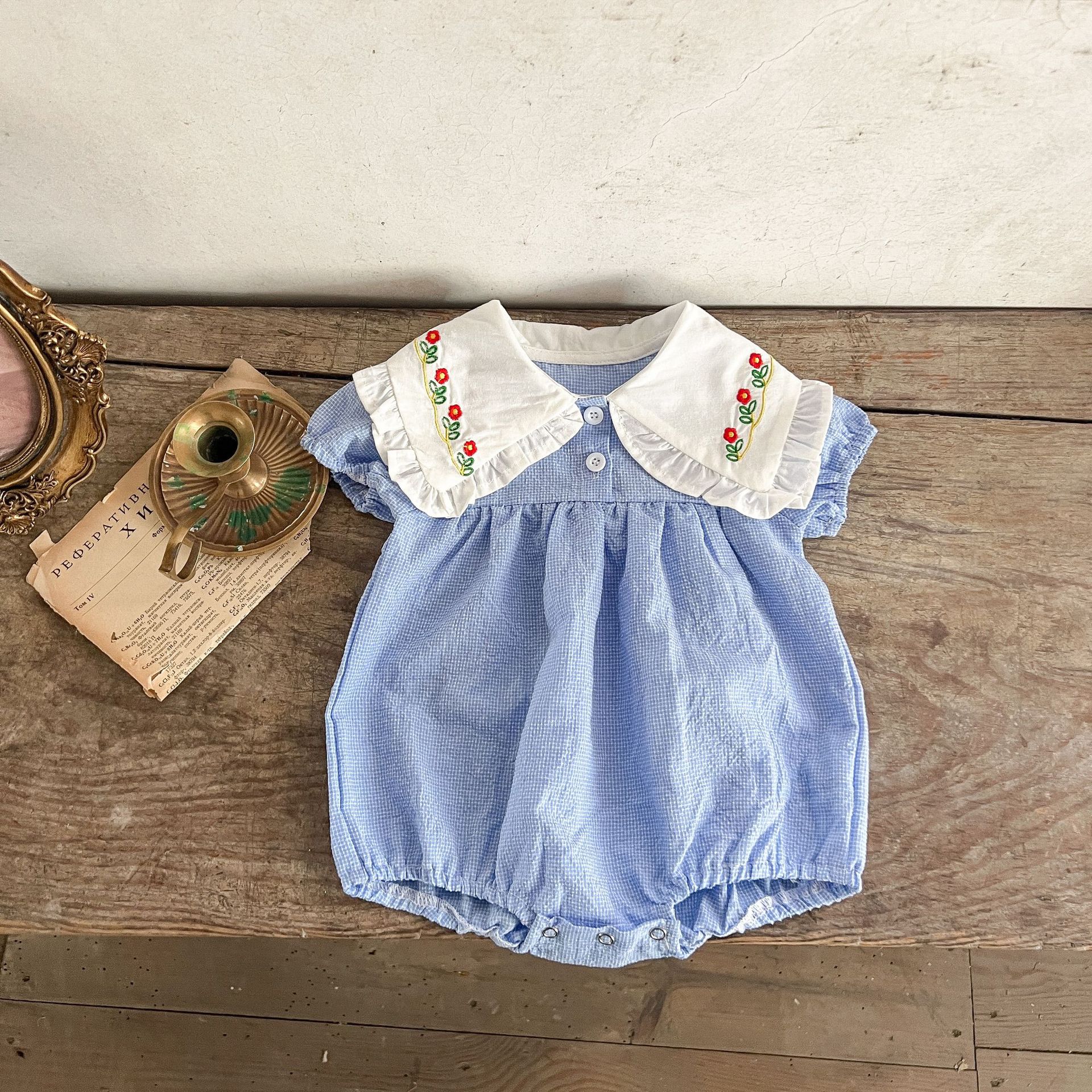 Estilo coreano niñas bebé verano algodón a cuadros solapa bordado de manga corta mameluco ins recién nacido casual triángulo escalada