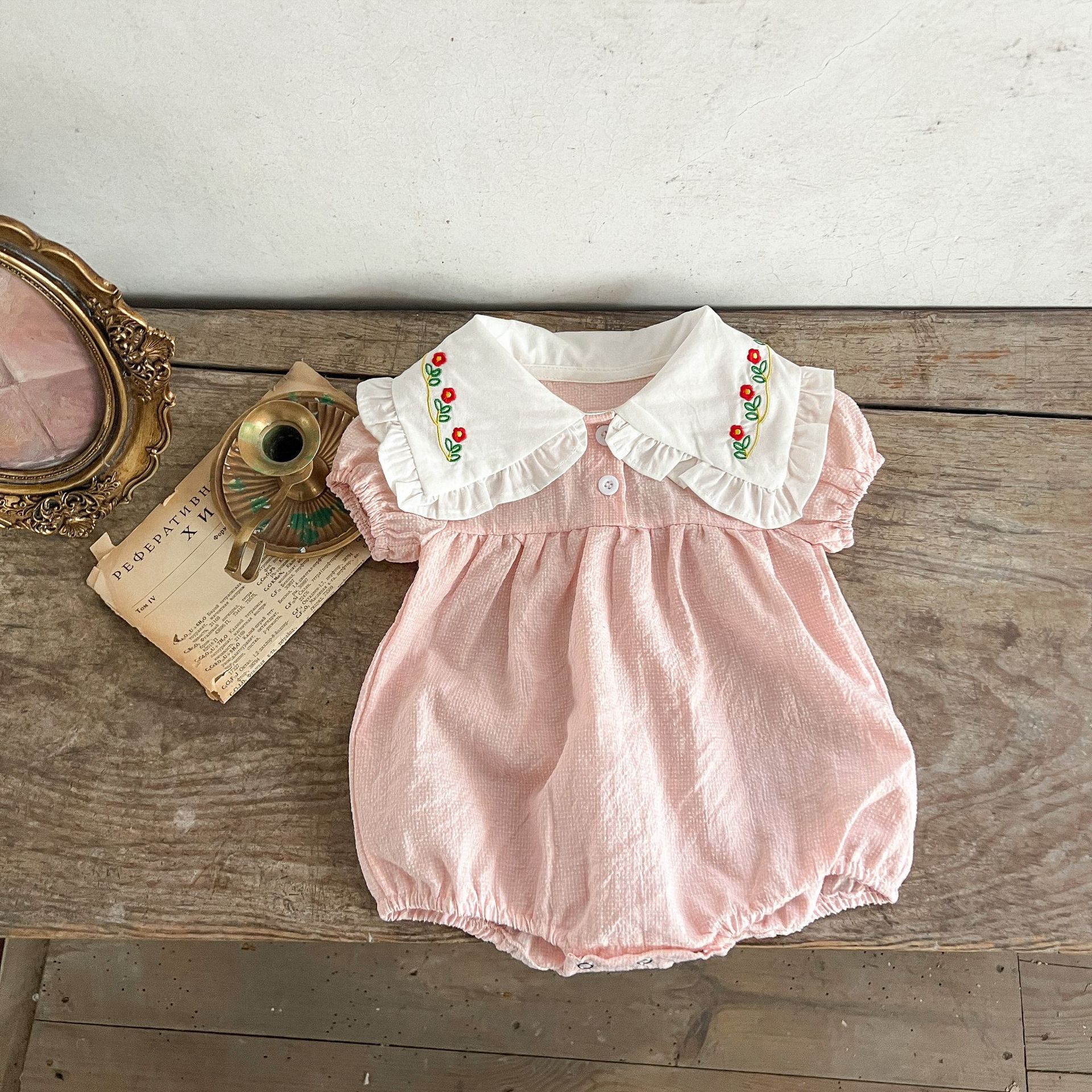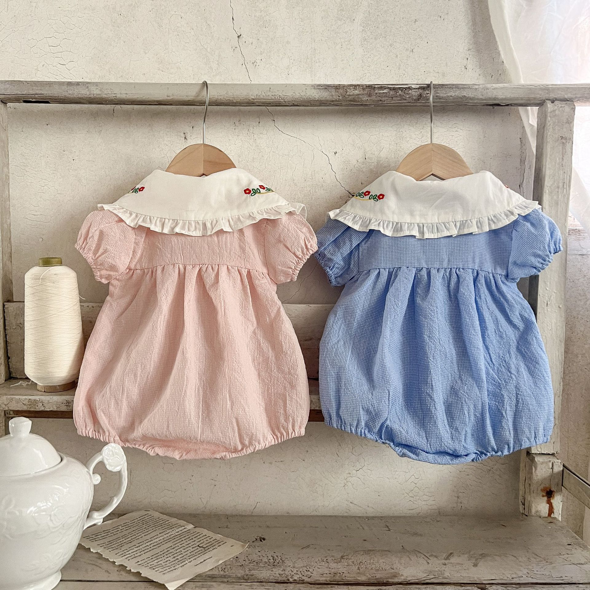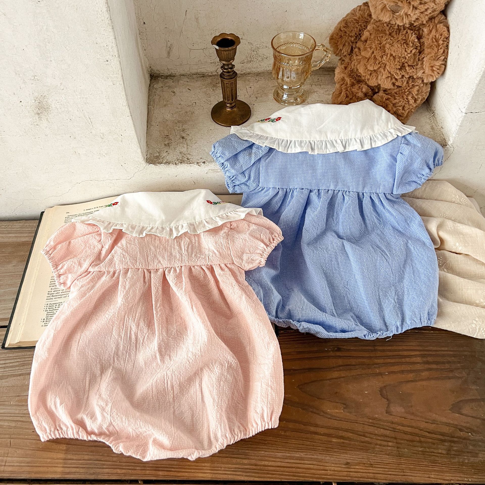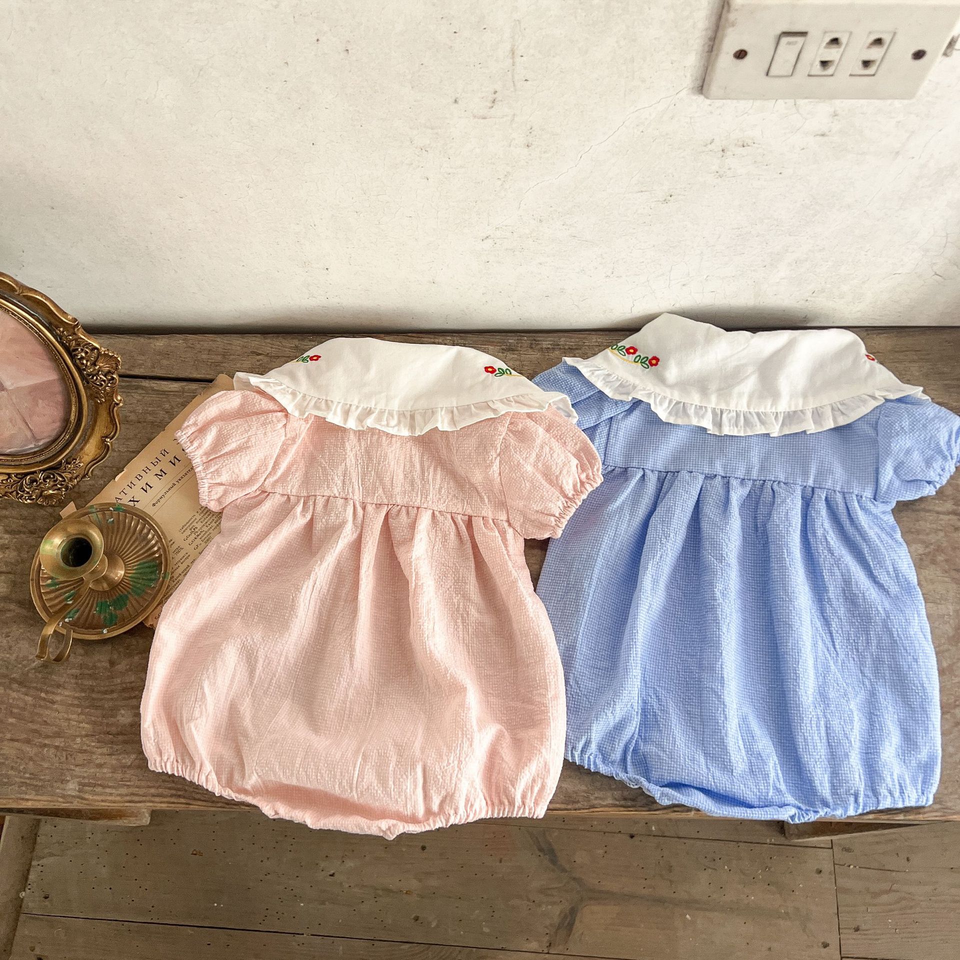 Estilo coreano niñas bebé verano algodón a cuadros solapa bordado de manga corta mameluco ins recién nacido casual triángulo escalada