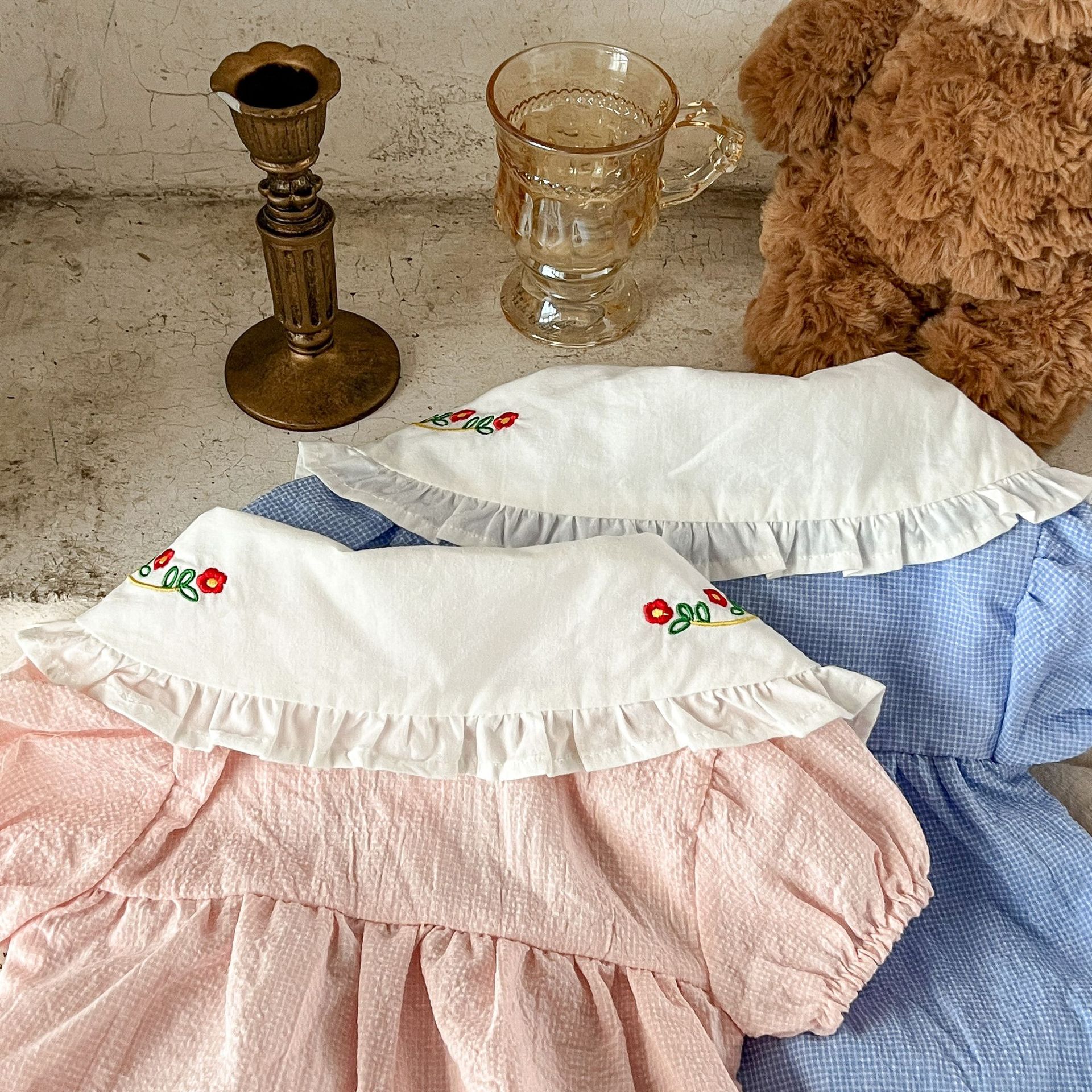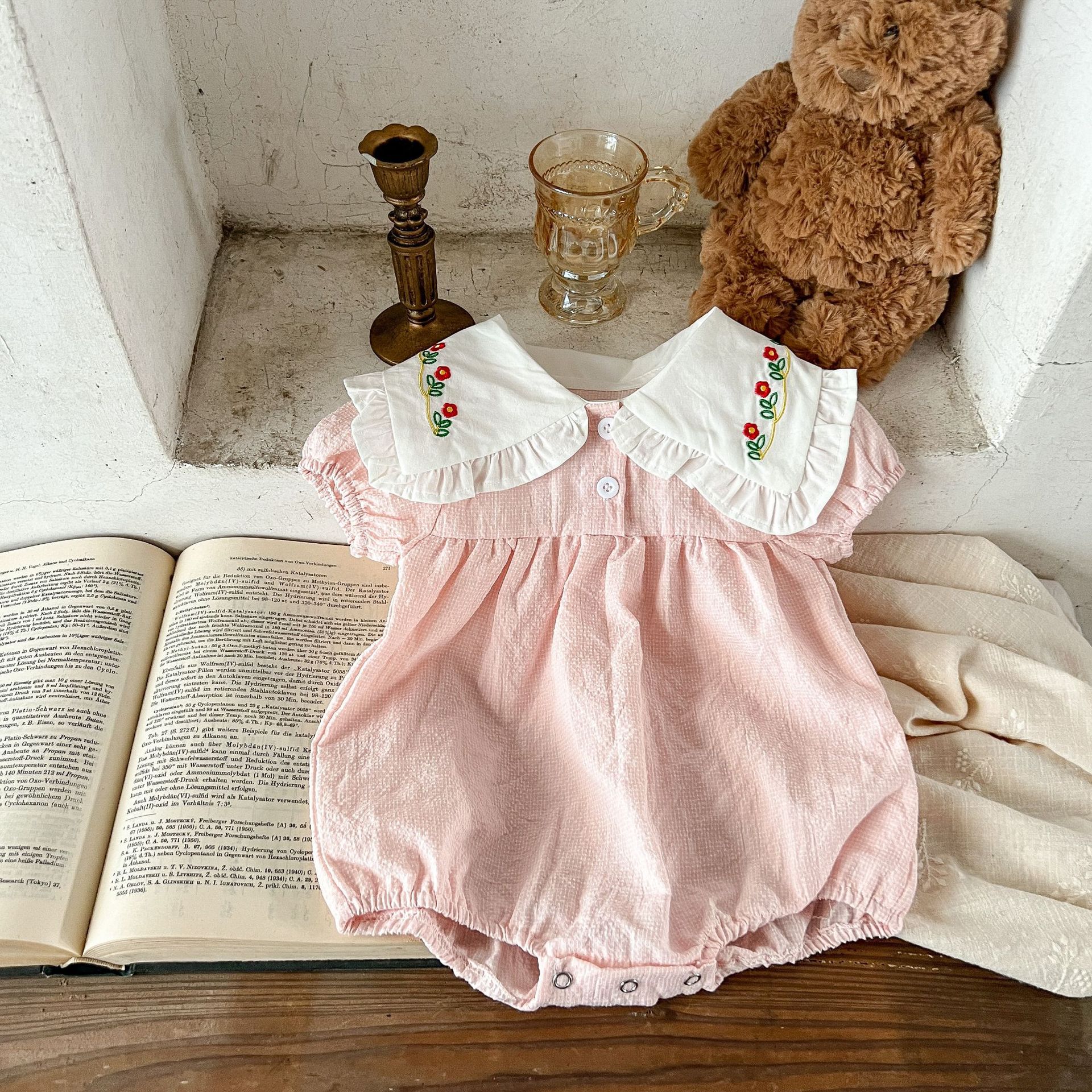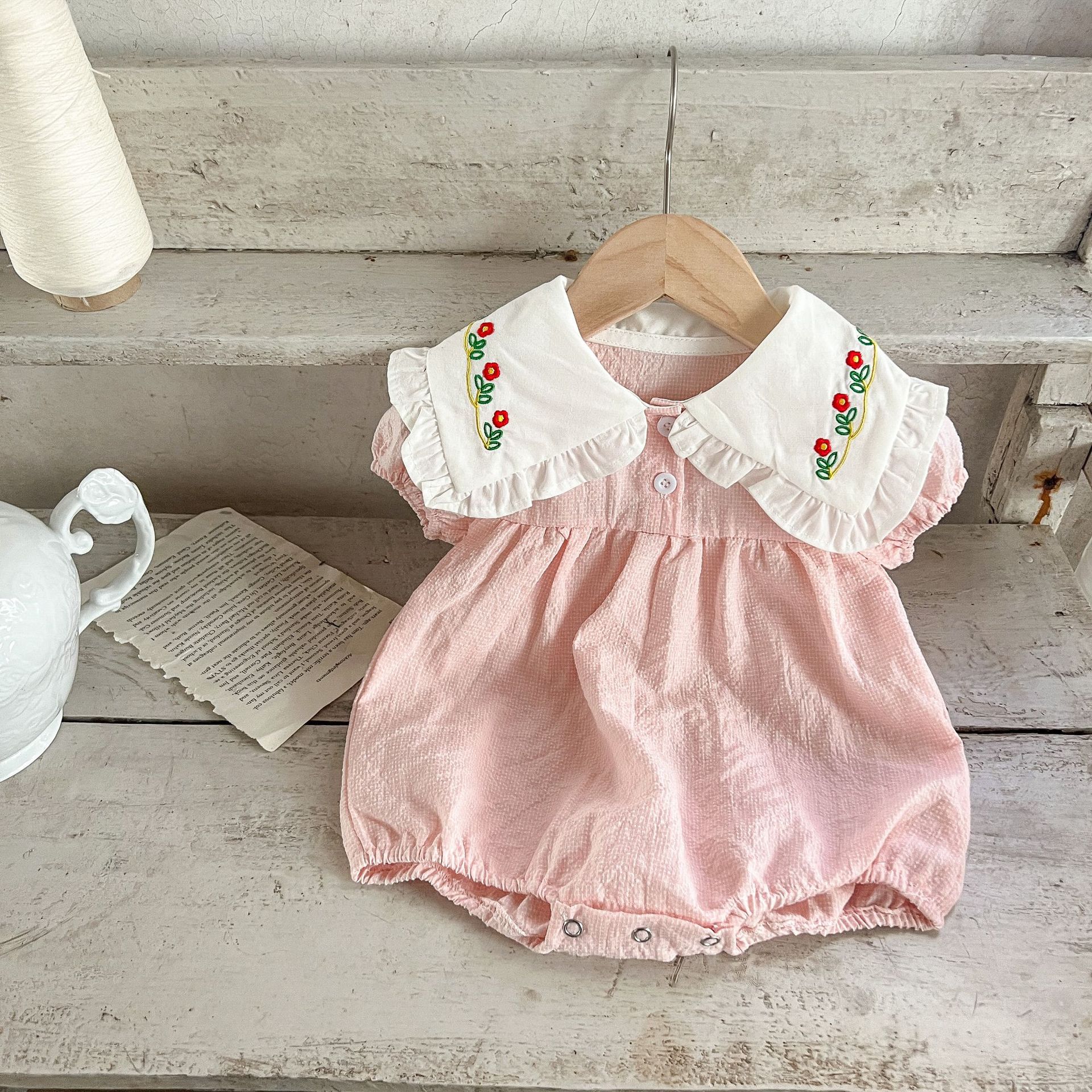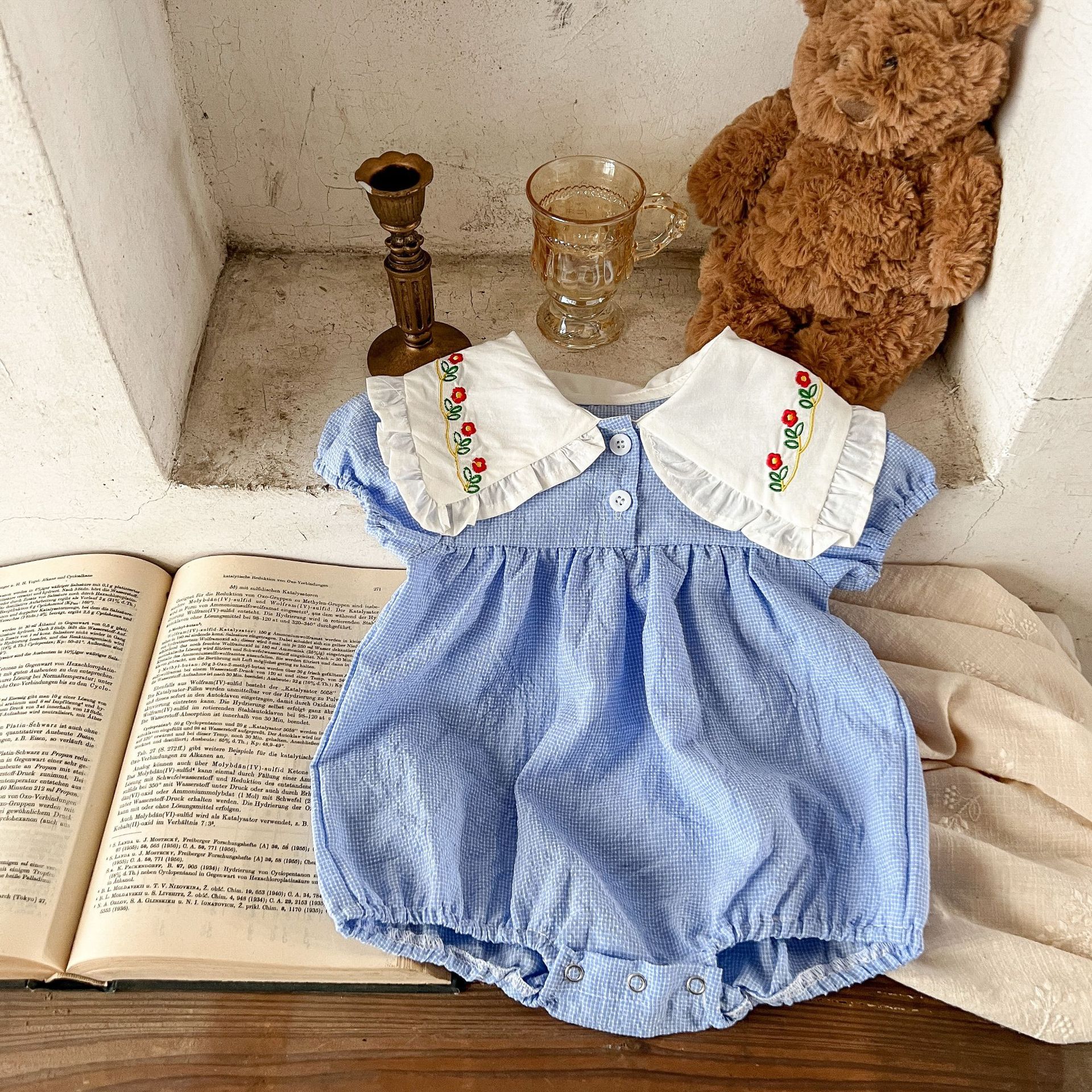 Estilo coreano niñas bebé verano algodón a cuadros solapa bordado de manga corta mameluco ins recién nacido casual triángulo escalada