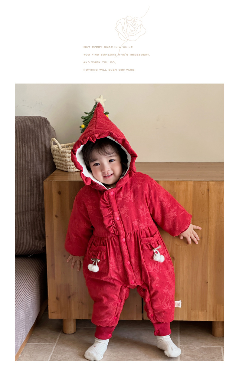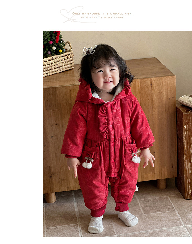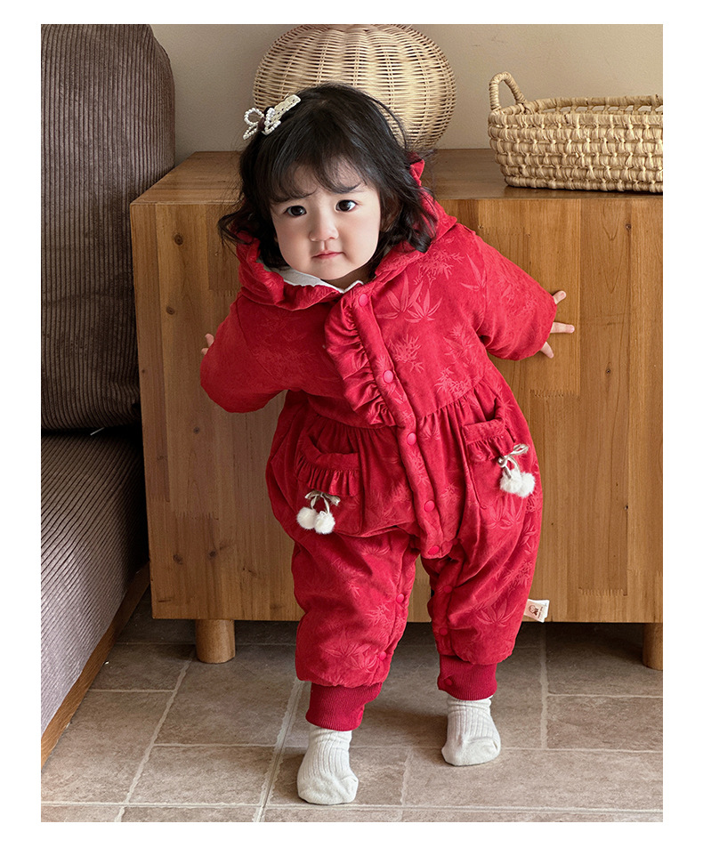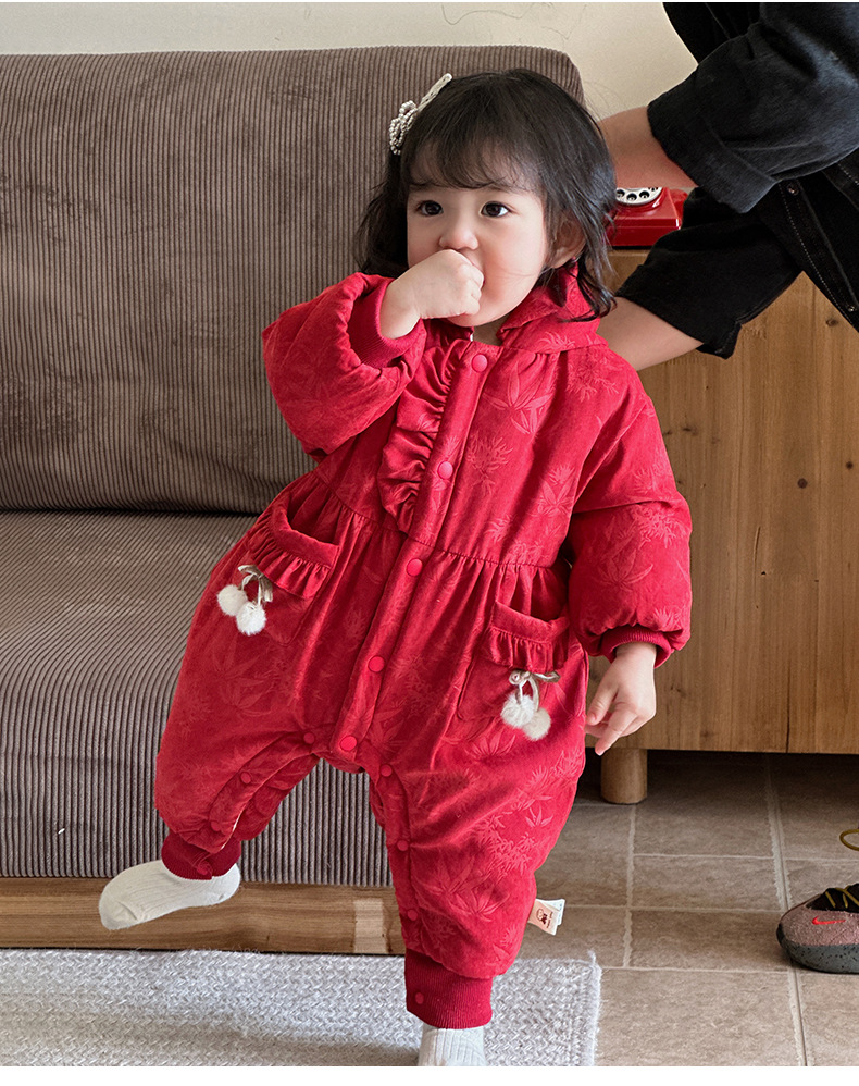 2024 nuevo producto de invierno mono de bebé lindo bolsillo de cereza grueso cálido y cómodo vestido de salida con capucha mamelero